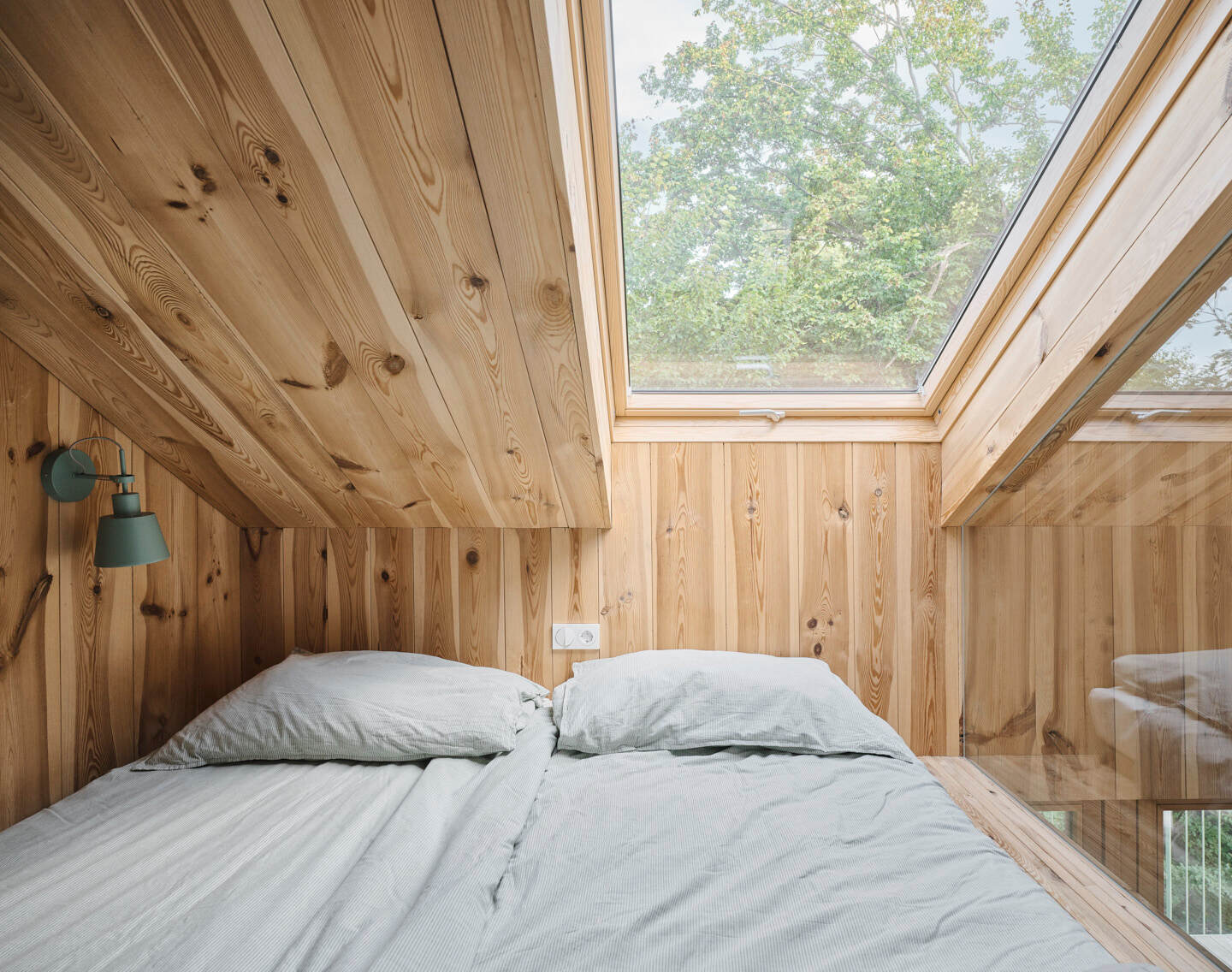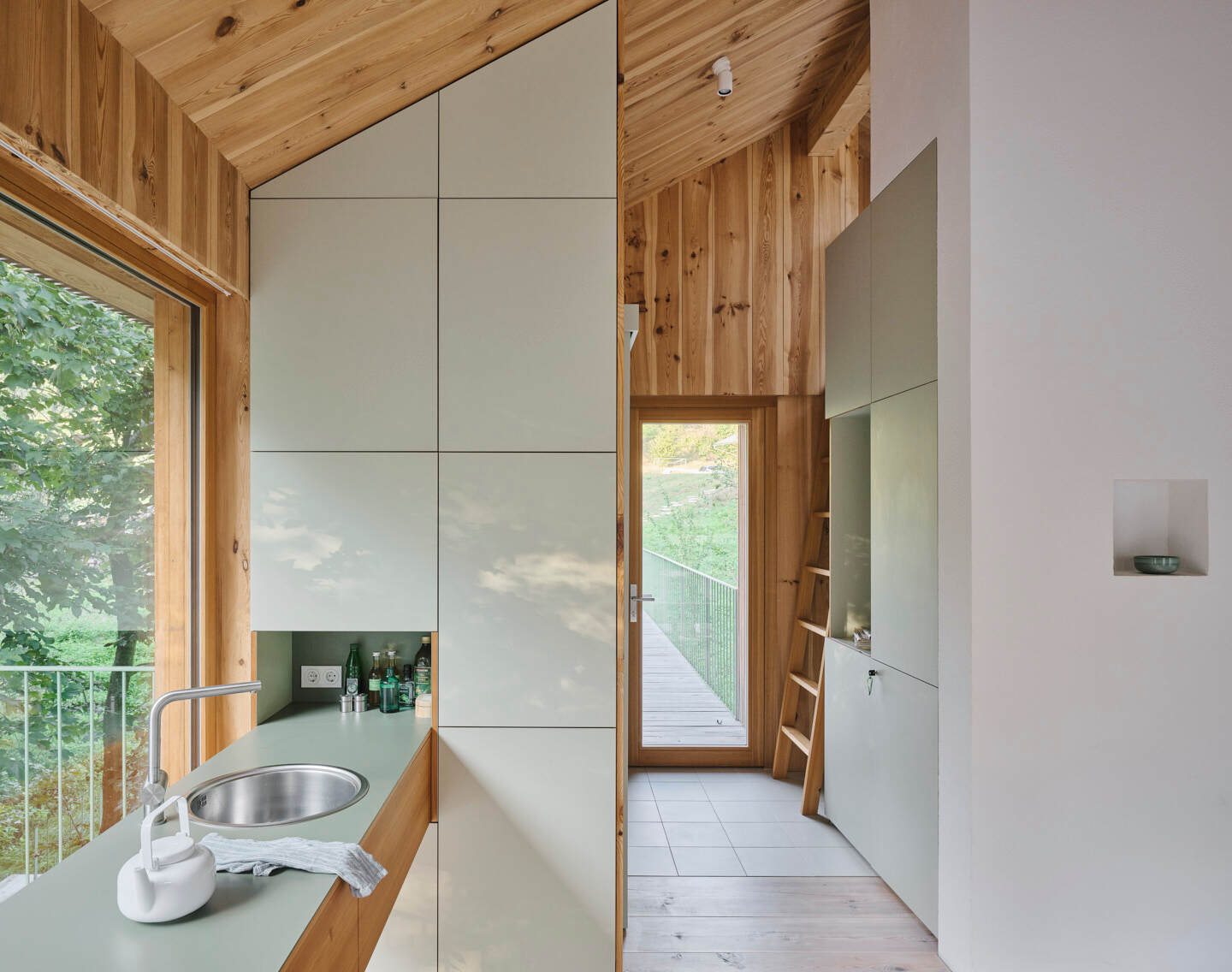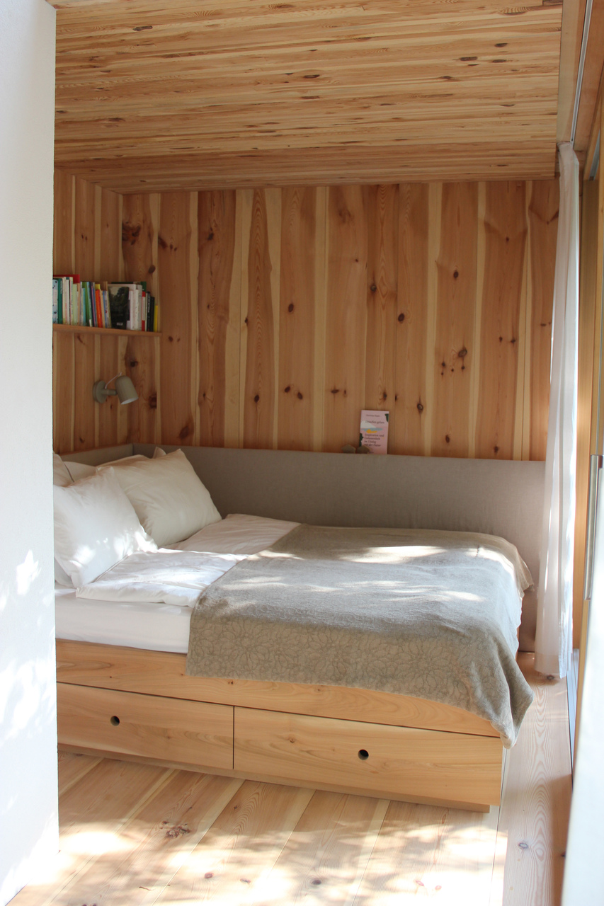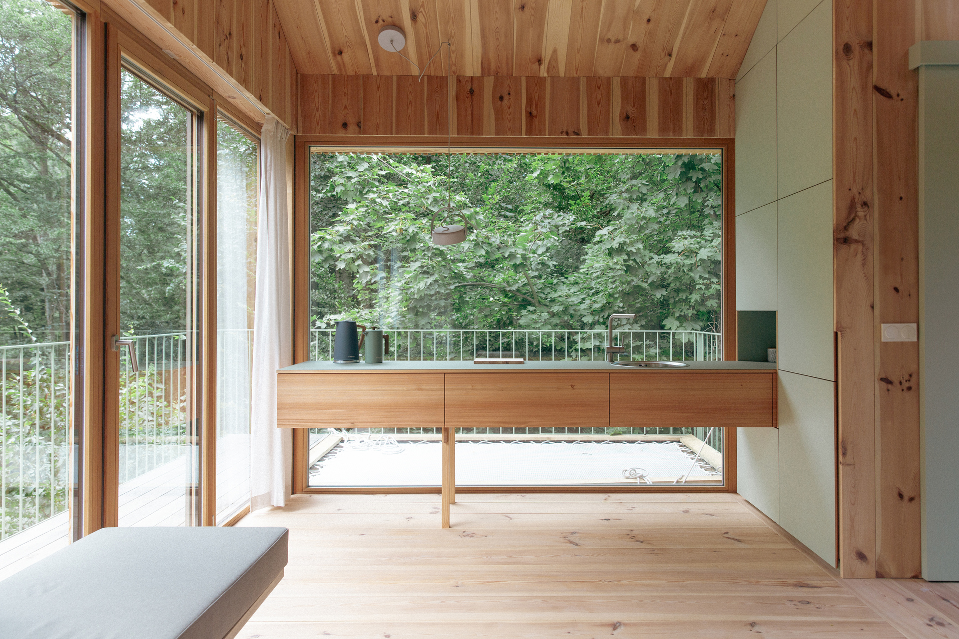 Natürliche Holzoberflächen prägen sowohl die Außenhülle als auch den Innenraum. Das Material stammt zum größten Teil aus dem umliegenden Wald, die Brettstapeldecken wurden von einem Betrieb in der Region lediglich mit Holznägeln gefügt. Auch bei den Stahlstützen, die das Haus und die Brücke tragen, wurde auf schlichte Fügung geachtet. Ihr blassgrüner Farbton findet sich auf vielen Oberflächen im Innern wieder und spielt mit der sich übers Jahr wandelnden Farbpalette der Umgebung. (Autor: Achim Geissinger, nach einem Text der Architekten)