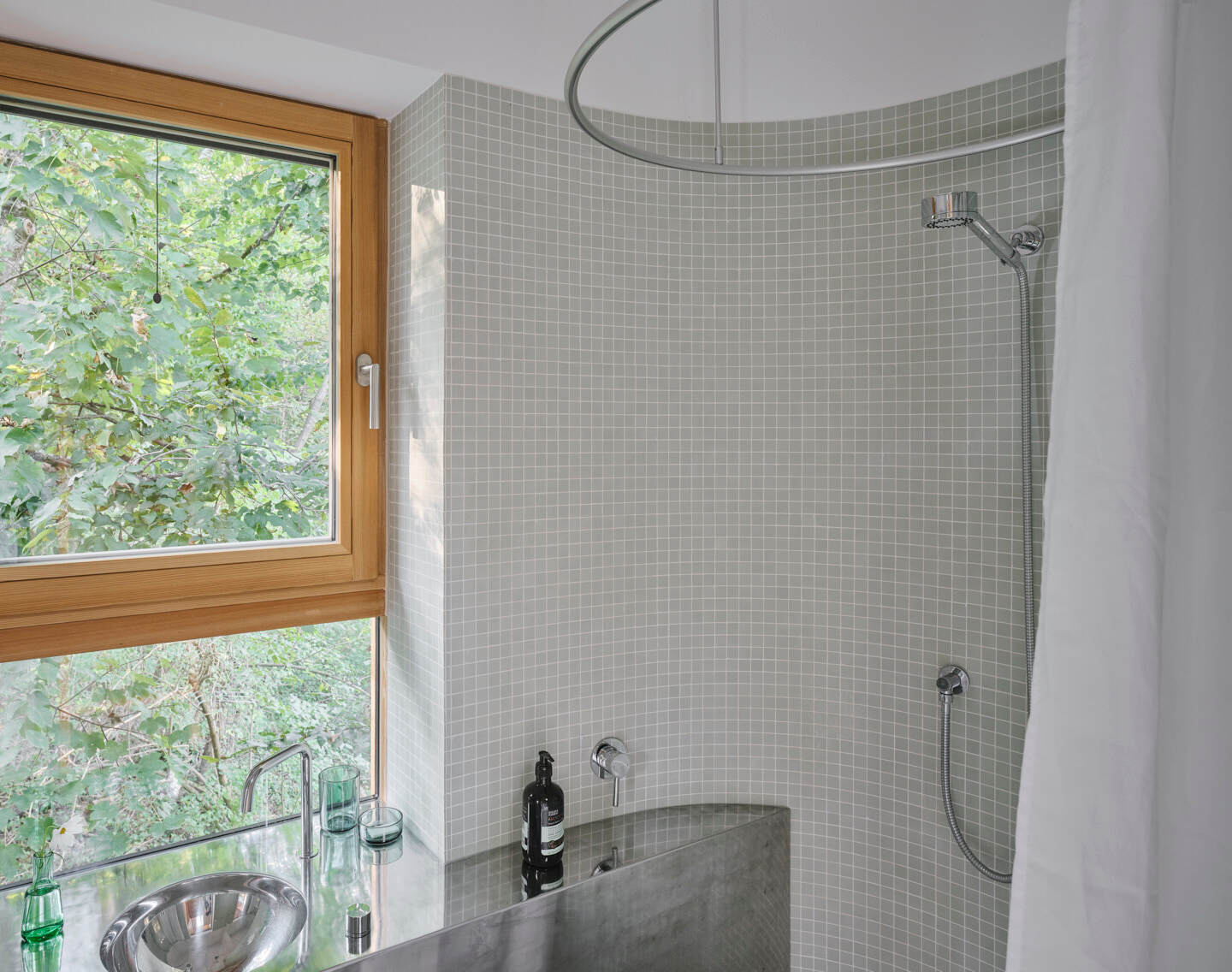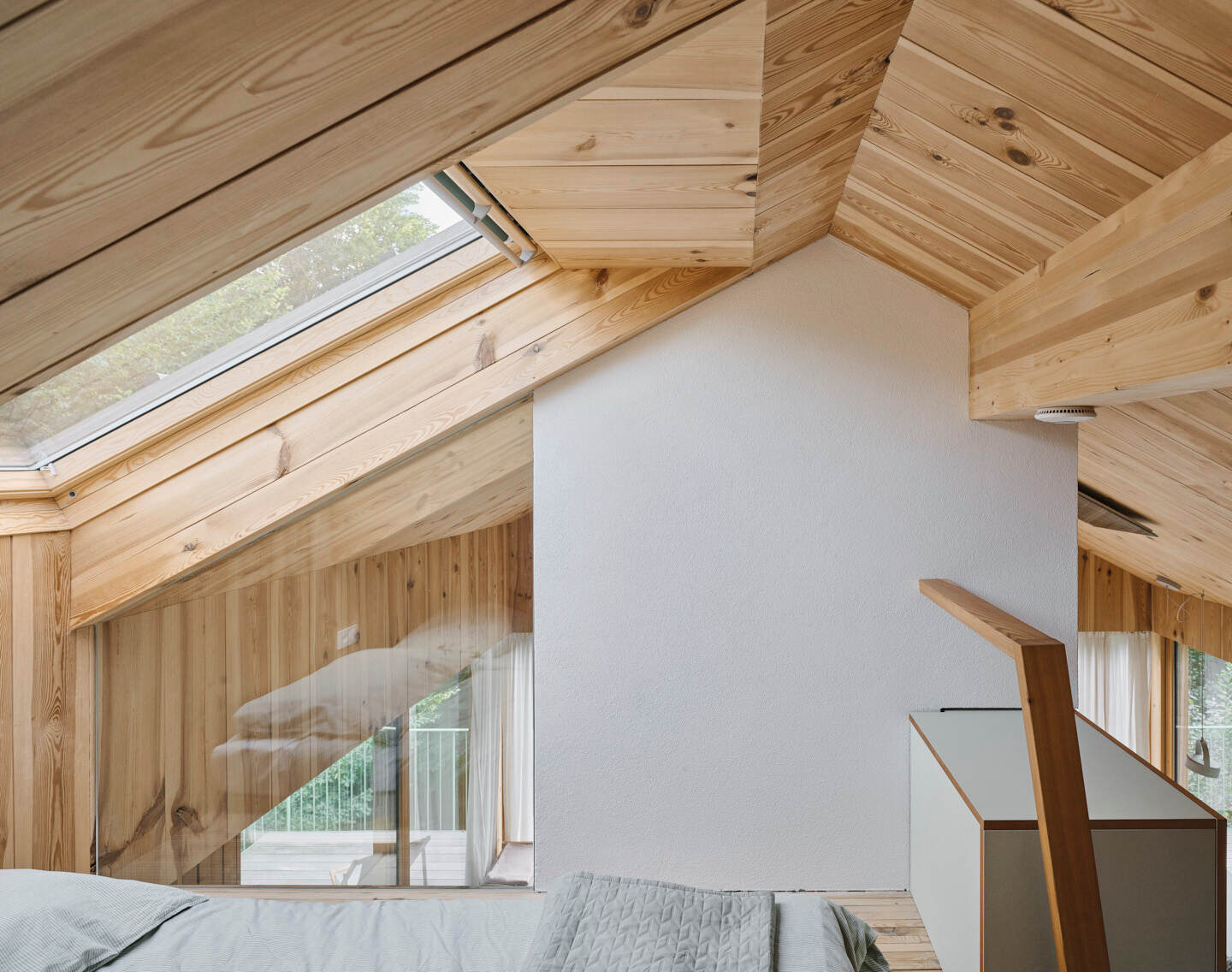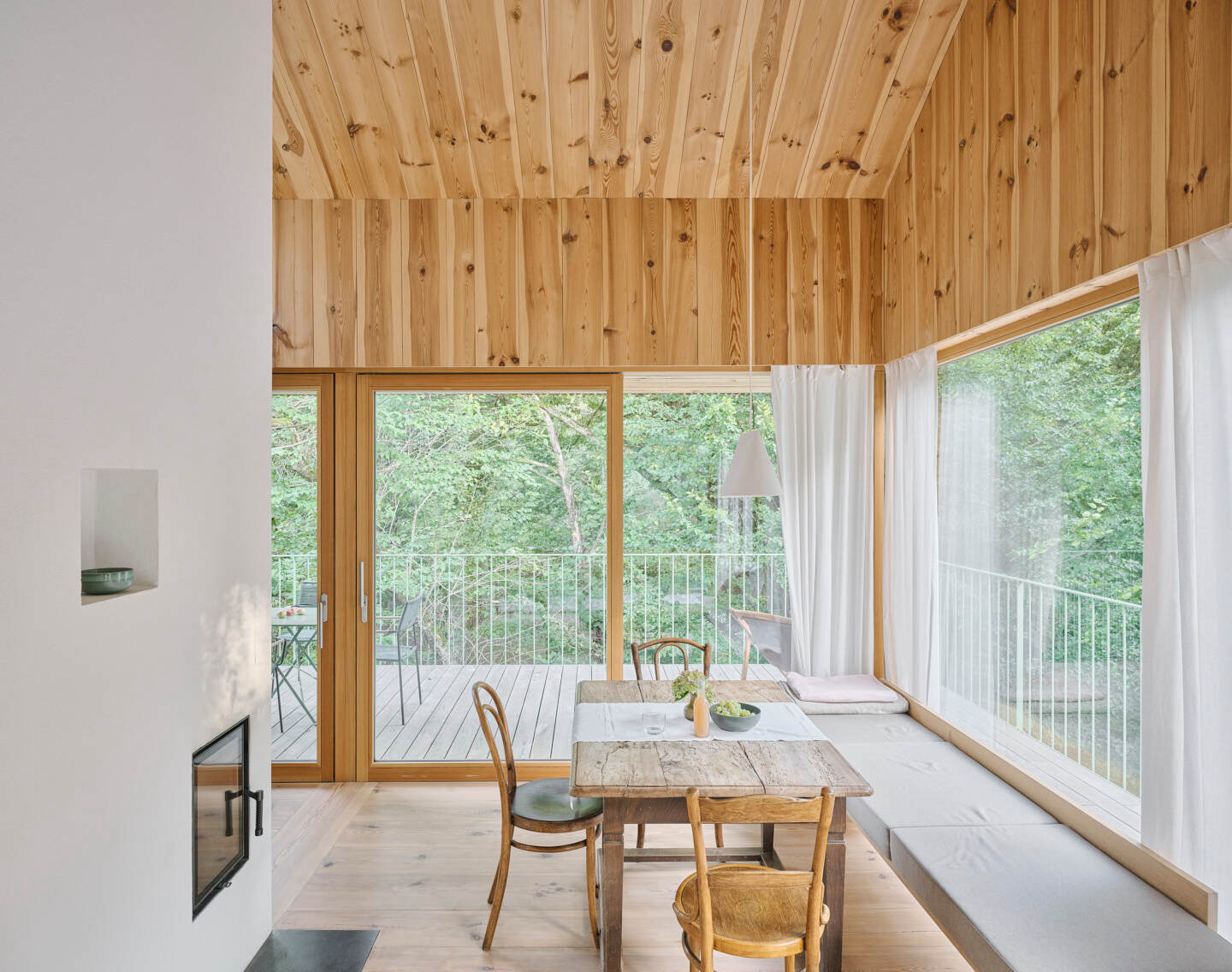 Natürliche Holzoberflächen prägen sowohl die Außenhülle als auch den Innenraum. Das Material stammt zum größten Teil aus dem umliegenden Wald, die Brettstapeldecken wurden von einem Betrieb in der Region lediglich mit Holznägeln gefügt. Auch bei den Stahlstützen, die das Haus und die Brücke tragen, wurde auf schlichte Fügung geachtet. Ihr blassgrüner Farbton findet sich auf vielen Oberflächen im Innern wieder und spielt mit der sich übers Jahr wandelnden Farbpalette der Umgebung. (Autor: Achim Geissinger, nach einem Text der Architekten)