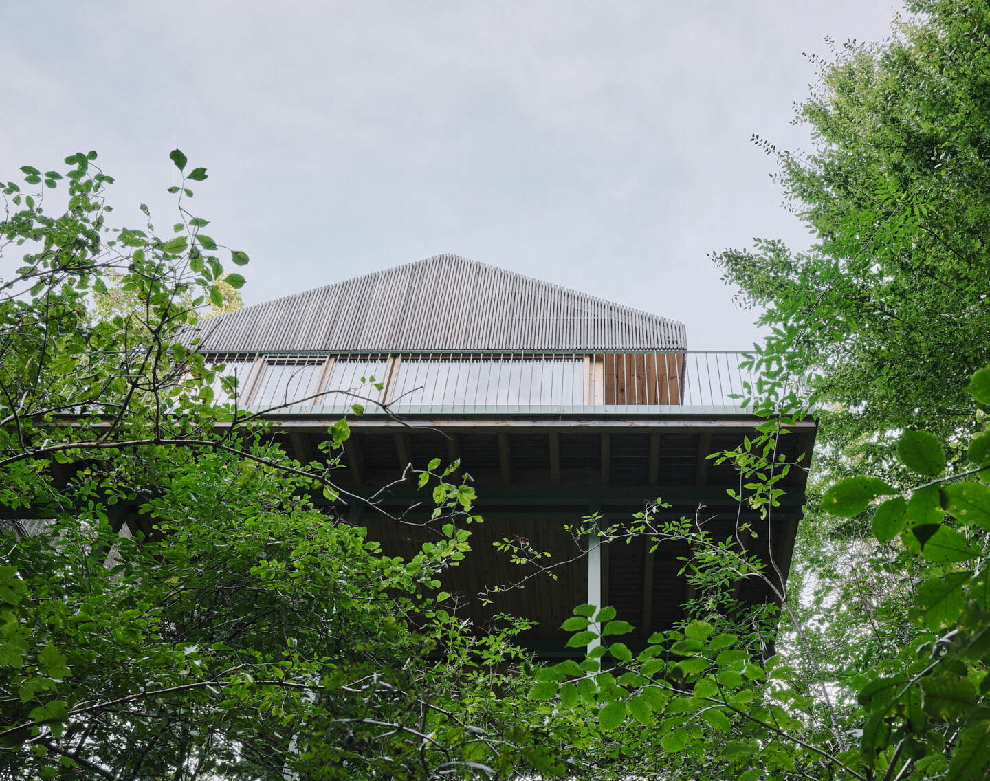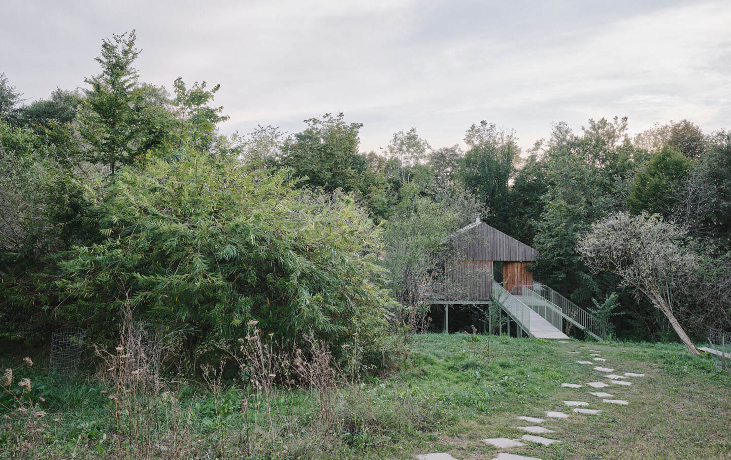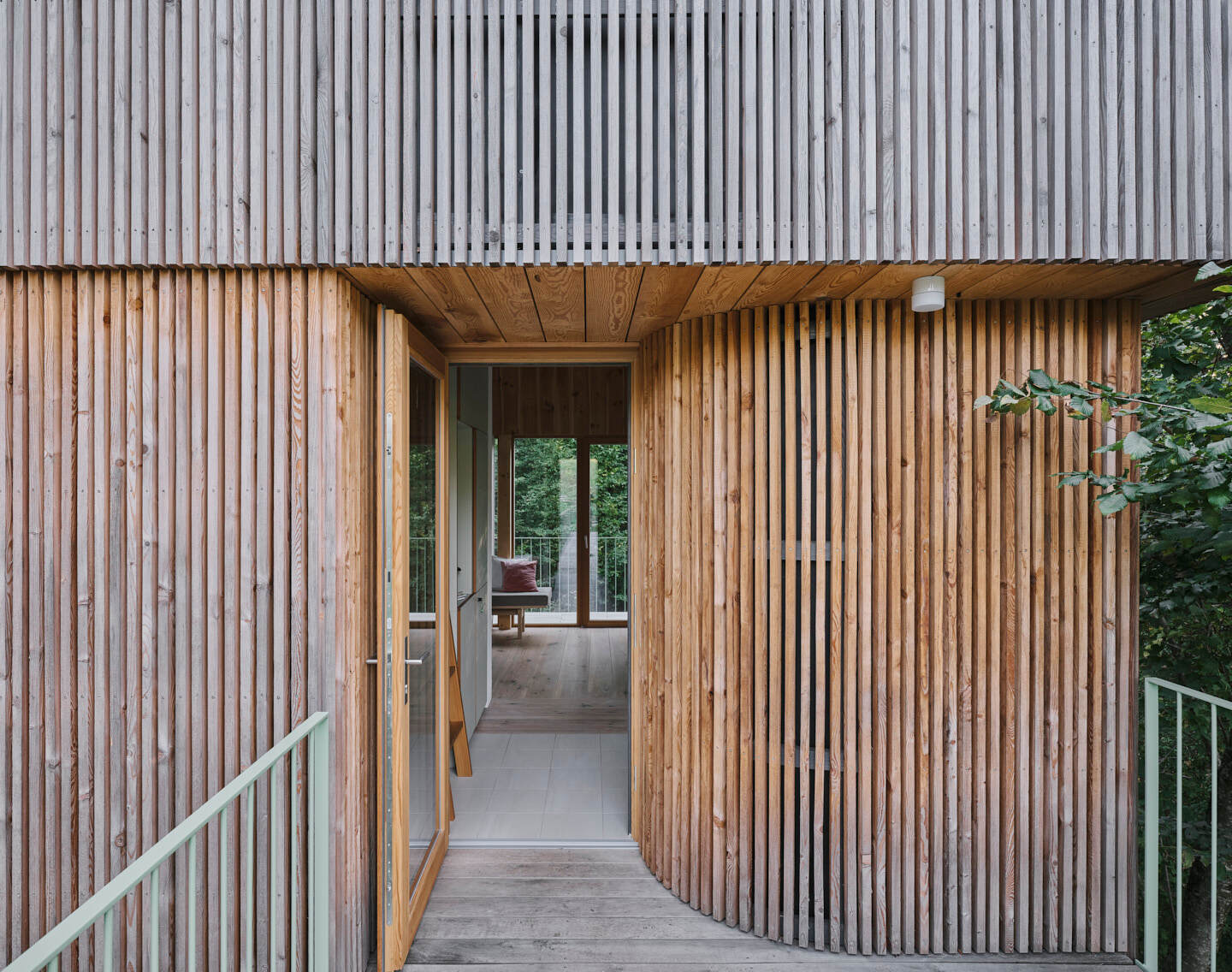 Die recht steile Topografie am Rand des Kainachtals wird ausgenutzt, um die Wohnebene mit den weitläufigen Terrassen weit über das Gelände hinauszuheben. Ohne Höhenversatz sind die die Räumlichkeiten auf Höhe der umliegenden Baumkronen über einen Steg zu erreichen.