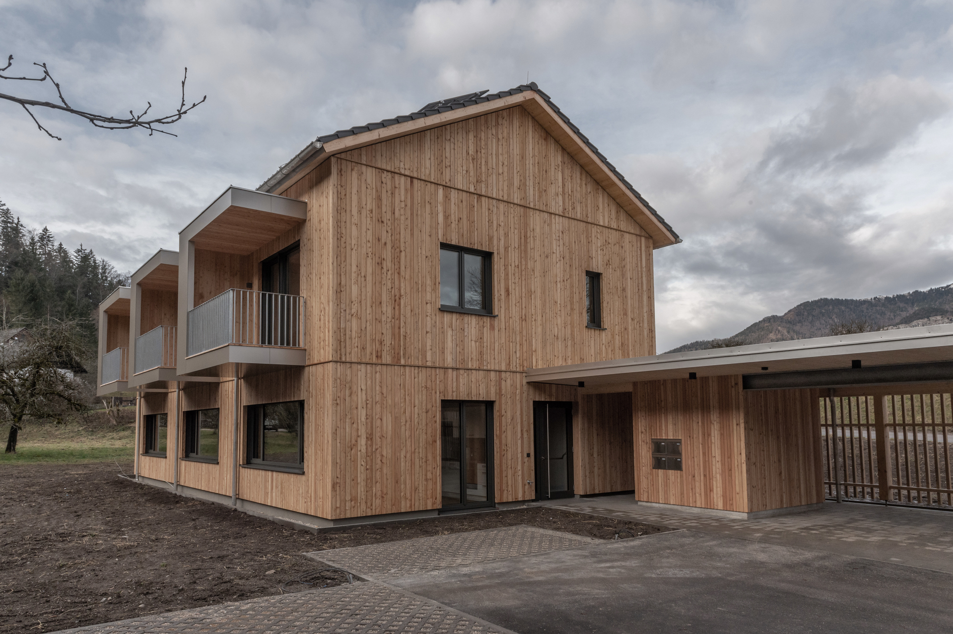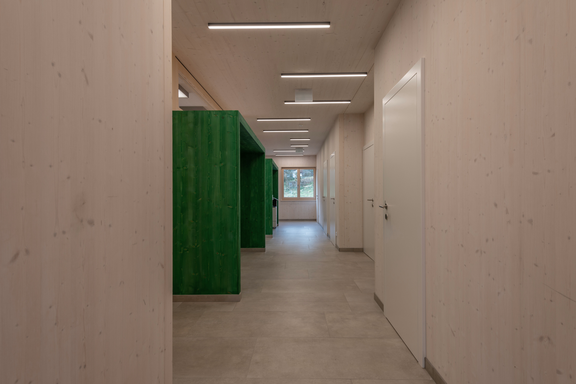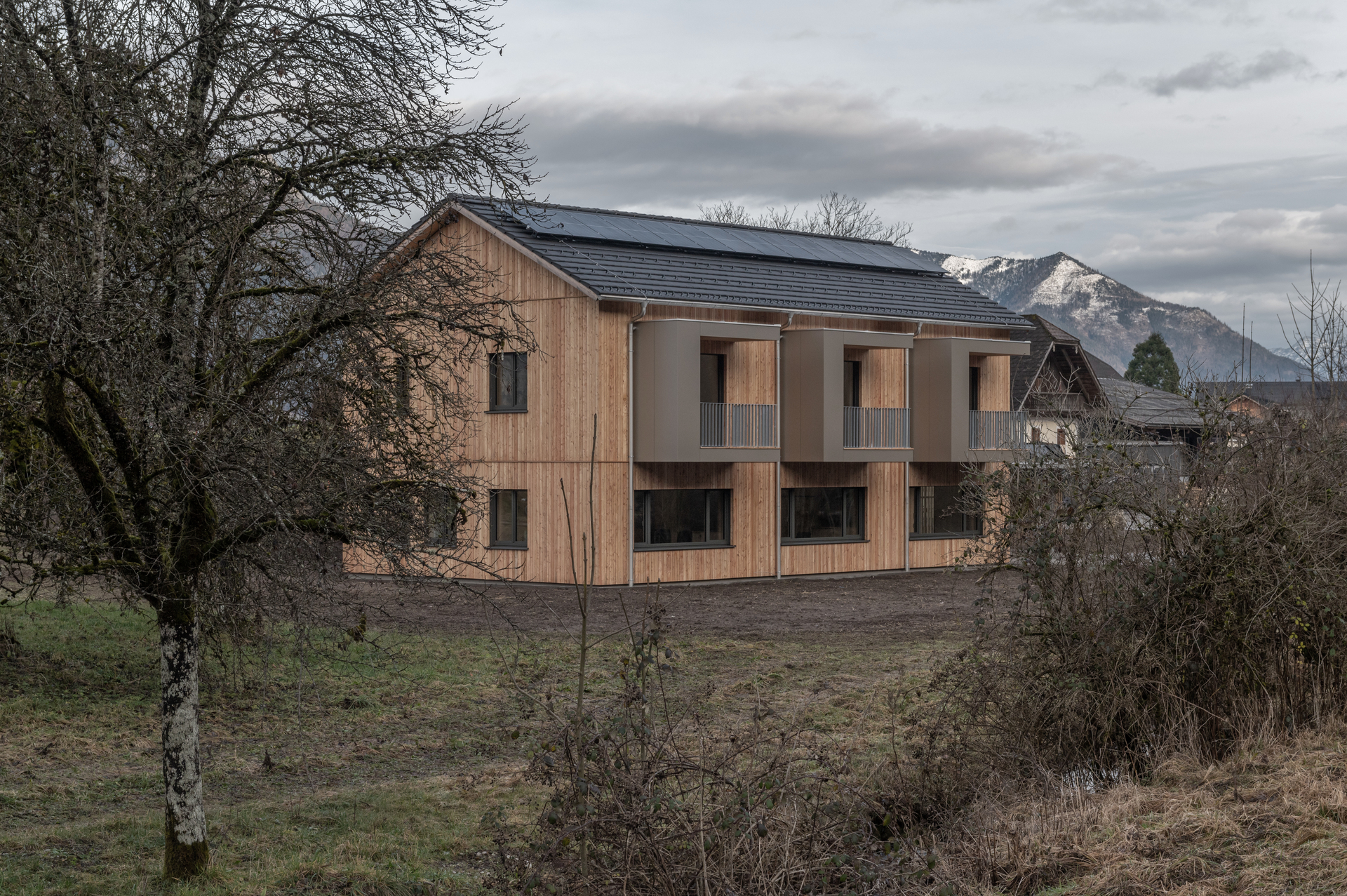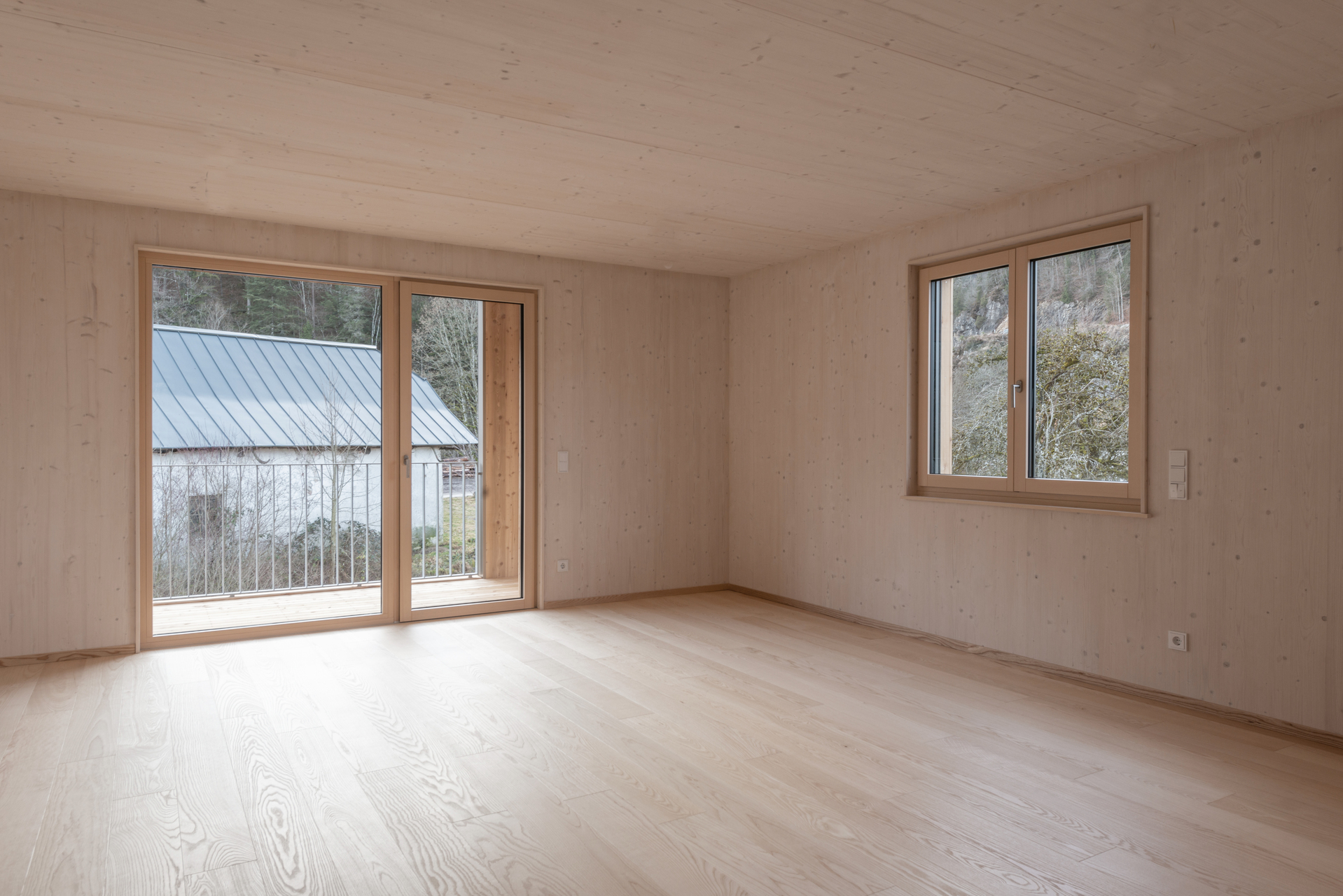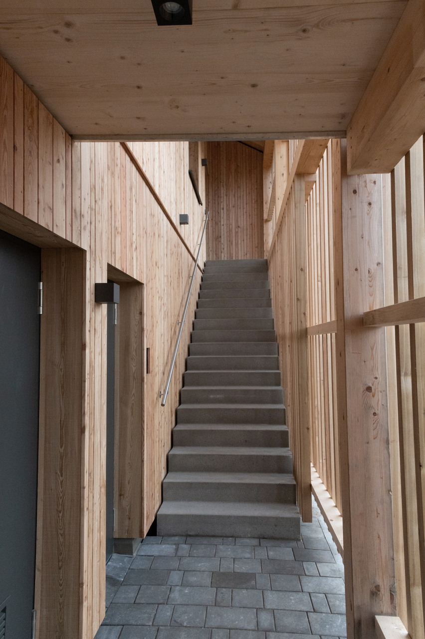 Sicht- und fühlbar zieht sich der Baustoff Holz konsequent durch das ganze Gebäude. Rund 170 m³ des Naturbaustoffs wurden verbaut. Als Dämmmaterial für Dach und Außenwände wurden Holzfasern gewählt. Heizung und Warmwasserbereitung werden von einer Luft/Wasser-Wärmepumpe gespeist, die Photovoltaikanlage ist für 6 kWp ausgelegt. (Autor: Achim Geissinger, nach einem Text der Architekten)