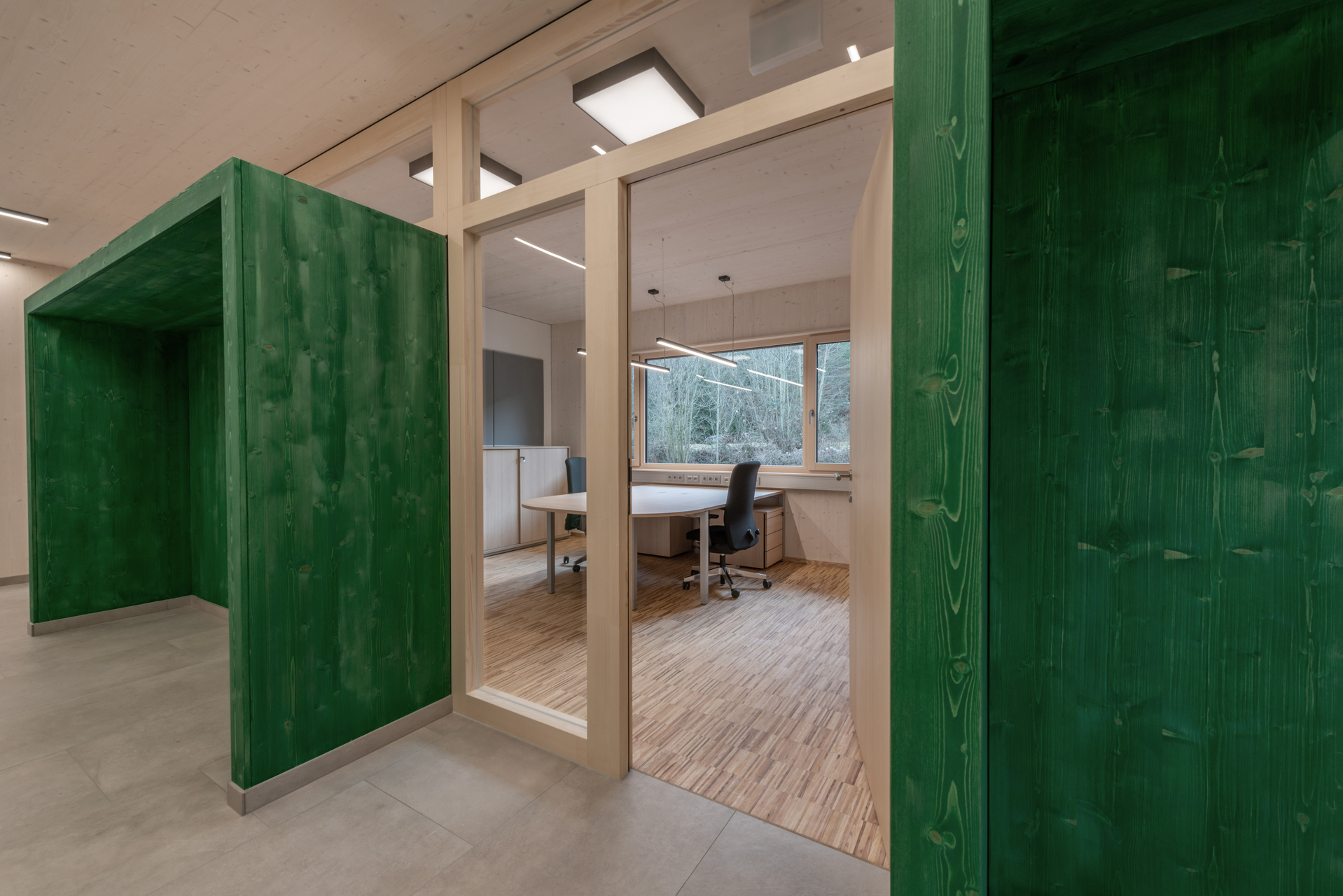 Vorgegeben war ein Gebäude in Holzbauweise mit vier festen Büroarbeitsplätzen, einem multifunktionalen Besprechungsraum und zwei Wohnungen für die Revierassistenten.