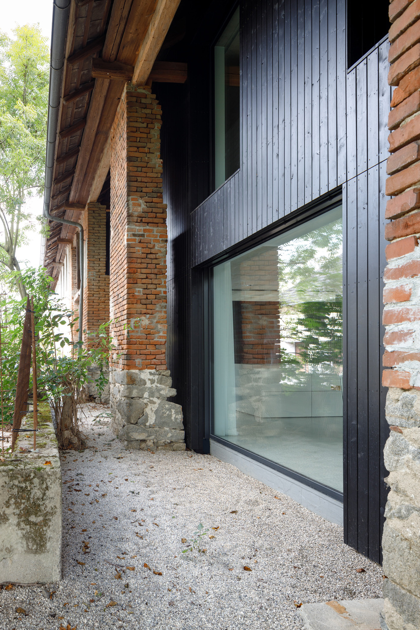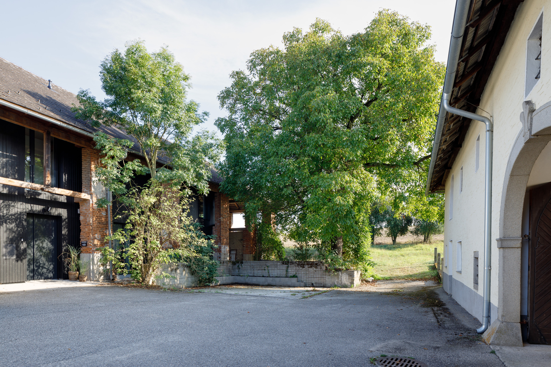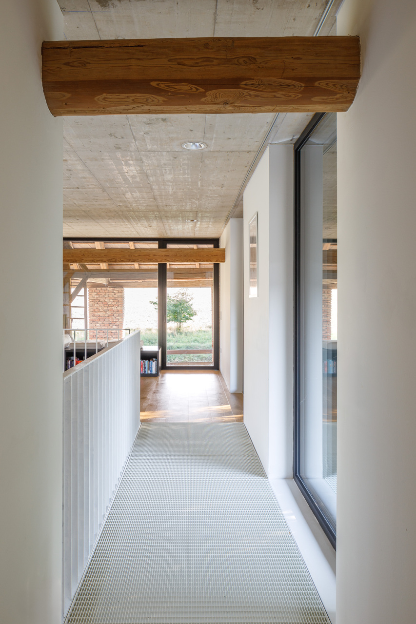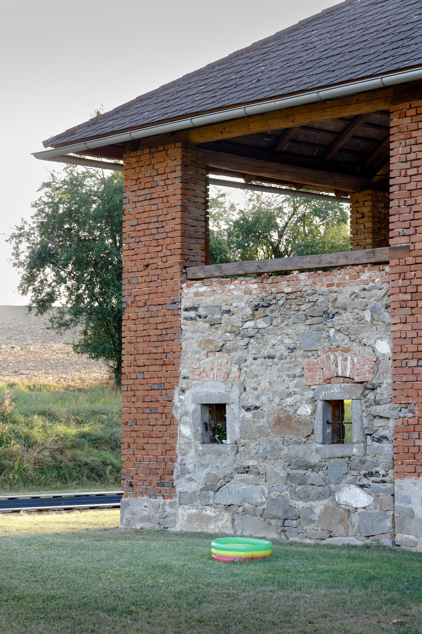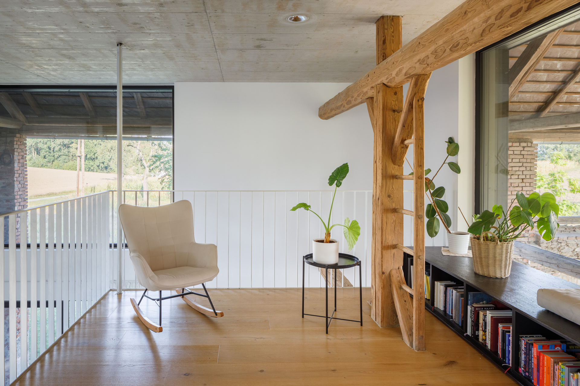 Die massiven Ziegelpfeiler und das Dach – die charakteristische Scheunentypologie dieses Gebäudes – blieben als tragende Elemente bestehen. Der Neubau wurde als eingeschobener Baukörper in der historischen Struktur errichtet. Die neuen Bauteile wahren Abstand, lediglich die Bestandskonstruktion des Dachs ist in den Neubau integriert und wird somit innen sichtbar. Mit dem Versatz von Alt und Neu entsteht ein Schwellenbereich zwischen Innen und Außen, der neue Perspektiven öffnet: Ausblicke in die umliegende Landschaft, Einblicke in die historische Konstruktion.