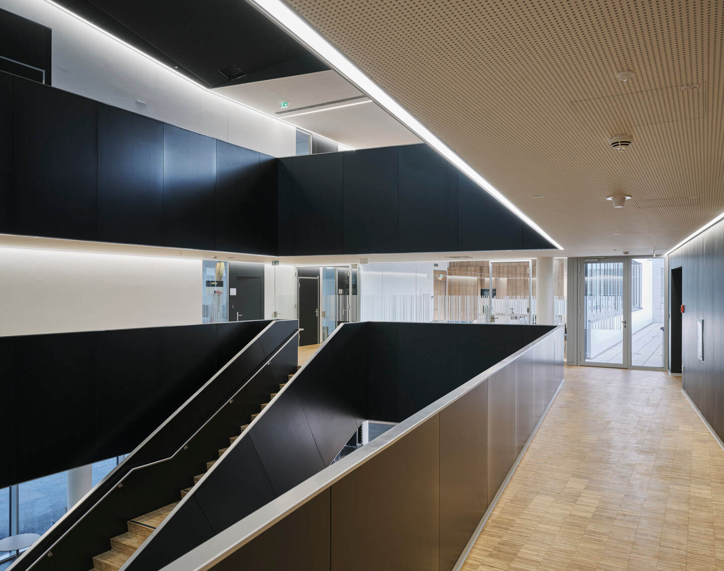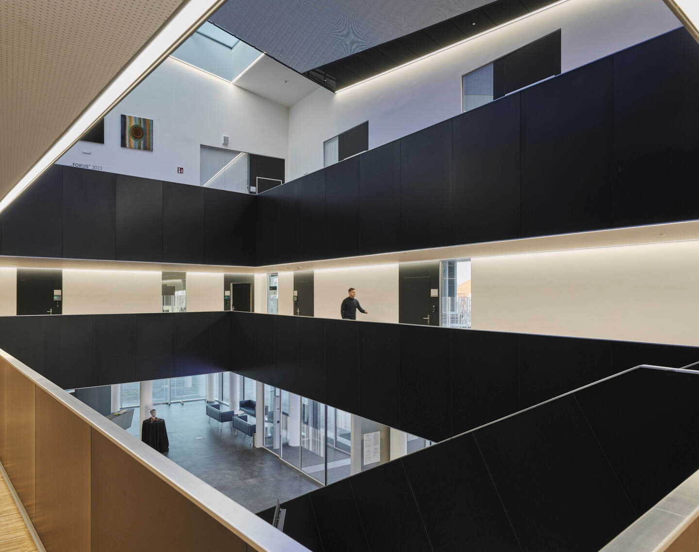 Das dreigeschossige Foyer bietet als Herzstück des Gebäudes mit natürlicher Belichtung und klaren Sichtachsen ein einladendes Raumgefühl und erleichtert den Zugang zu allen Bereichen vom Showroom über den Restaurantbereich bis hin zu den Co-Working-Spaces im ersten und der Fachhochschulerweiterung im zweiten Obergeschoss. Ein Meeting-Bereich unter dem First erscheint wie schwebend und bietet attraktive Ausblicke nach allen Seiten.