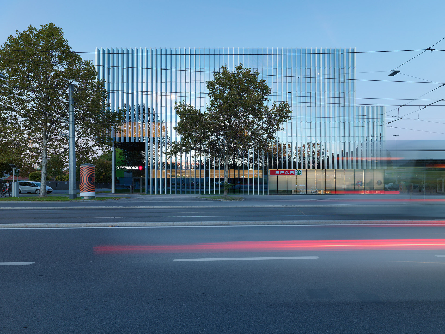 Die Glasfassade gewährt stets neue Einblicke und reflektiert sowohl das Sonnenlicht im Wandel des Tages als auch die Beleuchtung der näheren Umgebung.