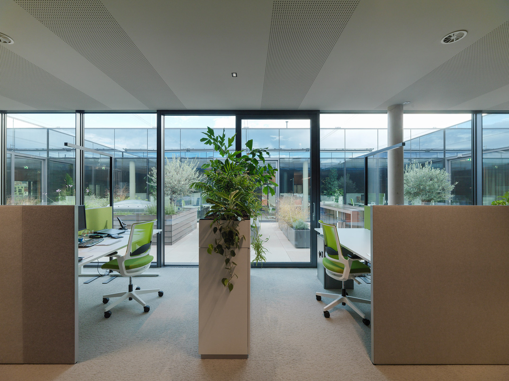 Die durchlässig wirkende Etage ist durch Glaseinschübe in kollaborative Zonen mit offenen Kommunikations- und Arbeitsbereichen unterteilt. Die Mitarbeitenden finden aber auch vielseitige Bereiche, die sowohl als Rückzugsort für fokussiertes Arbeiten als auch für Meetings oder soziale Interaktionen genutzt werden können – so etwa die als Glaskuben eingestellten Besprechungsräume als Teil der offenen, weiten Atmosphäre. (Autor: Achim Geissinger, nach einem Text der Architekten)