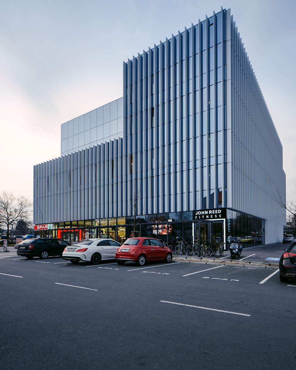 Das kompakte Bauvolumen präsentiert sich zunächst nach allen Seiten ähnlich. Mit vier charakteristischen Einschnitten zeigt es sich als skulpturale Form, innerhalb derer die Bereiche Einzelhandel, Büro und Freizeit zu einer ganzheitlichen Identität verbunden sind.