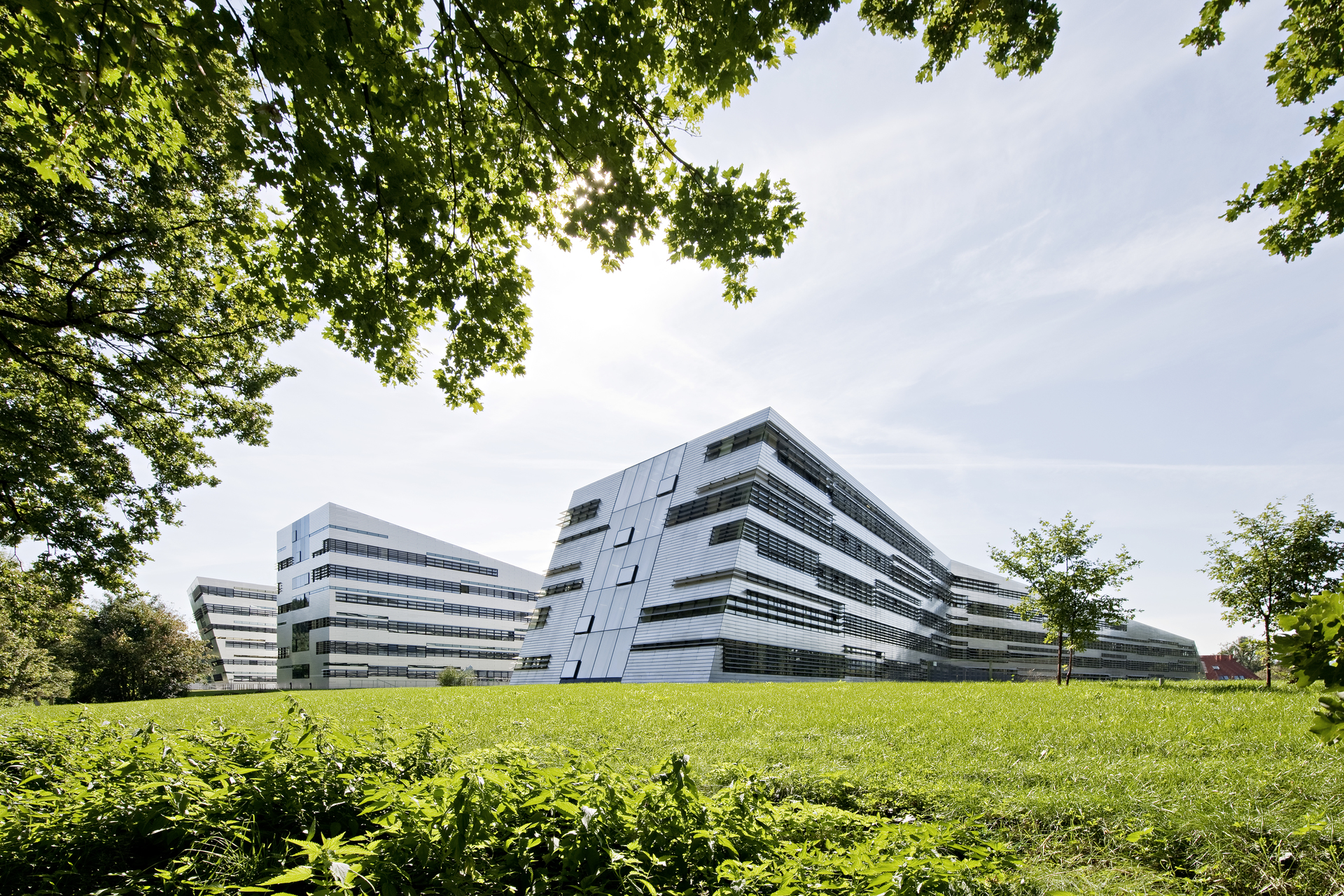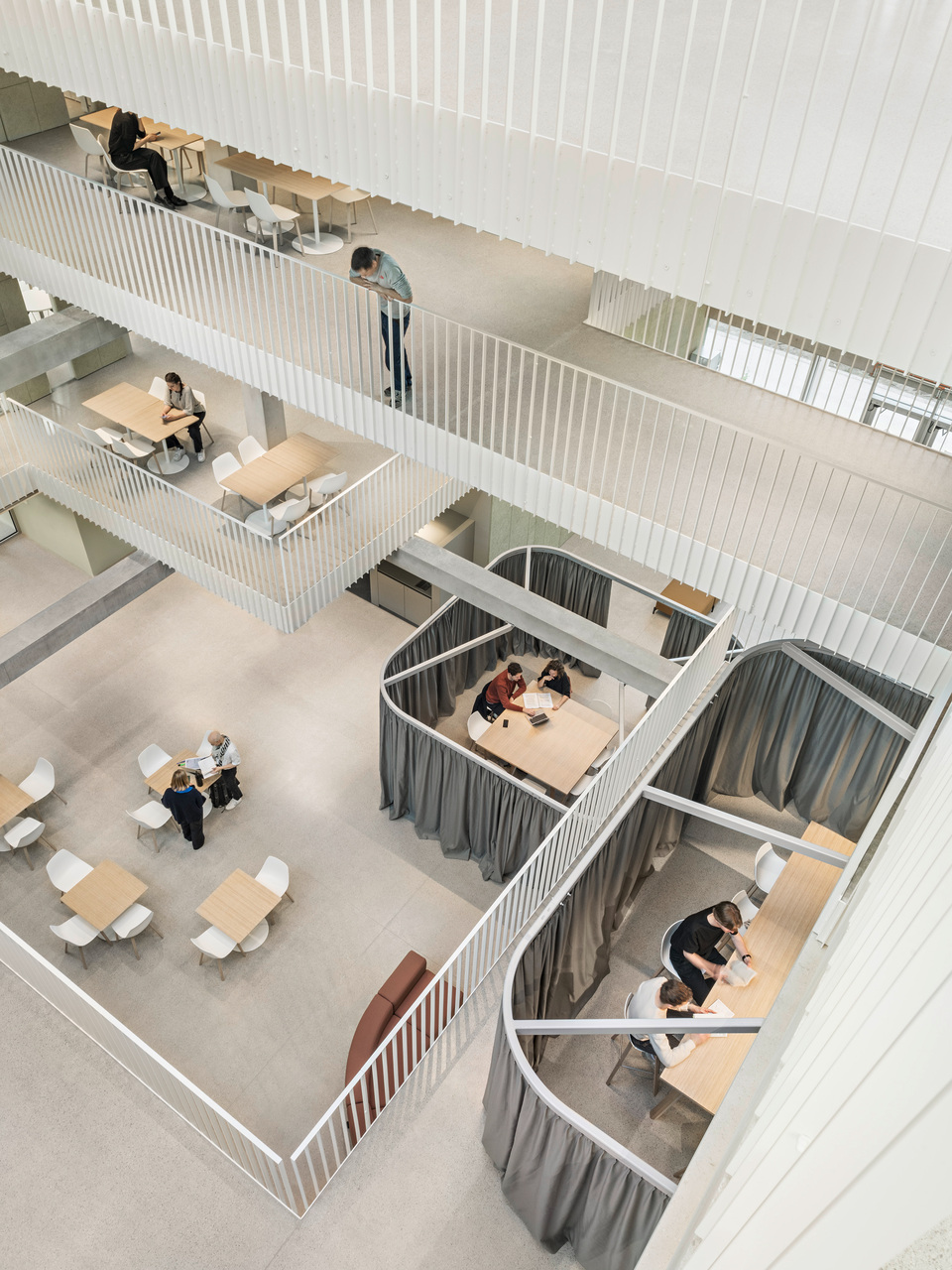 Als Hauptmotivator soll hier der Raum dienen, der sich zwischen den Büros der Forschenden und Lehrenden aufspannt. Ein luftiges Atrium voller Tageslicht, in dem sich Stiegen, Galerien, Podeste und Stege übereinanderschichten, farblich dezent untermalt durch die in Chirurgenkittelgrün gehaltenen Innenwände der Büros. Während die zweischichtige Außenhülle aus weißem Stahl sich um Sonnenschutz und grüne Berankung kümmert, spannt im Inneren ein Stahlbetongerüst mit luftiger Zehn-Meter-Spannweite einen großen Raum auf, in dem man zwanglos an den hier angesiedelten Instituten vorbeiflanieren kann. Ein House für die Schools.