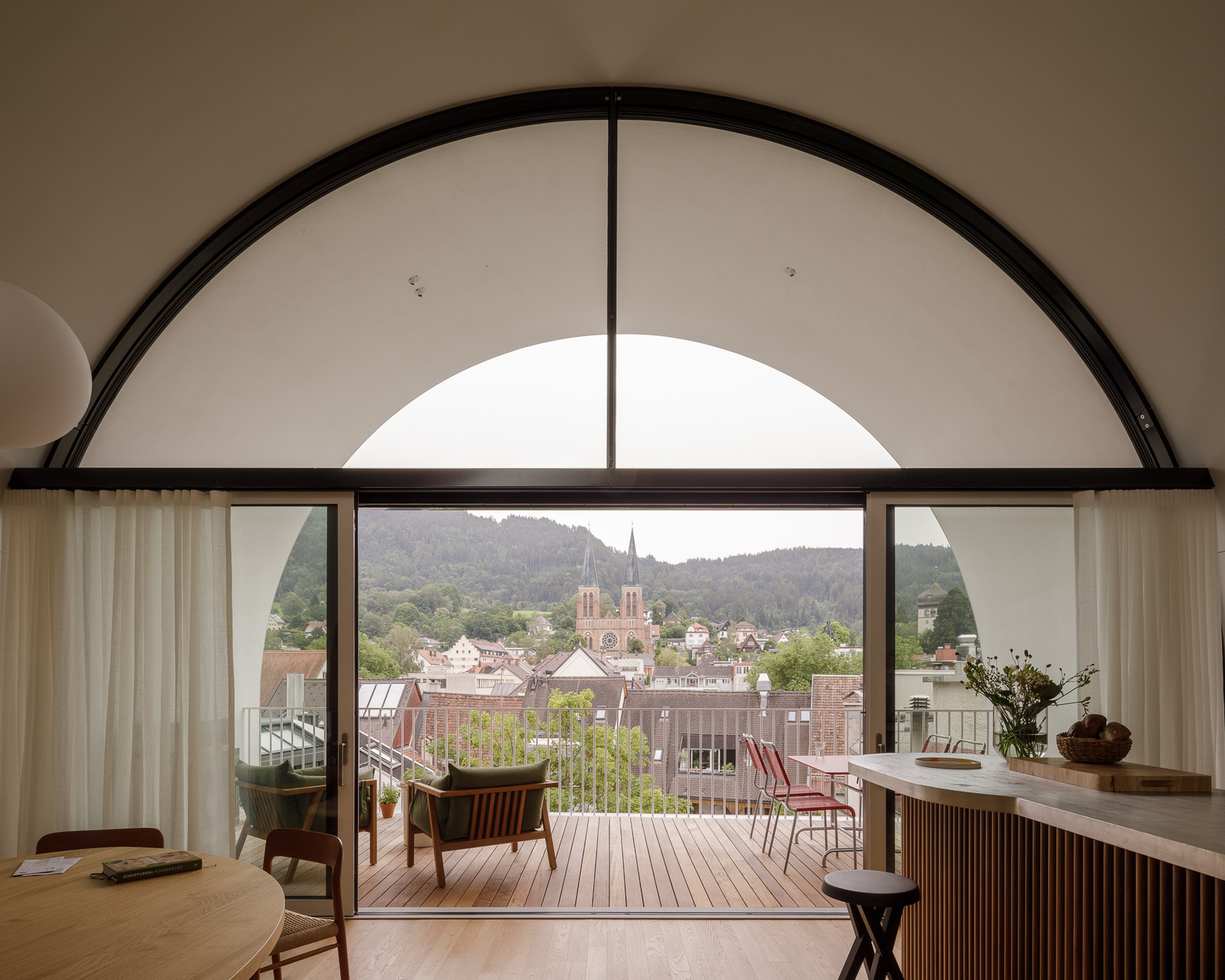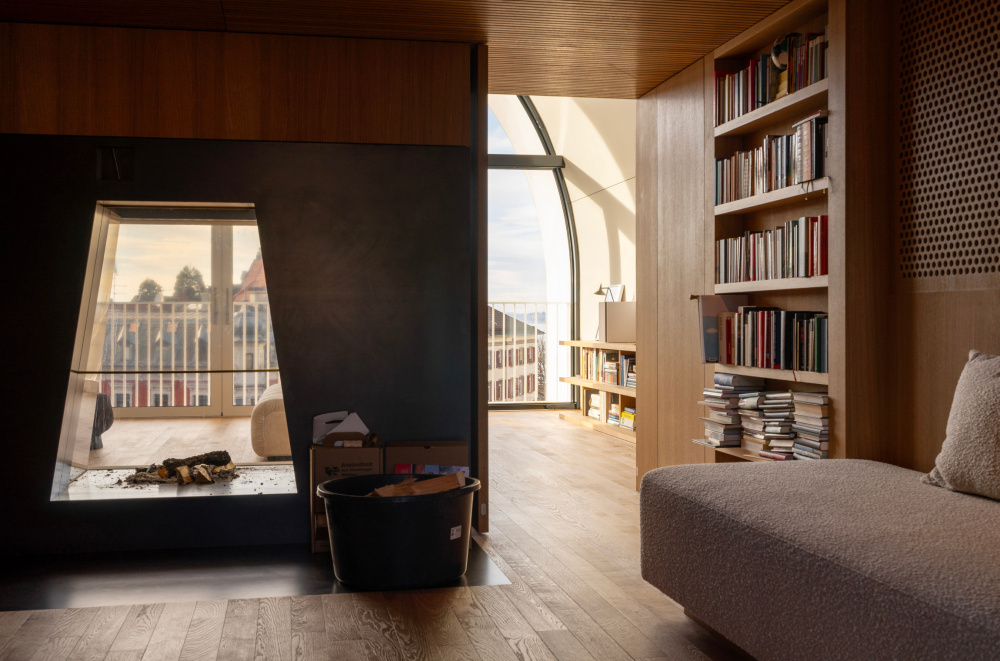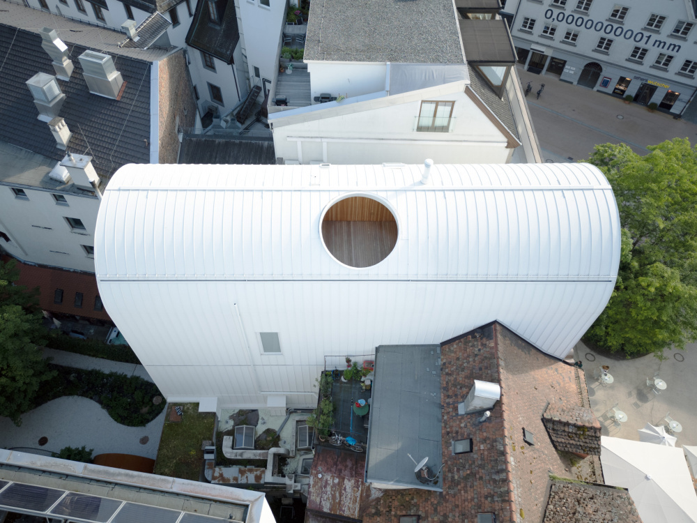 Die schmale Dachtonne mit der silberweiß schimmernden Aluminiumhaut fügt sich in die Bregenzer Dächer. Sie ist ein wenig vor die Glasfassade gezogen und schützt so die zwei Balkone der bauherrlichen Wohnung vor zu viel Sonne, Regen und Neugier. Die Schlafräume befinden sich im dritten Stock über den zwei Zimmerebenen des Hotels und halten sich auch an deren Raumaufteilung: in der Mitte die Erschließung, je stadt- und hintergartenseitig die Räume. Südwärts die Wohnküche zu Garten, Baum, Hinterhofgewusel, Dachlandschaft und Pfänder, nordwärts das Living mit der großen, vom Tonnenvordach in fünf Meter Höhe überdeckten Terrasse zum Kornmarktplatz mit einer Ahnung vom Bodensee.