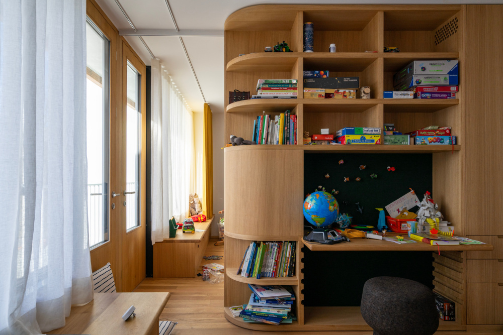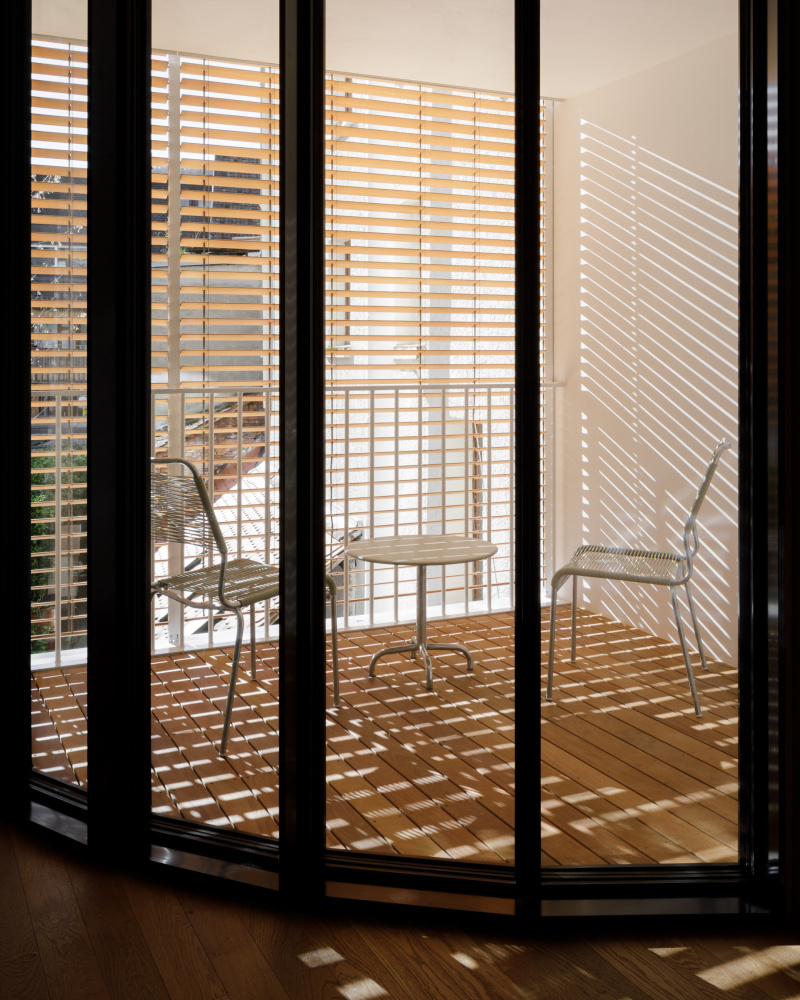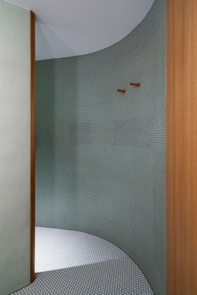 Der „Kleine Löwe“ fügt sich stimmig in die Stadtstruktur, ohne seine Bauzeit zu verleugnen. Das ist nicht zuletzt der Geometrie des Kreises zu verdanken, die den neobarocken Rundbogen zitiert und sich in vielen Details und Größenordnungen zeigt. Das hat System. Auf der beengten Fläche, die hier zur Verfügung steht, ist die fließende Grenze, die der Kreis im Raum erzeugt, sehr gewinnbringend. So bildet der viertelkreisförmige Abschluss der raumhohen Stahl-Glas-Fassade auf dem Balkon eines hintergartenseitigen Zimmers einen Freiraum aus, in dem man entspannt draußen sitzen kann. Sein Pendant bildet innen die runde Dusche mit den runden Fliesen.