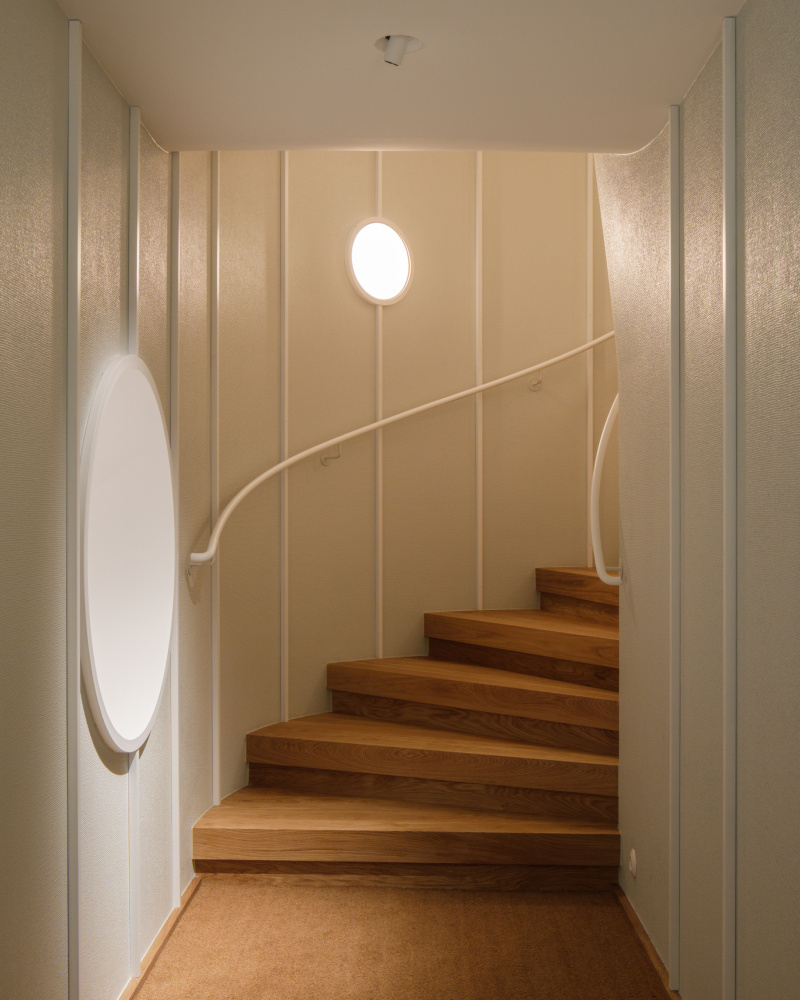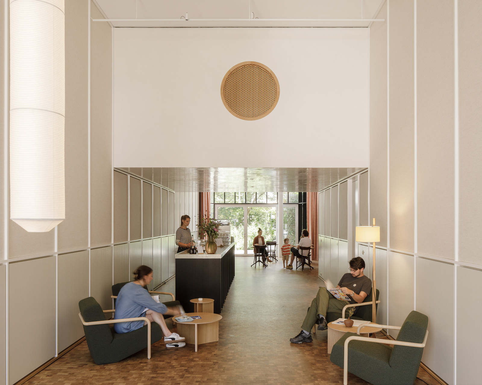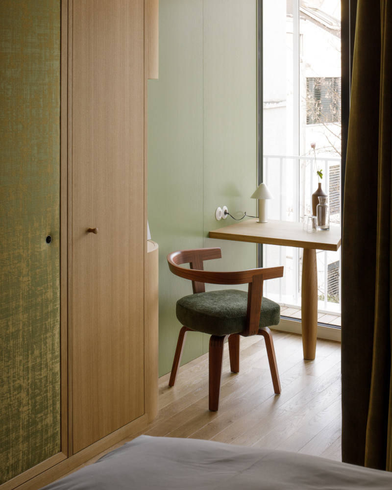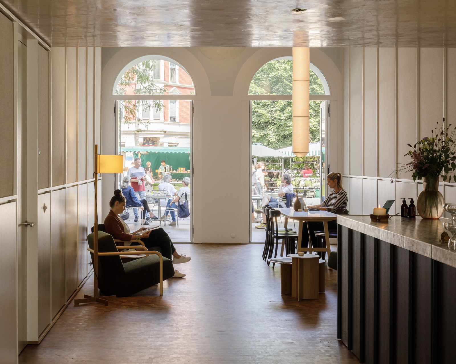 Das Erdgeschoß mit den drei hohen Rundbogenfenstertüren auf den Platz ist die Auslage des Hauses, hinter der sich ein großer, 4,80 Meter hoher, durchgesteckter Raum bis zur vollverglasten Rückfassade durch die gesamte Haustiefe zieht. Schlichte, halbhohe Lamperie aus mattweißem Holz, darüber schlammfarbene, stoffbespannte Paneele, die akustisch wirksam sind, Holzparkett und geschmackvolle Möbel schaffen eine Atmosphäre, die genau den richtigen Ton zwischen wohnlich und urban trifft. Der Raum ist so choreografiert, dass er nie wie ein Schlauch wirkt und ganz beiläufig als Lobby, Wartebereich, Café und Veranstaltungsort in der Stadt dienen kann.