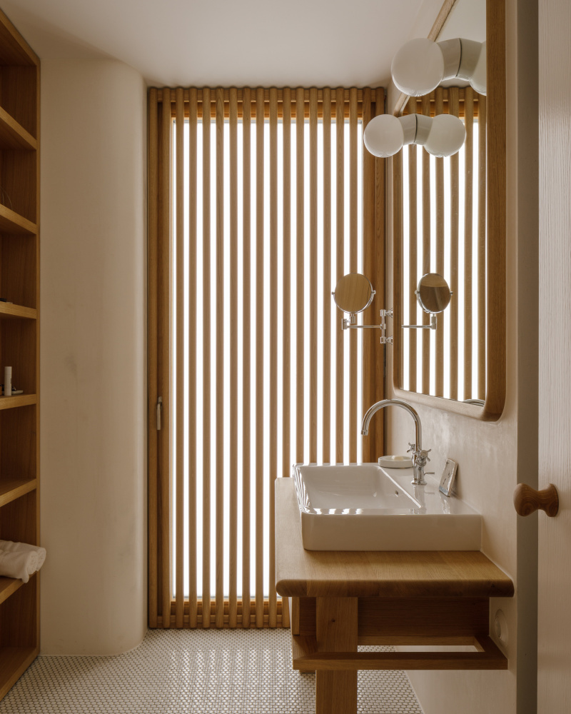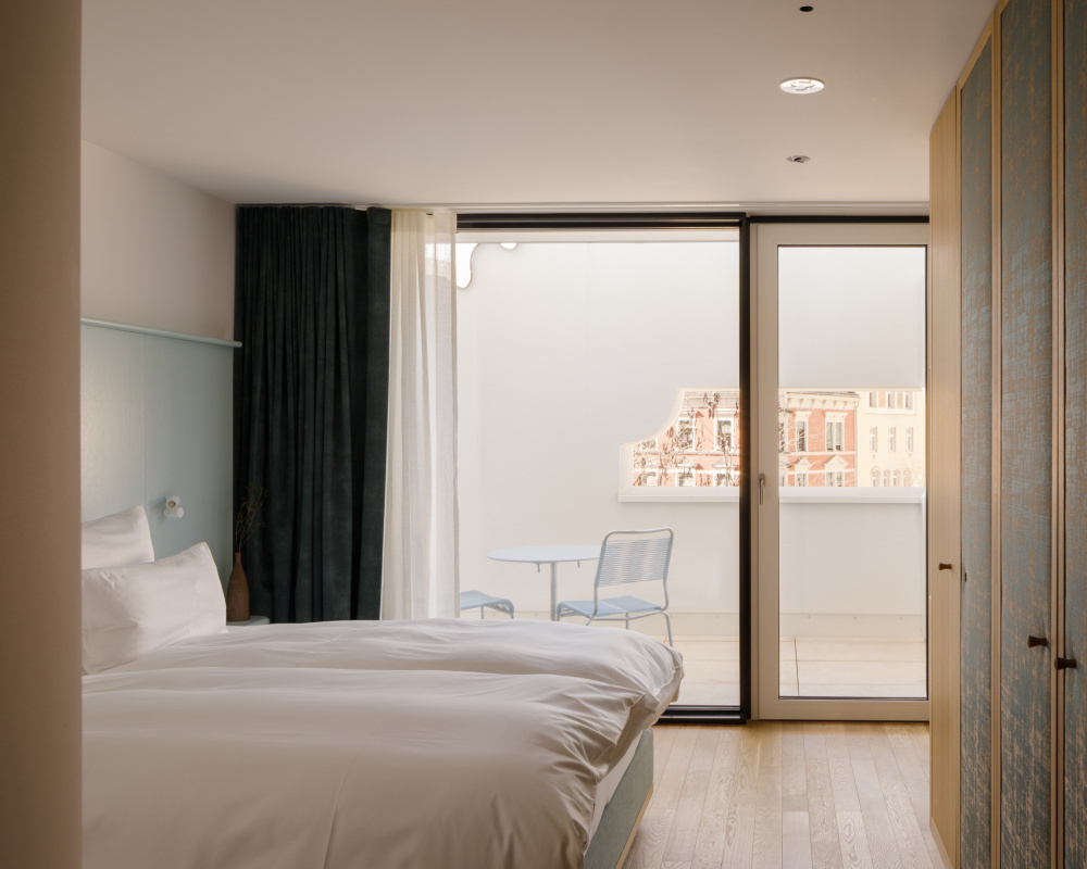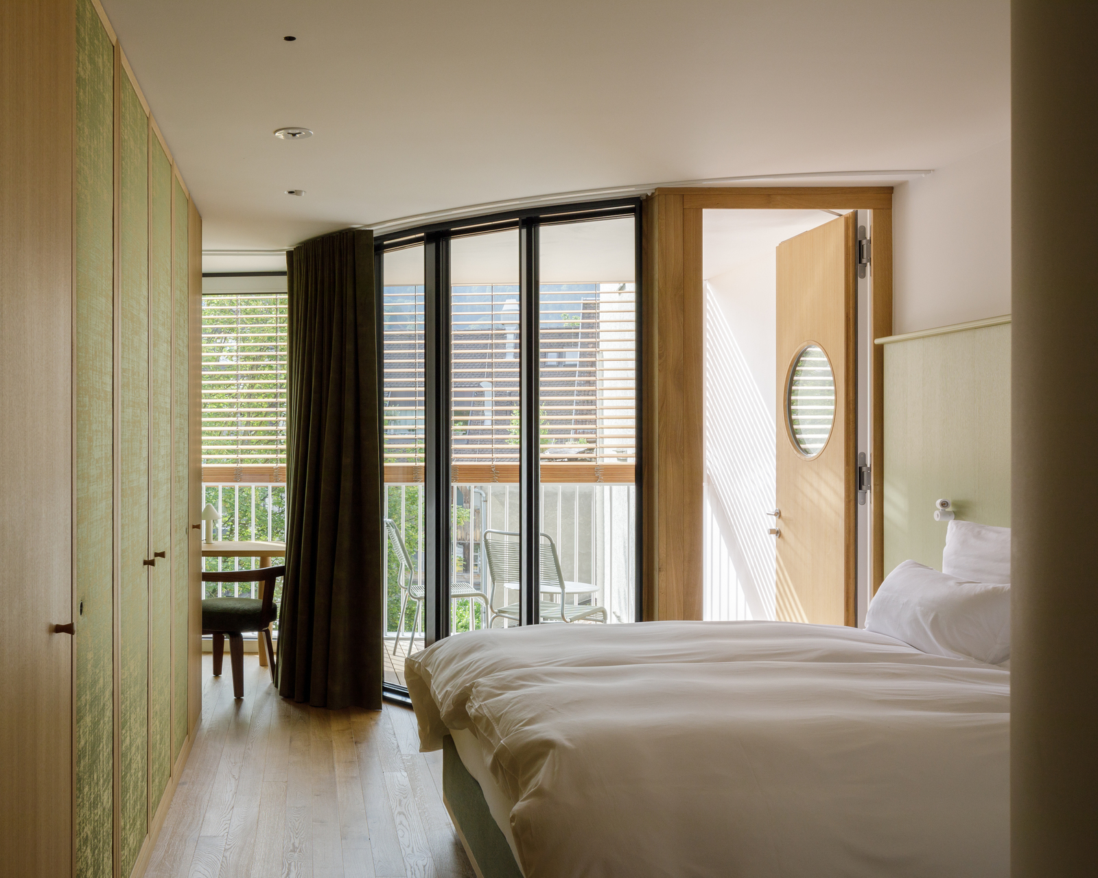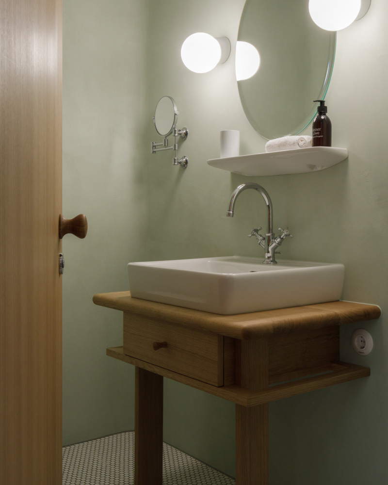 Das Erdgeschoß mit den drei hohen Rundbogenfenstertüren auf den Platz ist die Auslage des Hauses, hinter der sich ein großer, 4,80 Meter hoher, durchgesteckter Raum bis zur vollverglasten Rückfassade durch die gesamte Haustiefe zieht. Schlichte, halbhohe Lamperie aus mattweißem Holz, darüber schlammfarbene, stoffbespannte Paneele, die akustisch wirksam sind, Holzparkett und geschmackvolle Möbel schaffen eine Atmosphäre, die genau den richtigen Ton zwischen wohnlich und urban trifft. Der Raum ist so choreografiert, dass er nie wie ein Schlauch wirkt und ganz beiläufig als Lobby, Wartebereich, Café und Veranstaltungsort in der Stadt dienen kann.