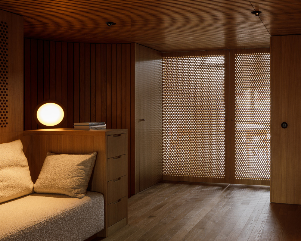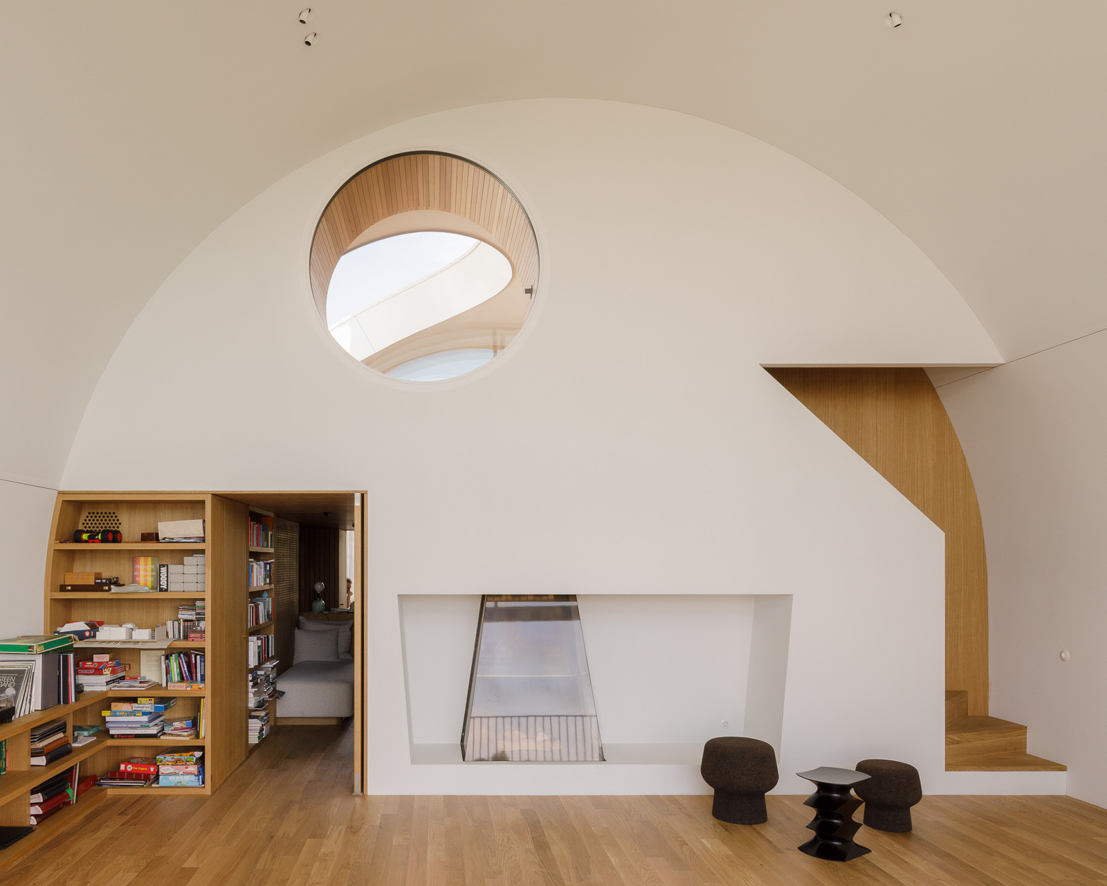 Die zweigeschoßhohe Wohnebene ist geprägt von der Dachwölbung. In ihrer Mitte ist ein Kreis in die Aluminiumhaut eingeschnitten: Er rahmt eine runde, gleichermaßen im Dach versenkte, versteckte Terrasse, auf der man nur noch den Himmel über sich hat. Der Rest ist Privatsphäre.