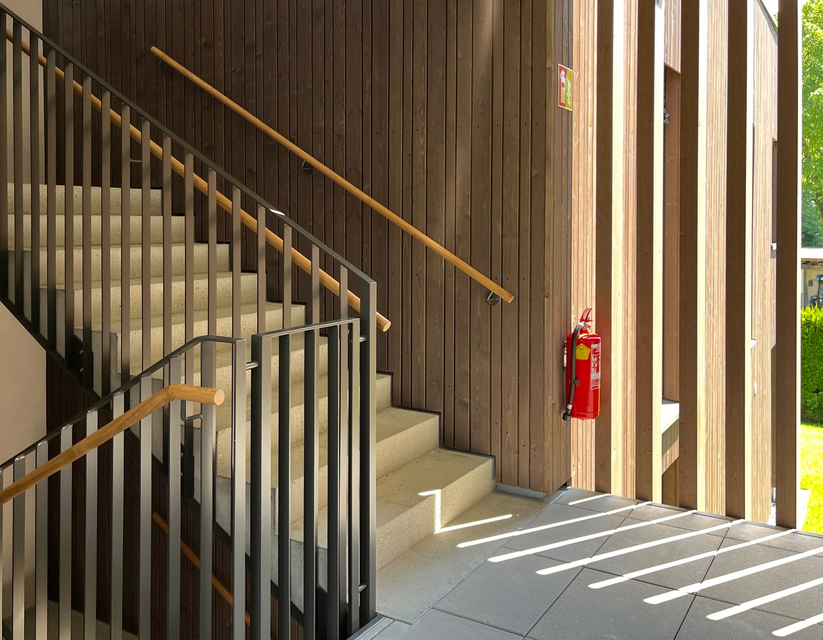 Die Wohnanlage wird als Massivbau ausgeführt, raumhohe Fenster bringen viel Licht in die Innenräume. Die Fassaden erhalten eine senkrechte Holzschalung in einem Rotbraunton, die verbindende Erschließungszone eine lichtdurchlässige, offene Holzlattung im gleichen Farbton. Farbig abgestimmte Markisen ergänzen das attraktive Gesamterscheinungsbild. (Text: Isabella Marboe, nach einem Text der Architekten)