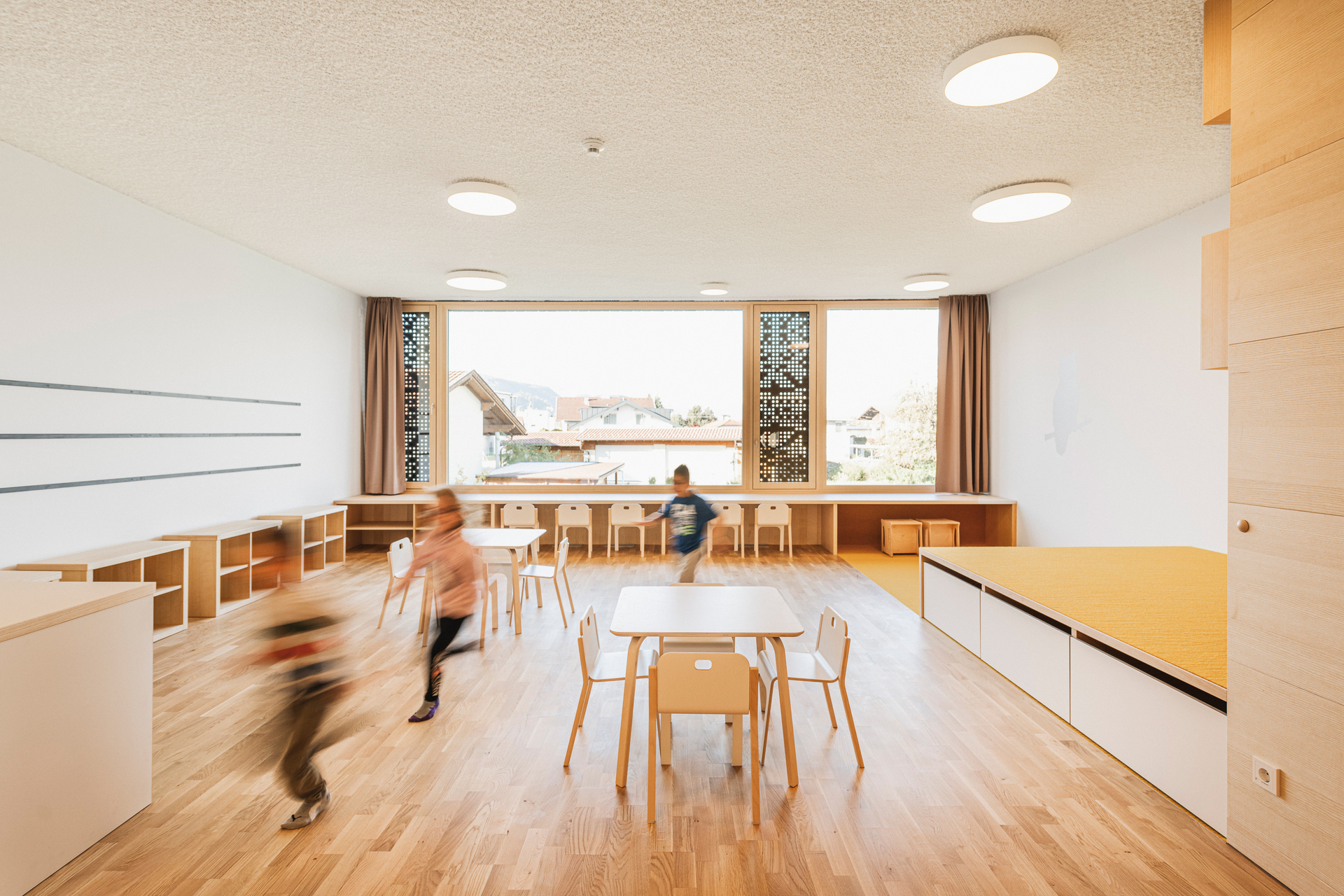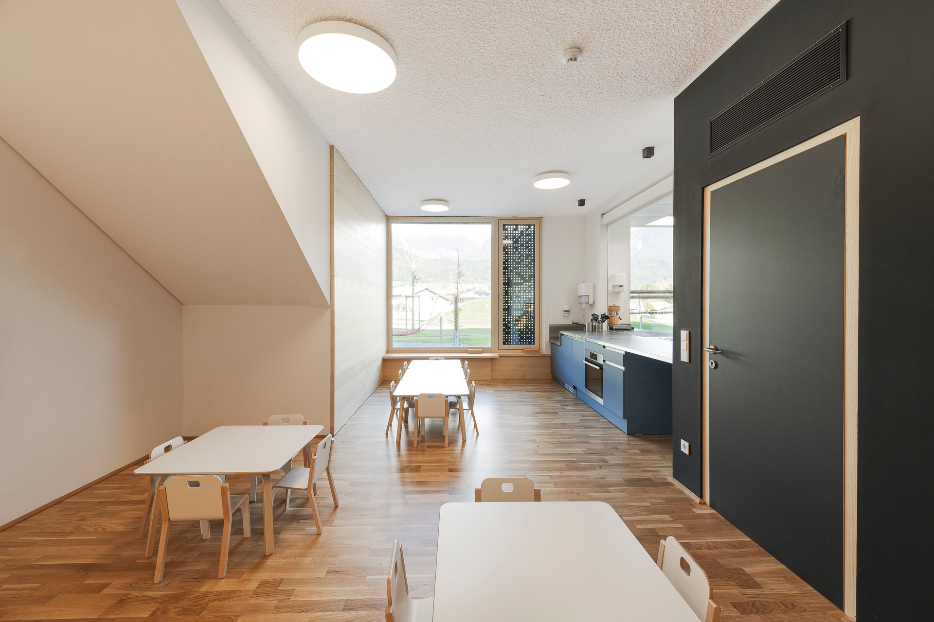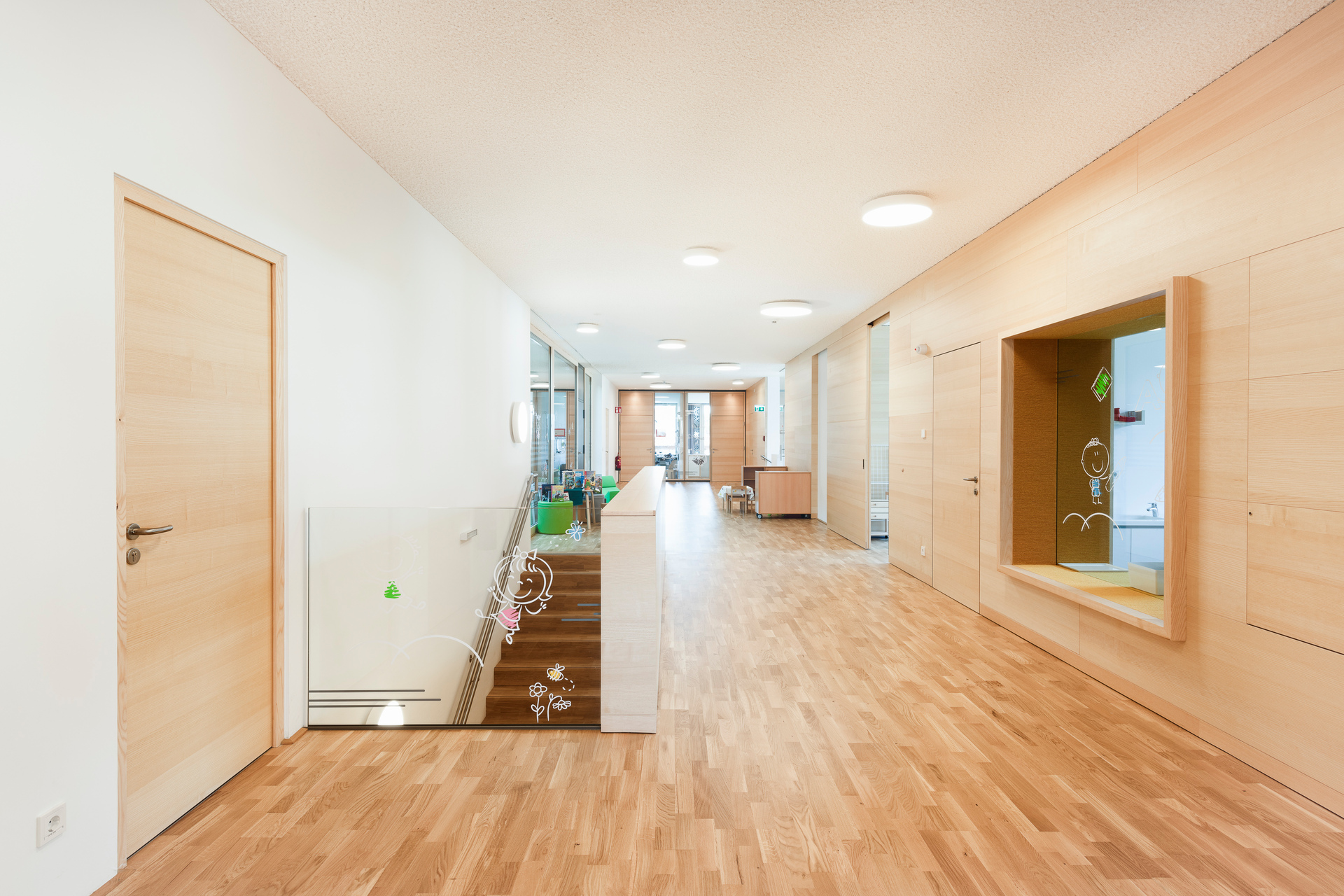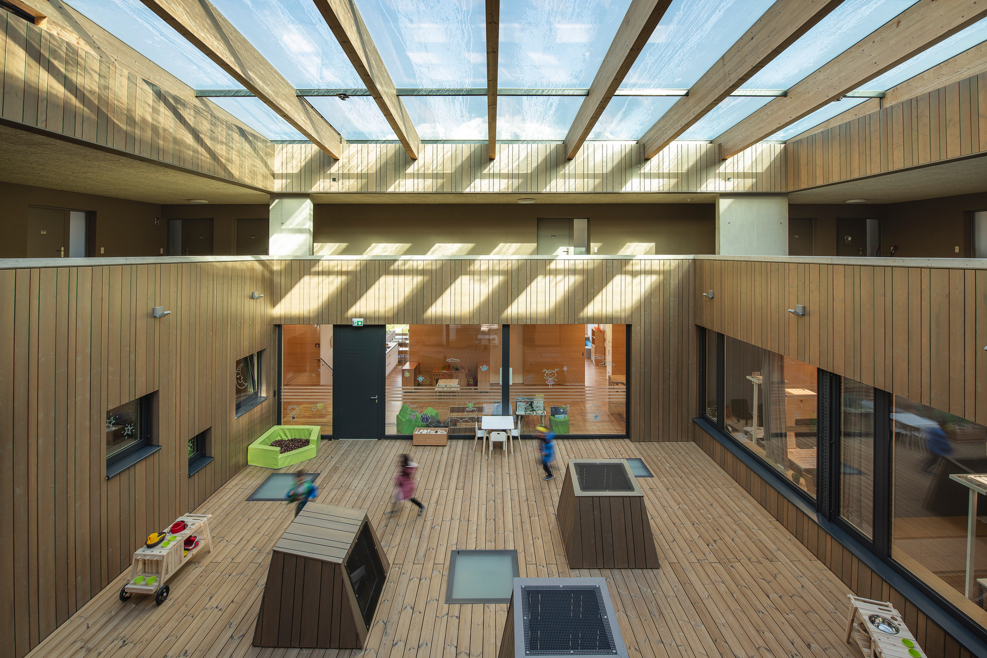 Vom Vorplatz aus führt eine Rampe zum Eingang und weiter zu den Garderobenbereichen von Kindergarten und Kinderkrippe. Die Räume für die 4-gruppige Kinderkrippe liegen im Erdgeschoß, ebenso die Bewegungsräume und der Mittagstisch. Im Südwesten erhielt die Kinderkrippe ihren eigenen, über eine vorgelagerte überdachte Terrasse erreichbaren Außen- und Spielbereich. Zwei einläufige Treppen führen hinauf zu den zentralen Marktplätzen der jeweils 4-gruppigen Kindergartenflächen, von hier aus werden die Gruppenräume sowie die weiteren Funktionsräume auf kurzem Weg erschlossen. Das Zentrum des Obergeschoßes bildet ein überdachter Innenhof, der den Kindern als windgeschützte „Patschenterrasse“ zur Verfügung steht. Die eigentliche Freifläche mit Spielmöglichkeiten befindet sich im Norden und ist in die großzügige Parklandschaft integriert, die durch Geländemodellierungen und Bepflanzungen gegliedert wird.