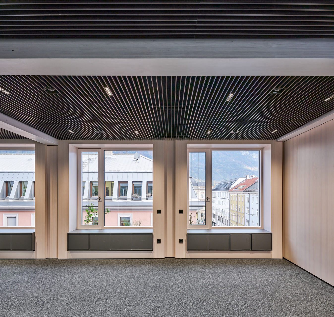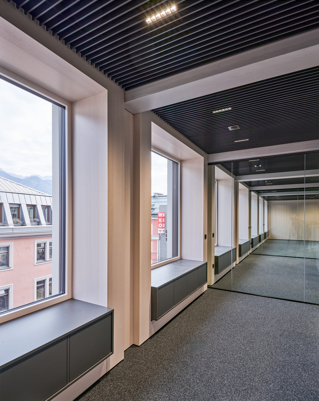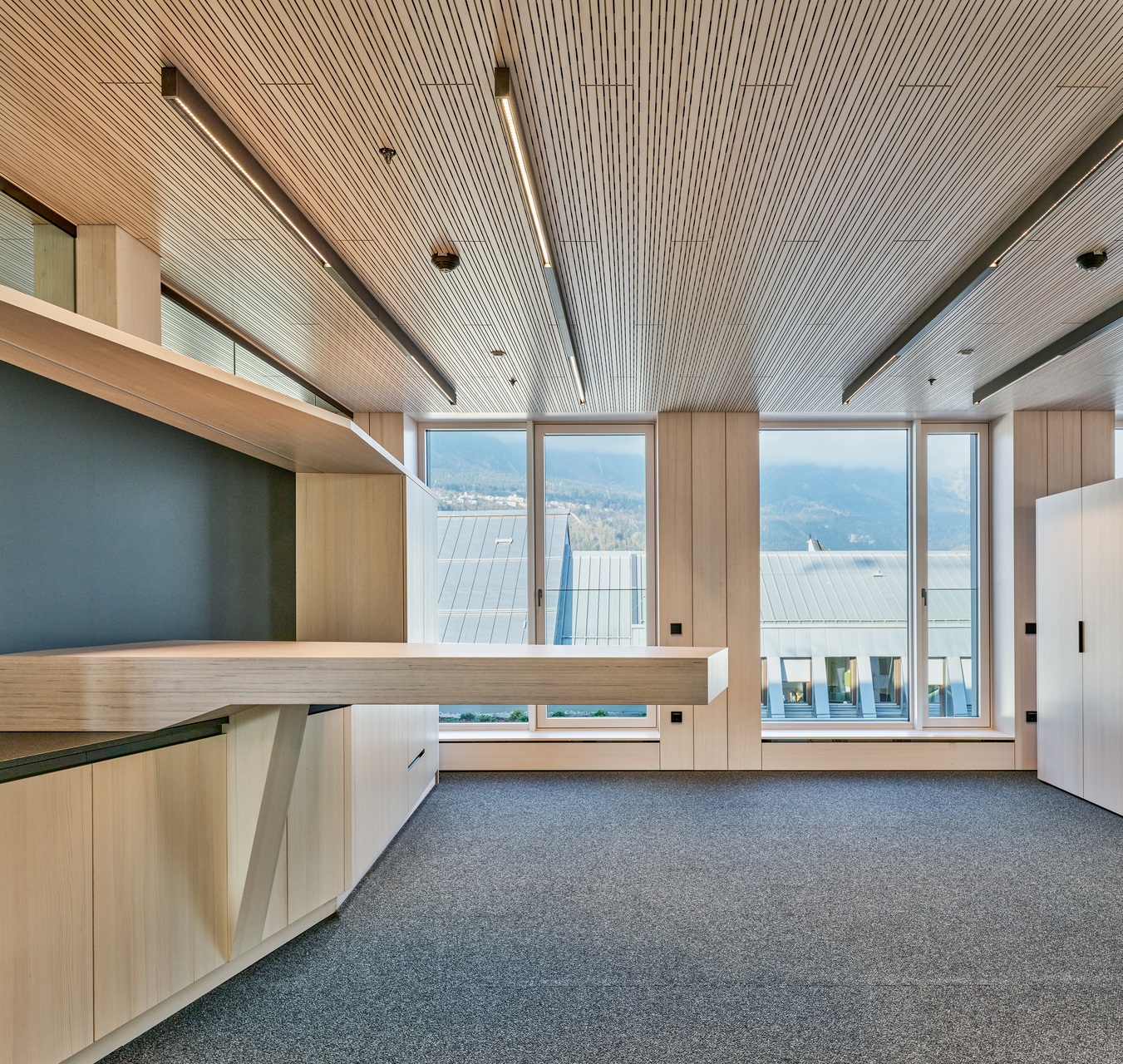 Das Ziel, ein besonders ressourcen- und umweltschonendes Gebäude zu realisieren, wurde durch die weitgehende Verwendung des Baustoffes Holz erreicht. Gleichzeitig ermöglichte die gewählte Holz-Hybrid-Bauweise mit einer die massiven Treppenhäuser umrahmenden Tragkonstruktion aus Holz in Verbindung mit Brettschichtholzdecken und -wänden einen relativ zügigen Bauablauf. So konnten die bis zu acht Meter langen Fassadenelemente vorgefertigt werden und mussten nur noch passgenau montiert werden. Träger und Stützen bestehen aus Furnierschichtholz (Buche), das bei geringem Eigengewicht eine hohe Tragfähigkeit gewährleistet. Durch die Kombination von Baubuche, Brettsperrholzplatten im Verbund mit Stahlbetonkernen und einer witterungs- und brandbeständigen Außenfassade konnte mit der Zentrale der Tiroler Versicherung das erste Holzhochhaus in Tirol errichtet werden. (Text: Claudia Wedekind)