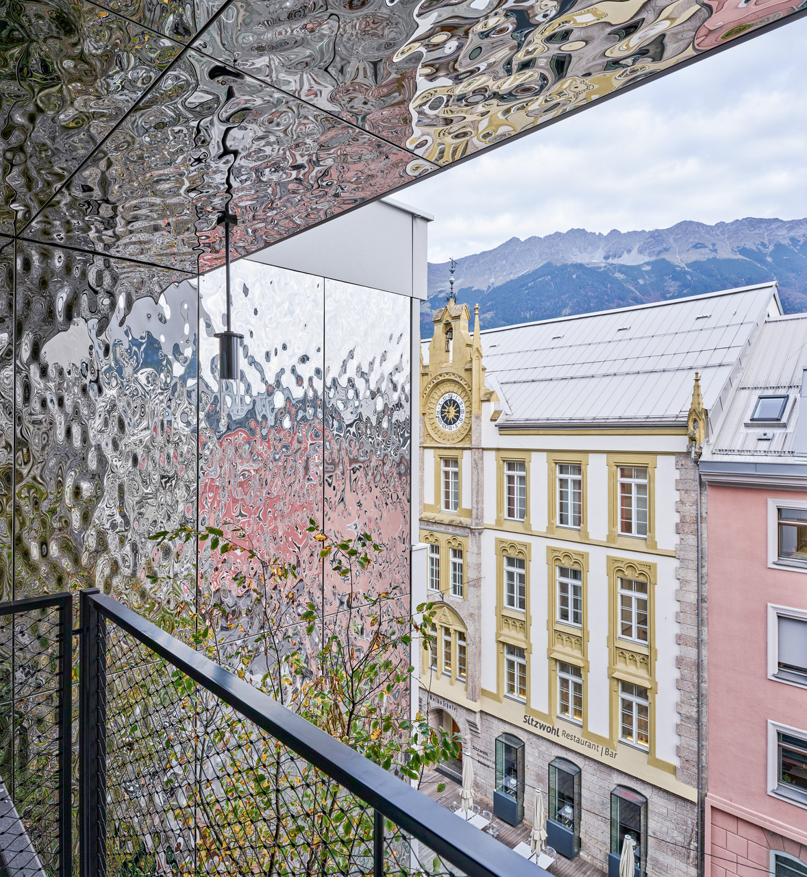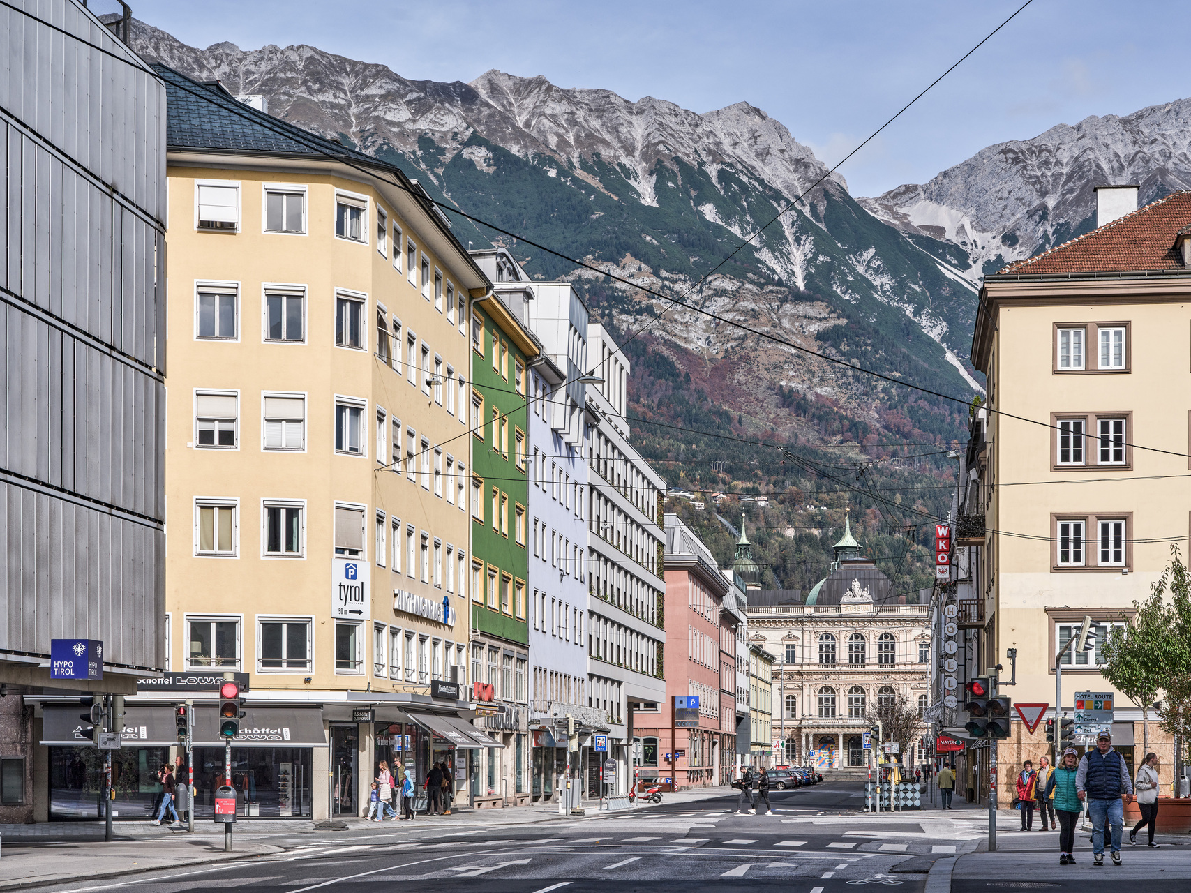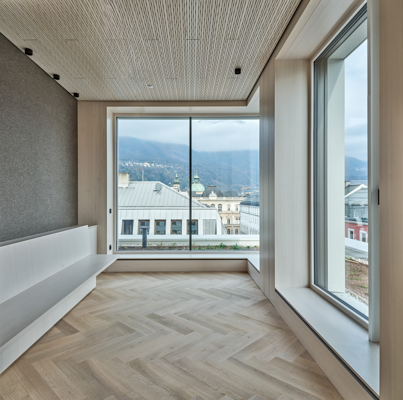 Das Ziel, ein besonders ressourcen- und umweltschonendes Gebäude zu realisieren, wurde durch die weitgehende Verwendung des Baustoffes Holz erreicht. Gleichzeitig ermöglichte die gewählte Holz-Hybrid-Bauweise mit einer die massiven Treppenhäuser umrahmenden Tragkonstruktion aus Holz in Verbindung mit Brettschichtholzdecken und -wänden einen relativ zügigen Bauablauf. So konnten die bis zu acht Meter langen Fassadenelemente vorgefertigt werden und mussten nur noch passgenau montiert werden. Träger und Stützen bestehen aus Furnierschichtholz (Buche), das bei geringem Eigengewicht eine hohe Tragfähigkeit gewährleistet. Durch die Kombination von Baubuche, Brettsperrholzplatten im Verbund mit Stahlbetonkernen und einer witterungs- und brandbeständigen Außenfassade konnte mit der Zentrale der Tiroler Versicherung das erste Holzhochhaus in Tirol errichtet werden. (Text: Claudia Wedekind)