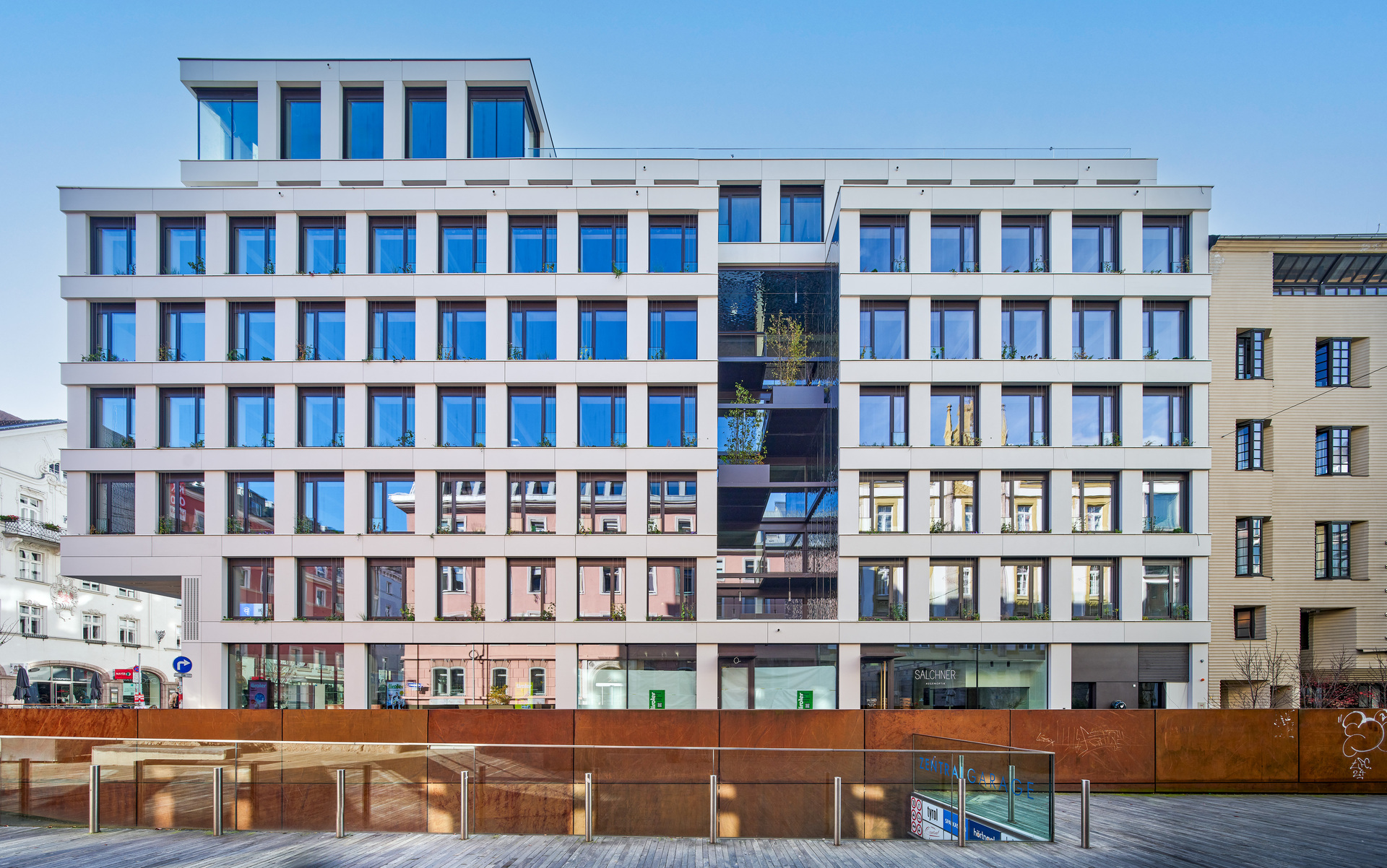 Das Siegerprojekt von DIN A4 Architekten – ein aus mehreren, miteinander verbundenen Volumen bestehender Komplex in Holz-Hybrid-Bauweise – konnte die Jury als stimmige städtebauliche Lösung an dieser wichtigen innerstädtischen Ecke überzeugen. Entlang der Wilhelm-Greil-Straße und der Gilmstraße nimmt der Neubau als Blockrandbebauung die Traufkanten der Nachbargebäude auf, hofseitig ergänzen zwei zueinander versetzte, höhengestaffelte Baukörper die Gesamtfigur. Mit einem zweigeschoßigen Einschnitt an der Straßenecke wird ein klar definierter Eingangsbereich für Kund:innen und Mitarbeiter:innen geschaffen, im Norden bildet ein über fünf Geschoße reichendes „Stadtfenster“ eine Zäsur der orthogonal strukturierten Fassade.