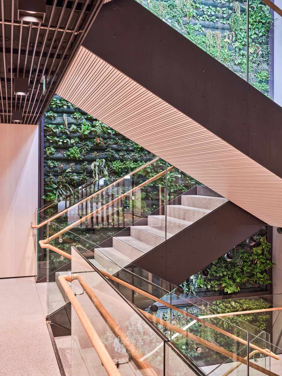 Im Erdgeschoß öffnet sich der Neubau über großzügige Verglasungen in den Straßenraum, dahinter liegen neben dem Foyer und dem zentralen Kundenbüro der Versicherung auch Mietflächen für Geschäfte. Direkt an diese Eingangsebene angebunden befinden sich im ersten Obergeschoß Büros für die Kundenberatung, darüber auf vier ident konzipierten Ebenen Büroflächen, die in Form einer Open-Space-Struktur mit Kommunikationszonen und Sichtverbindungen organisiert sind. Besprechungs- und Schulungsräume sowie die Vorstandsbüros sind im leicht zurückversetzten 6. Obergeschoß untergebracht, ganz oben liegen ein Veranstaltungssaal sowie die Cafeteria mit Wintergarten und großem Dachgarten. Das Herzstück der logisch und übersichtlich gegliederten Arbeitswelt bildet ein zentraler Luftraum, der mit einer innenliegenden, begrünten Wand alle Geschoße verbindet. Dem Konzept einer innerstädtischen Grüninsel folgend gibt es außerdem einen Gartenbereich im Hof, mehrere Grünflächen auf Terrassen und Dächern sowie eine vertikale Fassadenbepflanzung.