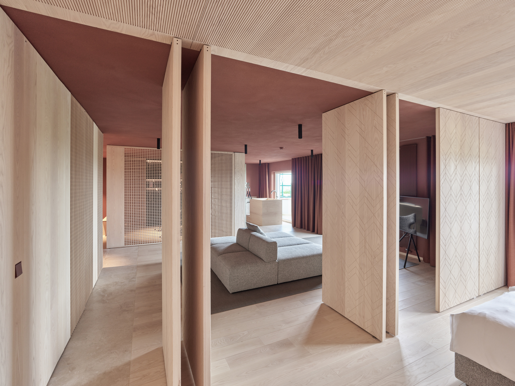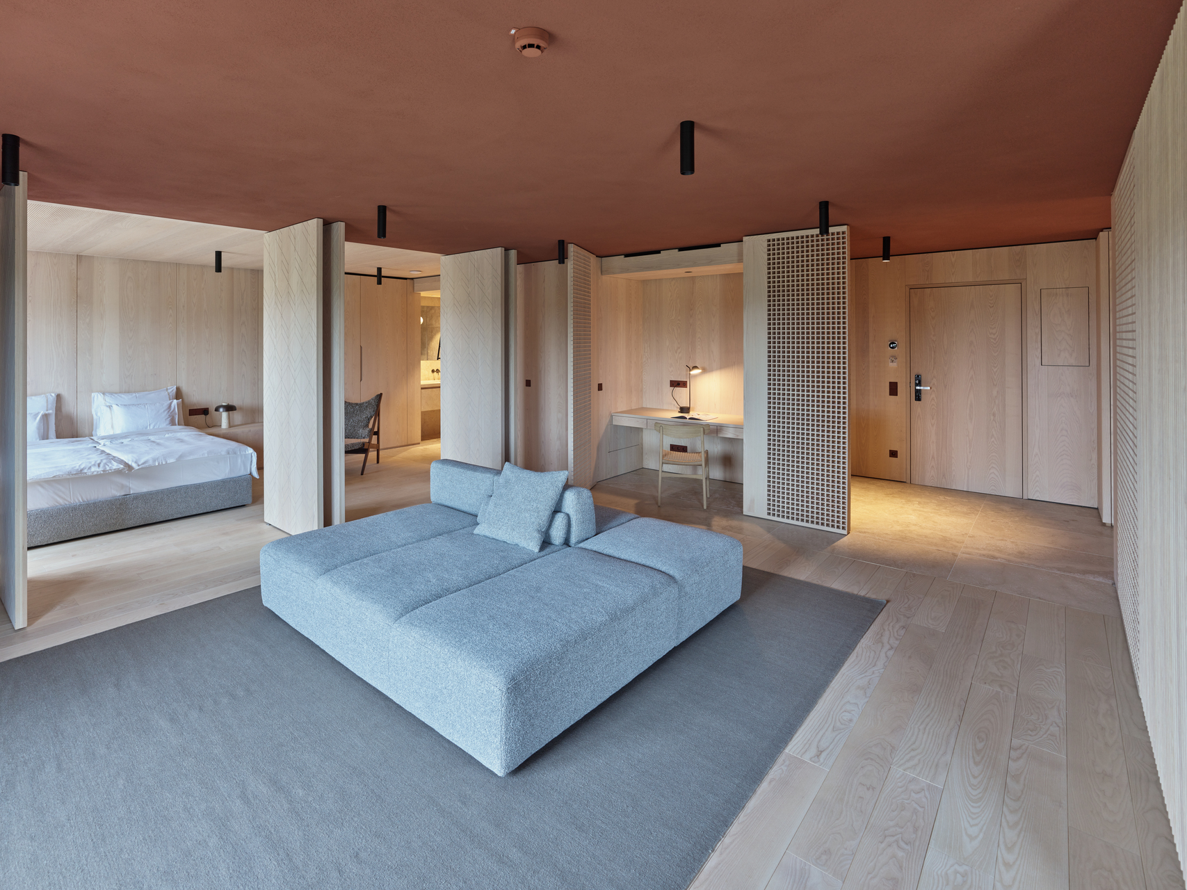 Die Suiten, die sich aus der Zusammenlegung ursprünglich kleinerer klassischer Zellenzimmer addieren, sollen sowohl funktional als auch gefühlt offene, fließende Räume sein, deren Teilungs- und Nutzungsmöglichkeiten zugeschaltet oder geöffnet werden sollen. Eine Badewanne im Wohnzimmer, ein ausblendbarer Arbeitsbereich, ein Sofa zum darauf Einschlafen, eine Sportwand aus Holz und eine versteckte Kitchenette stellen die variablen Elemente der Bespielung der Suiten dar. Raumhohe Pivottüren ermöglichen ein individuelles Öffnen/Schließen des Schlafraums zum Wohnraum.