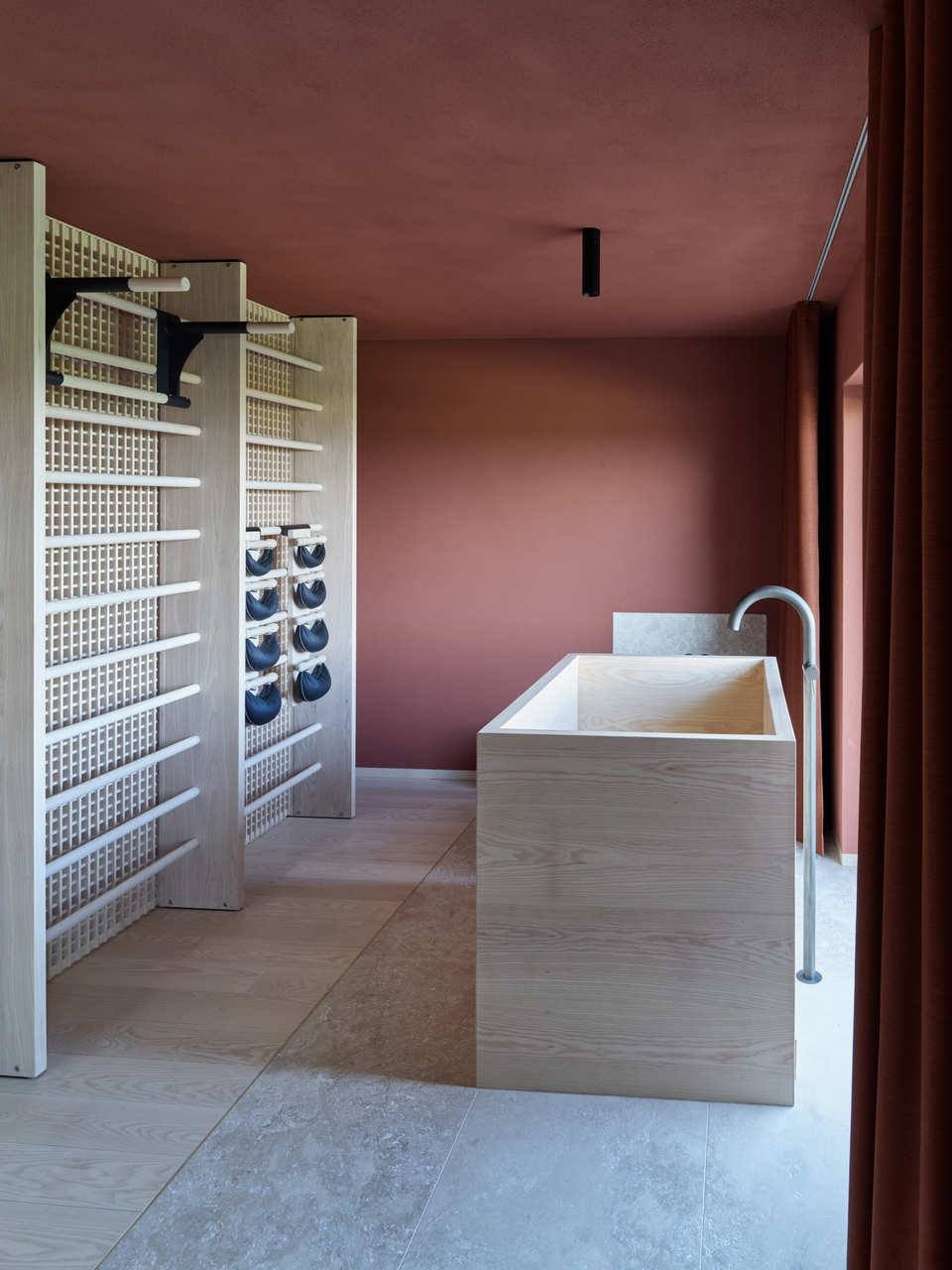 In der großen Suite wurde ein Ofuro, ein rechteckiger japanischer Badezuber in einer der drei Fensterachsen aufgestellt. Von hier hat man einen hervorragenden Fernblick in die weite Landschaft ebenso wie in die Tiefe des großzügigen Hotelzimmers. Neben dem separaten zusätzlichen Reinigungsbereich besteht hier die Möglichkeit mit verschiedenen Sport- und Turngeräten den Einklang von Körper und Seele zu pflegen. (Text: Architekt:innen, gekürzt)