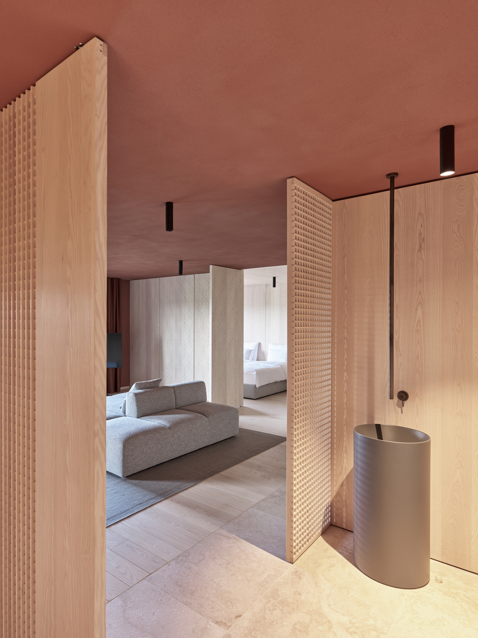 Der Eintritt in die Suite erfolgt über einen kleinen, semitransparent vom restlichen Großraum getrennten Vorraum. Hier befindet sich eine Sitzbank und ein stiller Brunnen als Filter zwischen geselligem Gemeinschaftsleben und privatem Rückzug. Zusätzlich zu großzügigem Stauraum gibt es lange, raumbestimmende Bänke und Ablageflächen, auf denen man ebenso Platznehmen wie Blumenvasen aufstellen oder Zeitungen liegen lassen kann. Der berühmte „Knitting Chair“ lädt zum Lesen eines guten Buches oder zum Ablegen seiner Kleidung ein. Neben einer raffinierten Lichtplanung ergänzen individuelle Einzelleuchten der Lichtkünstlerin Megumi Ito das Raumerlebnis.