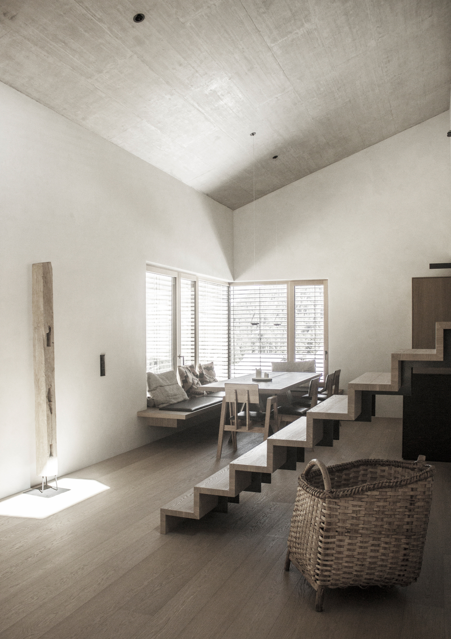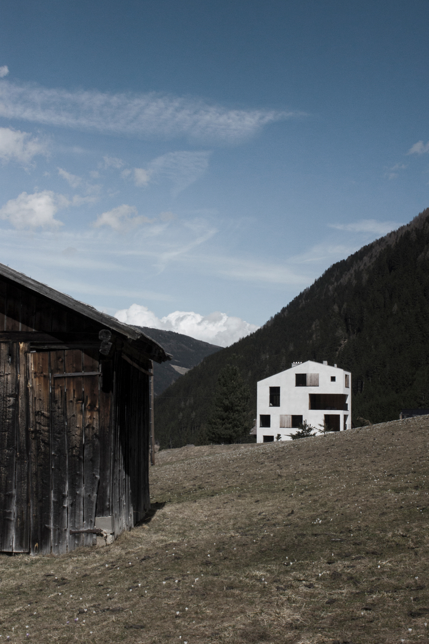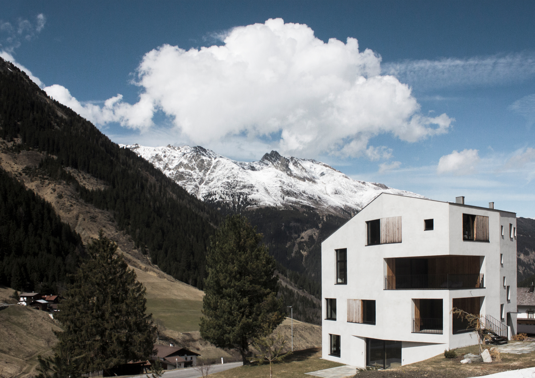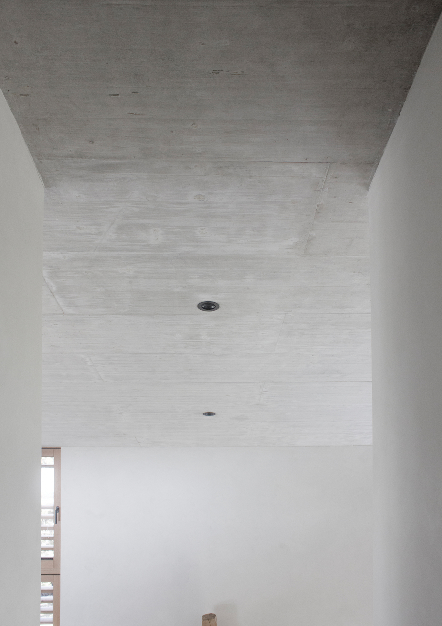 Bei der Materialwahl des Massivbaus wurde auf Reduktion gesetzt. Handgefertigte Betondachplatten, ein aufwendiges Putzsystem in verschiedenen Grautönen und sparsame Holzapplikationen bei denen die natürliche Vergrauung in das Konzept einbezogen wurde, prägen das äußere Erscheinungsbild. Im Inneren dominieren Eichenholz, Sichtbeton und naturbelassene Putzflächen, den Ausbau der Wohnungen übernahm der Bauherr und Inhaber einer Montagetischlerei selbst. Die Wärmeversorgung des Gebäudes erfolgt über eine Pelletheizung, auf weitere Haustechnik wurde verzichtet. (Text: Claudia Wedekind, nach einem Text des Architekten)
