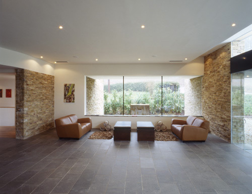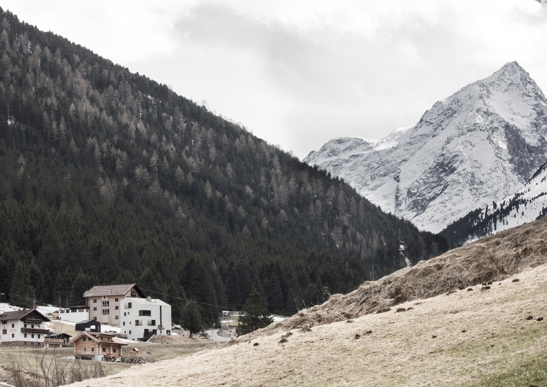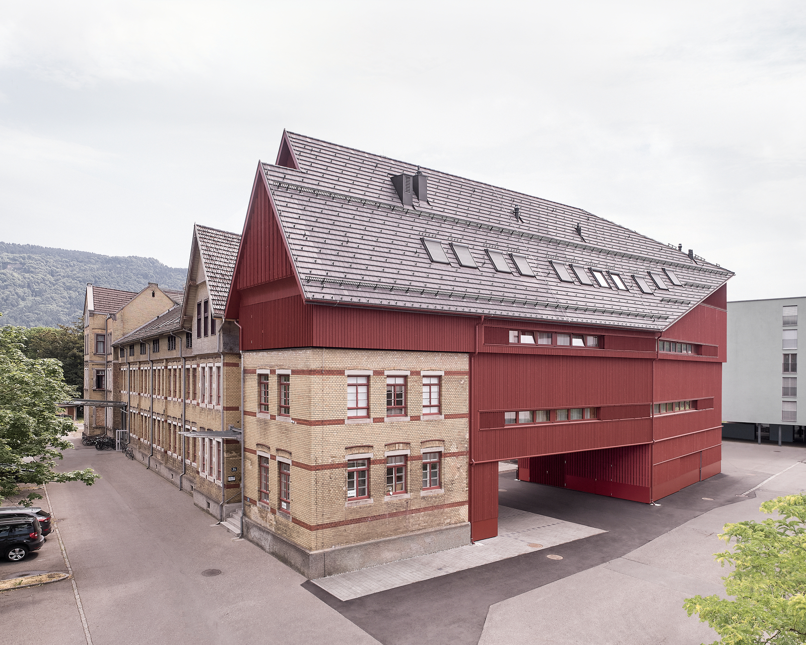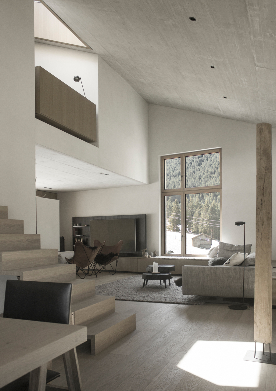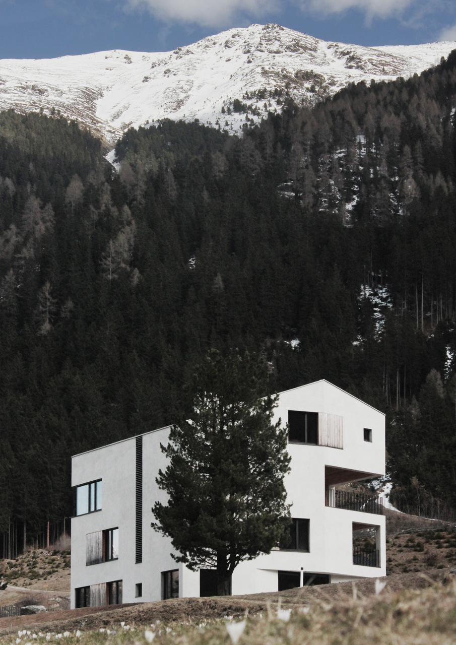 Bei der Materialwahl des Massivbaus wurde auf Reduktion gesetzt. Handgefertigte Betondachplatten, ein aufwendiges Putzsystem in verschiedenen Grautönen und sparsame Holzapplikationen bei denen die natürliche Vergrauung in das Konzept einbezogen wurde, prägen das äußere Erscheinungsbild. Im Inneren dominieren Eichenholz, Sichtbeton und naturbelassene Putzflächen, den Ausbau der Wohnungen übernahm der Bauherr und Inhaber einer Montagetischlerei selbst. Die Wärmeversorgung des Gebäudes erfolgt über eine Pelletheizung, auf weitere Haustechnik wurde verzichtet. (Text: Claudia Wedekind, nach einem Text des Architekten)
