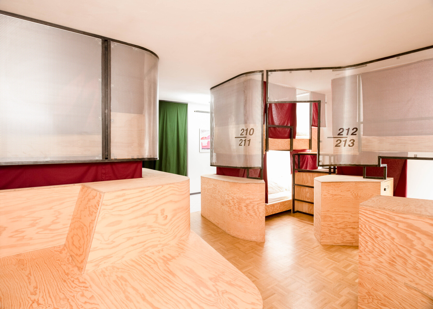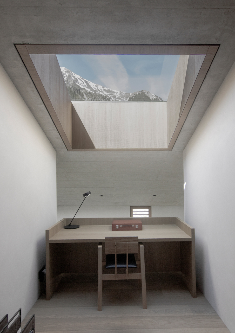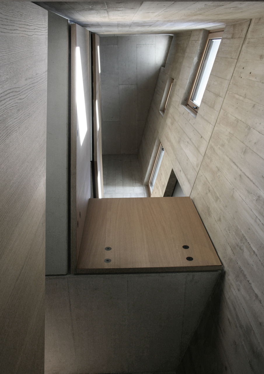 Der Zugang zum Haus erfolgt über einen abgesenkten Hof, der von den unter Geländeniveau liegenden Carports für die vorgeschriebenen Stellplätze flankiert wird. Diese Eingangsebene dient als Servicegeschoß mit Haustechnik, Lager- und Abstellflächen für Sportgeräte. In den vier Obergeschoßen befinden sich drei Wohnungen, von denen die oberste als Maisonette ausgebildet ist. Die vertikale Erschließung der Apartments erfolgt über ein in Sichtbeton ausgeführtes Stiegenhaus – ein Aufzugsschacht steht für eine optionale Nachrüstung zur Verfügung.
