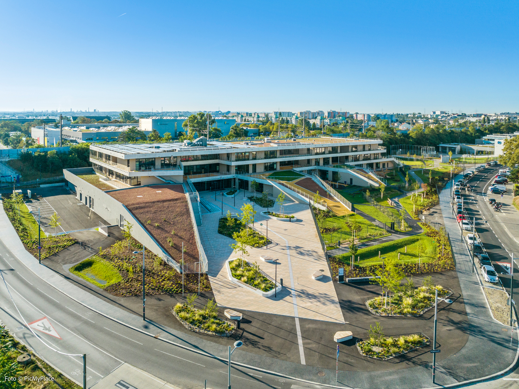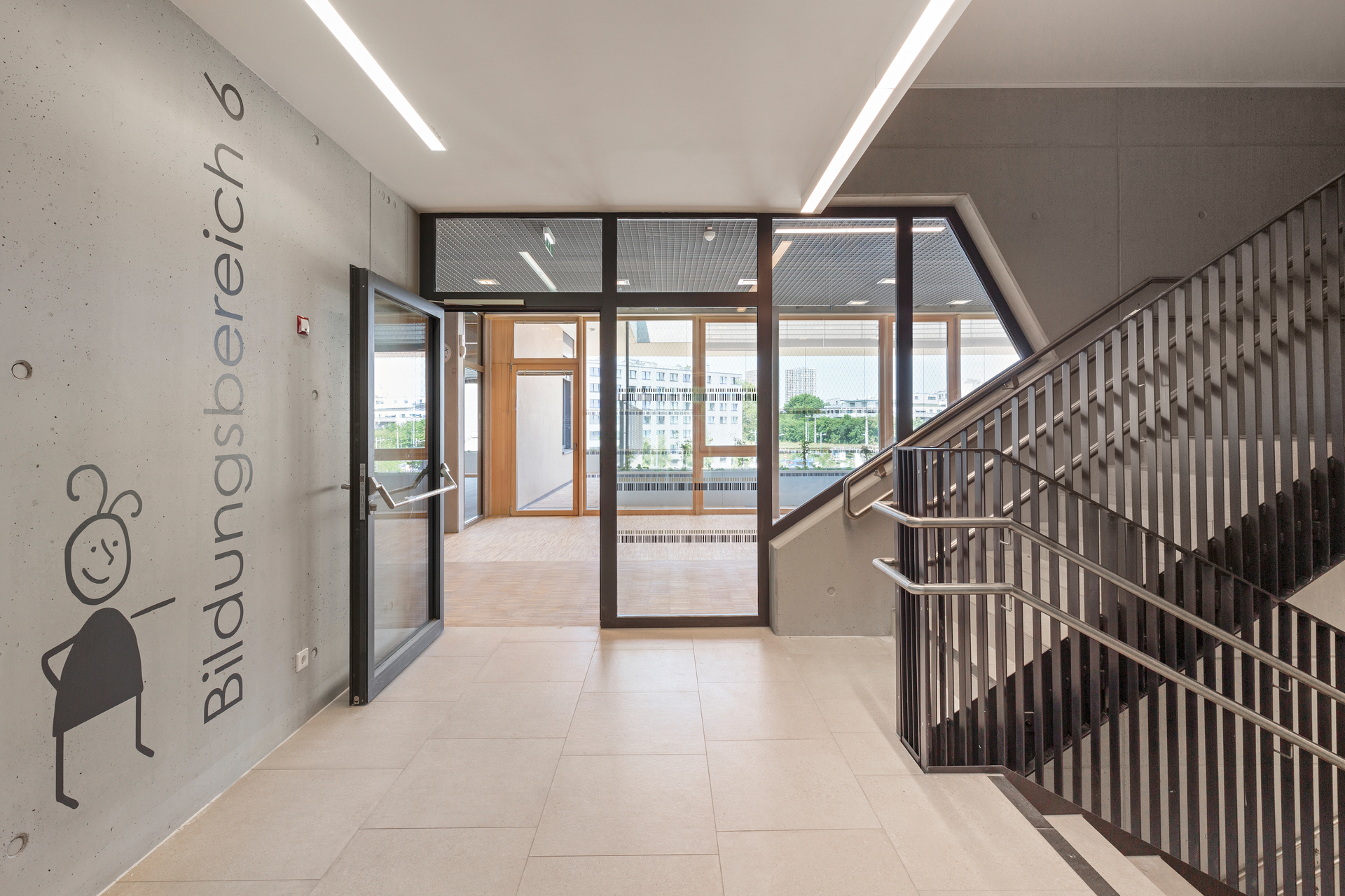 Als gesamtheitlich integrative ganztägige Bildungseinrichtung für Kinder von 0-10 Jahren beinhaltet der Bildungscampus 33 Bildungsräume. Je 6 davon sind in Gruppen, bzw. Bildungsbereichen organisiert. Kleinere und ältere Kinder kommen hier zusammen. Auch die Team- und Sozialräume der Pädagoginnen sind jeweils Bestandteile der Bildungsbereiche. Sport-, Therapie-, Kreativ-, und Speiseräume, Freiflächen und ein Veranstaltungssaal ergänzen das Angebot. Die Sporthalle ist um ein Geschoss in die Erde eingegraben.
