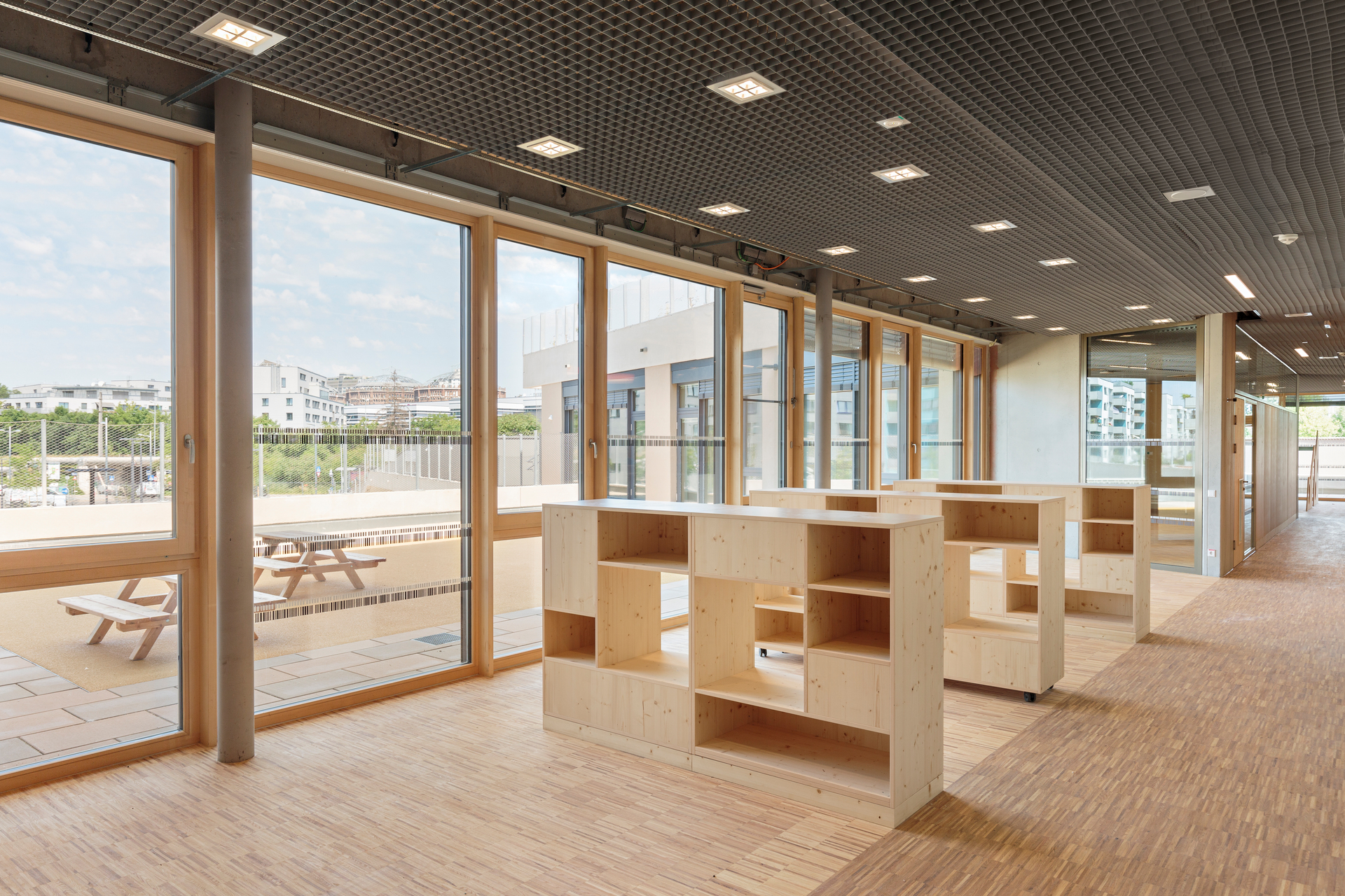 Zwischen den einzelnen Funktionseinheiten gibt es viele transparente Verbindungen, die allen Nutzenden Einblick in die angrenzenden Raumzonen gewähren und auch den Kleinsten eine sehr einfache Orientierung ermöglichen. Alle können sich stets als Teil des größeren Ganzen empfinden.