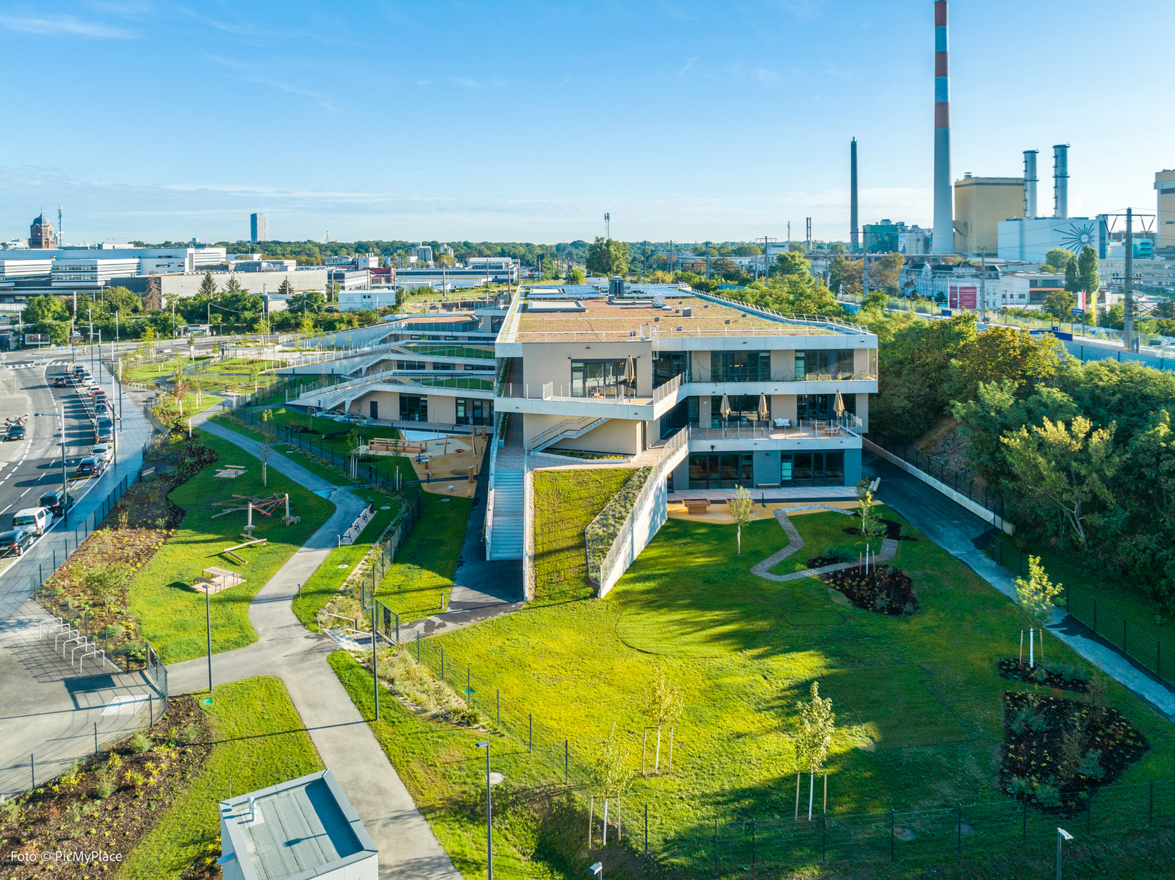 Wärme und Kältebedarf werden zur Gänze vor Ort über Erdwärmesonden aus dem Grundwasser gedeckt, Strombedarf teilweise über die Photovoltaik auf dem Dach; die Hälfte der Dachfläche steht noch zu deren Ausbau zur Verfügung. Der Plusenergiestandard steht damit in Aussicht. (Autor: Achim Geissinger, nach einem Text der Architekten)