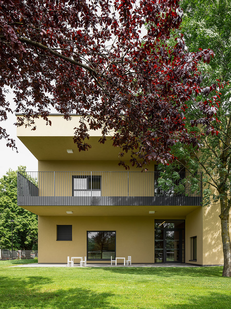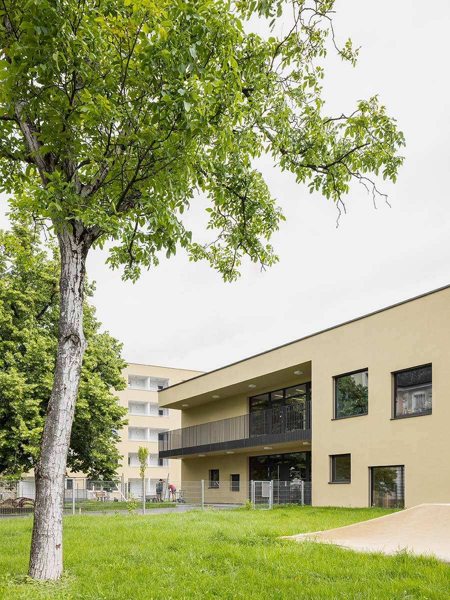 Bei der Positionierung der Gebäude wurde darauf geachtet, dass ein möglichst großer Teil des alten Baumbestands erhalten werden konnte. Für die Bäume, die gefällt werden mussten, wurden Ersatzpflanzungen vorgenommen, bestehende Gehölze entlang der Grundgrenze wurden nachverdichtet. Die Bäume wirken als grüner Filter und sorgen für die Beschattung der Freiflächen. Im Rahmen von Kunst am Bau entwickelte Margit Greinöcker das partizipative Langzeitprojekt „Das kleine Feld“, Peter Androsch gestaltete die Kontrastbeklebung der Fensterflächen. (Text: Tobias Hagleitner, nach einem Text der Architekten/Bauherrschaft)