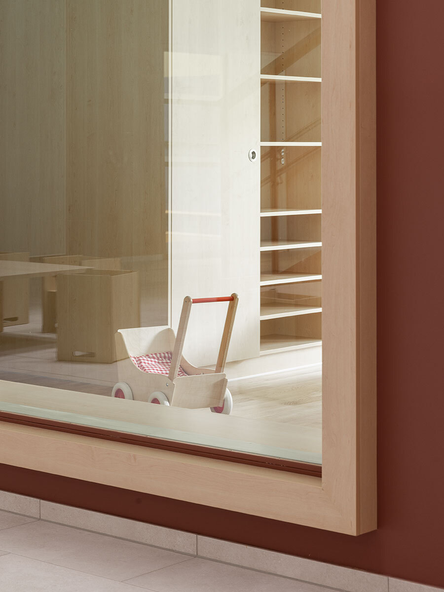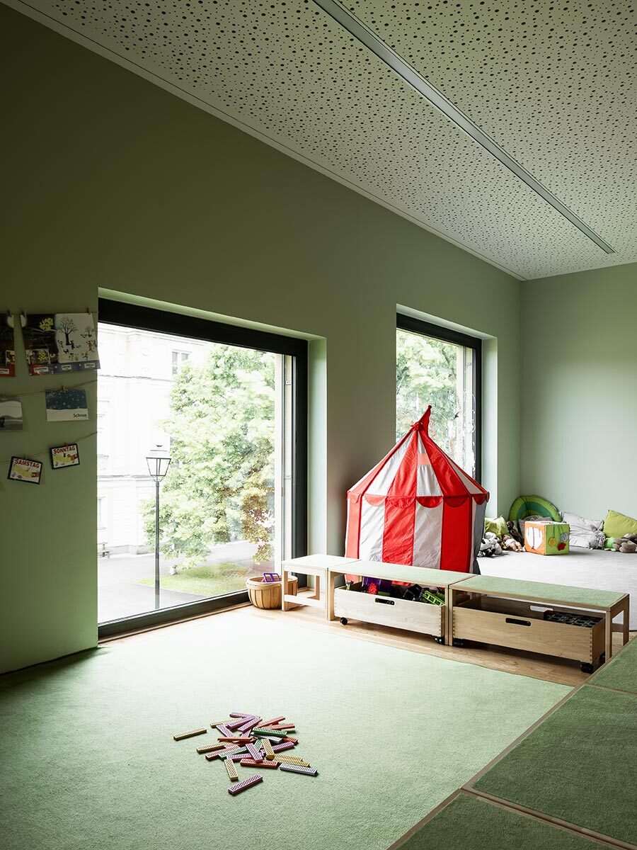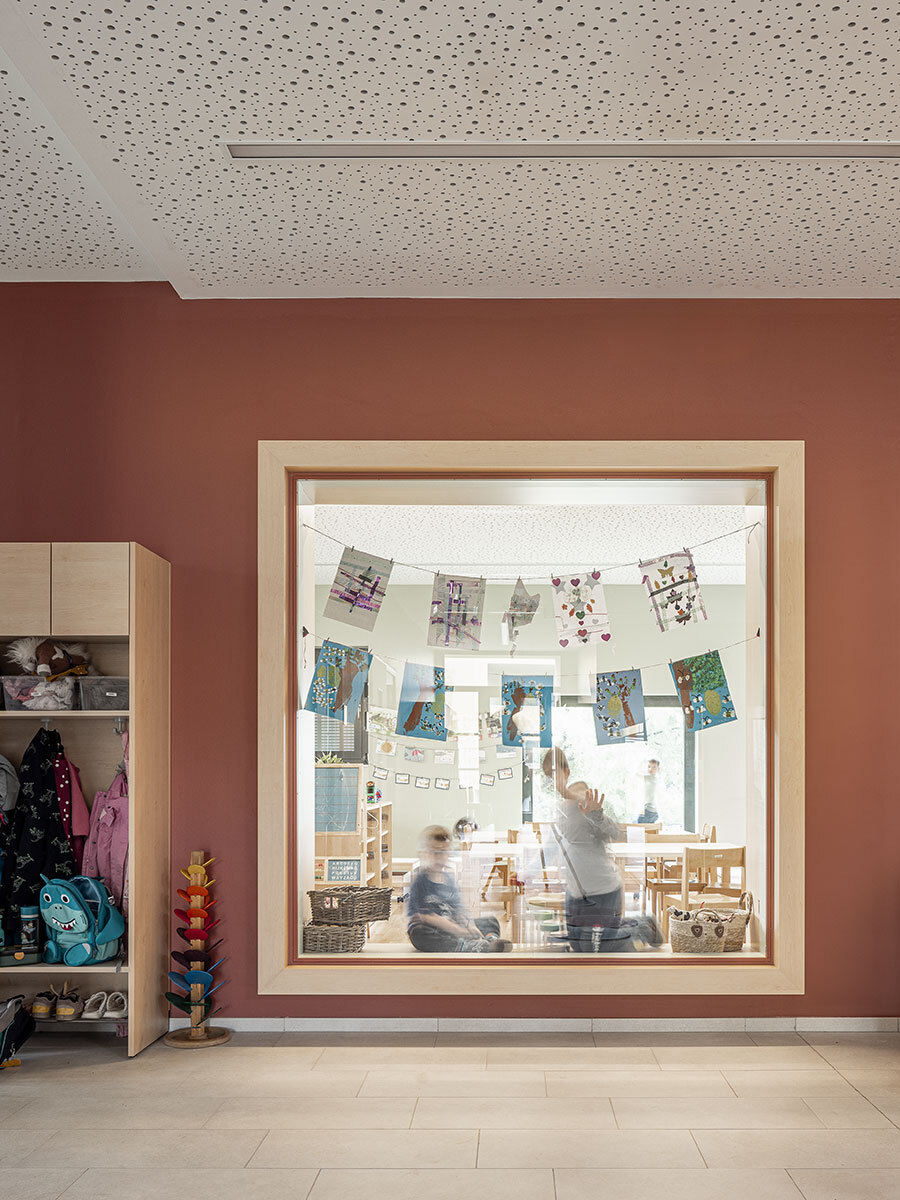 Der zweigeschossige Kindergarten zeigt innen wie außen seine klare Gliederung. Jeweils vier mühlradartig zueinander arrangierte „Boxen“ bilden ein Geschoss. Der lichtdurchflutete Raum dazwischen dient zur Erschließung, schafft Verbindungen zwischen innen und außen und ergibt im Kern des Gebäudes ein helles, zweigeschossiges Atrium. Die Gruppenräume sind in hellem Grün gestaltet, im Atrium bestimmt ein warmer Rotton das Erscheinungsbild.