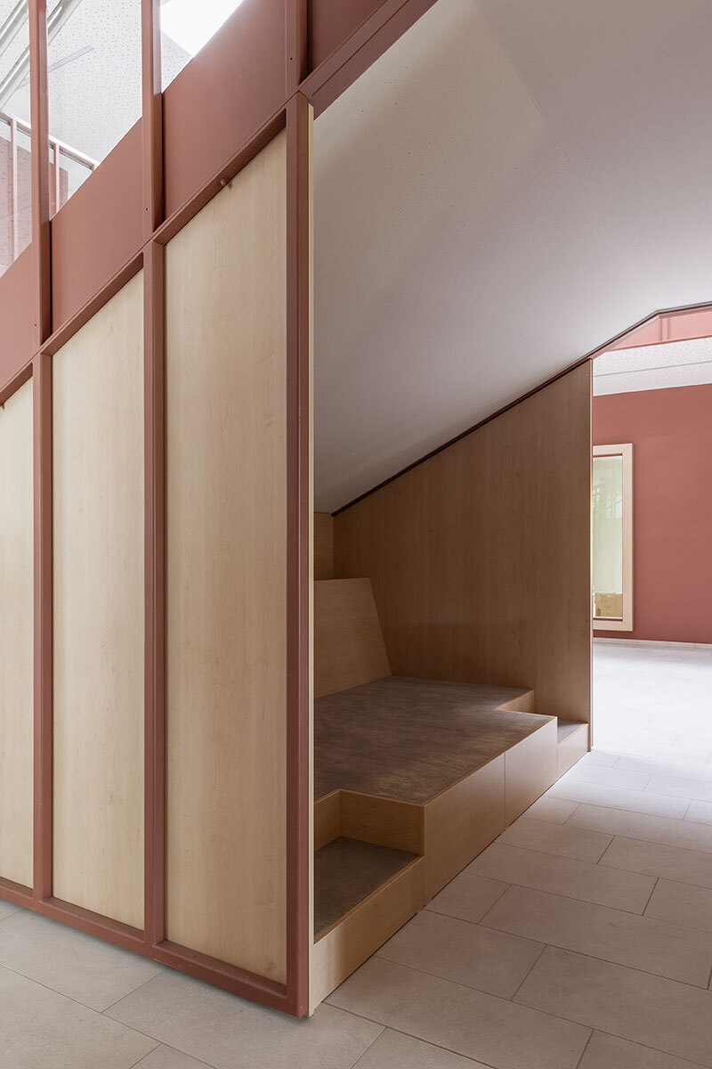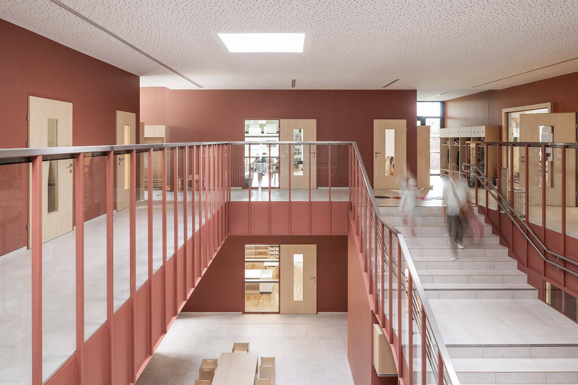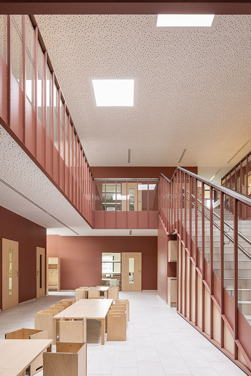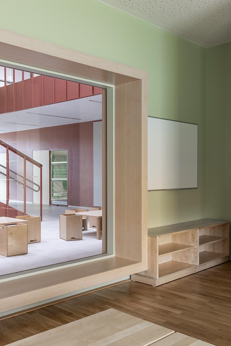 Der zweigeschossige Kindergarten zeigt innen wie außen seine klare Gliederung. Jeweils vier mühlradartig zueinander arrangierte „Boxen“ bilden ein Geschoss. Der lichtdurchflutete Raum dazwischen dient zur Erschließung, schafft Verbindungen zwischen innen und außen und ergibt im Kern des Gebäudes ein helles, zweigeschossiges Atrium. Die Gruppenräume sind in hellem Grün gestaltet, im Atrium bestimmt ein warmer Rotton das Erscheinungsbild.