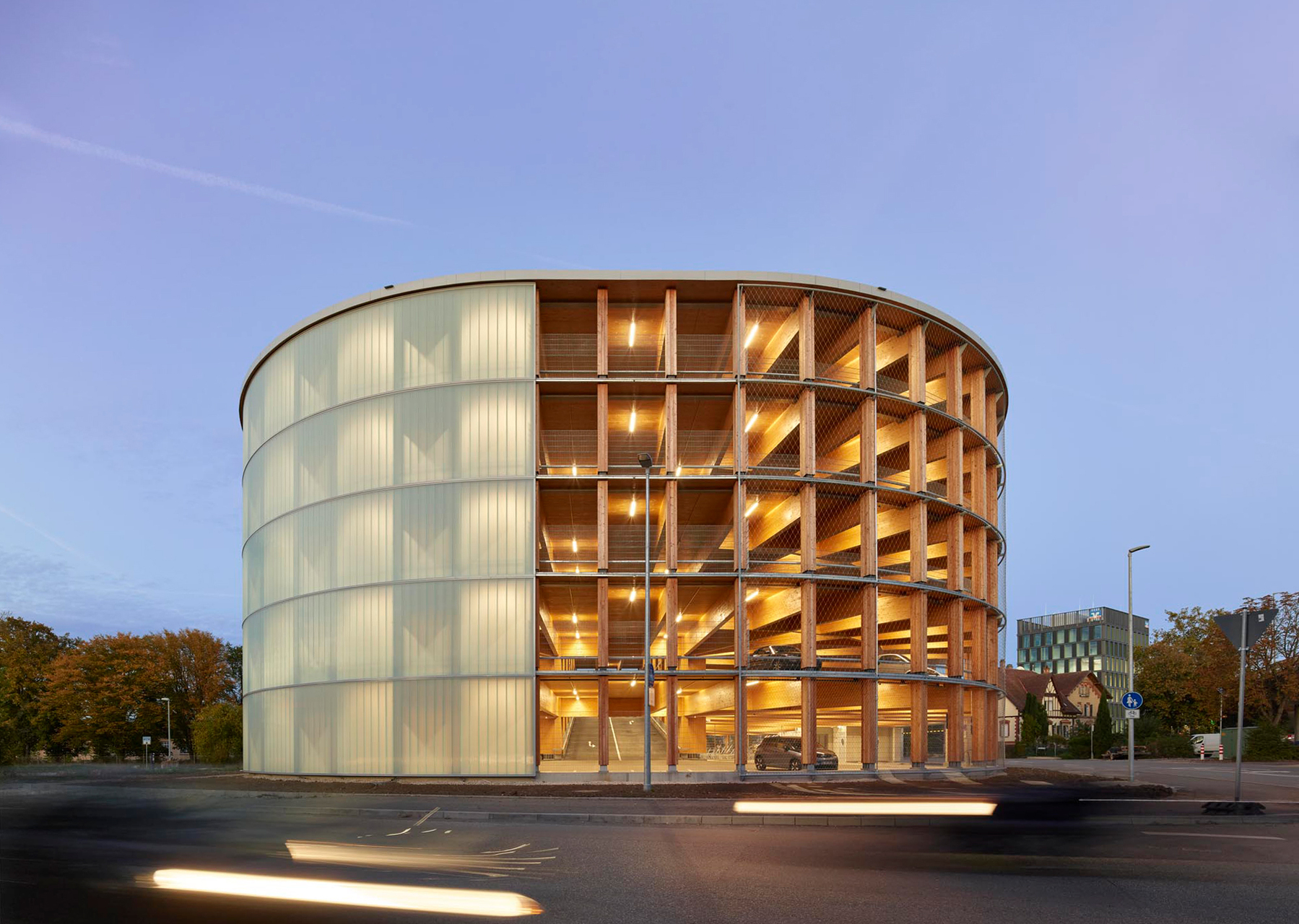 Das Parkhaus ist ein Projekt der Internationalen Bauausstellung 2027 StadtRegion Stuttgart (iba’27) und fällt durch seine ungewöhnliche ovale Form auf, die sich aus der Geometrie des Grundstücks herleitet und die größte Flächeneffizienz ermöglicht. Hohe Nutzerfreundlichkeit ergibt sich durch die Stützenfreiheit der Parkgeschosse und die zentral im Innern angelegte Rampenanlage. Die symmetrisch an den Längsseiten des Parkhauses außen sitzenden, offenen Treppenhäuser ermöglichen eine klare Orientierung sowohl von außen, als auch von innen.