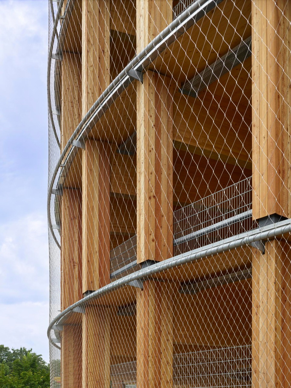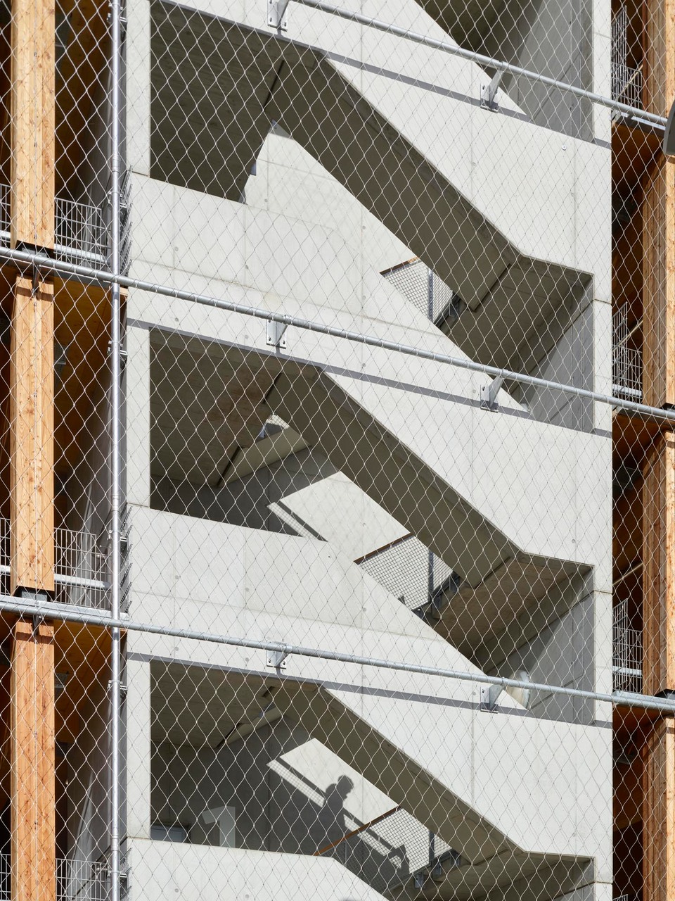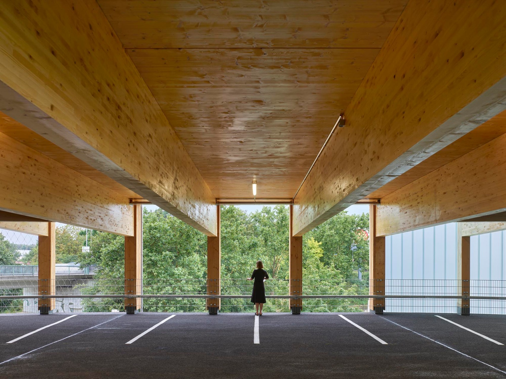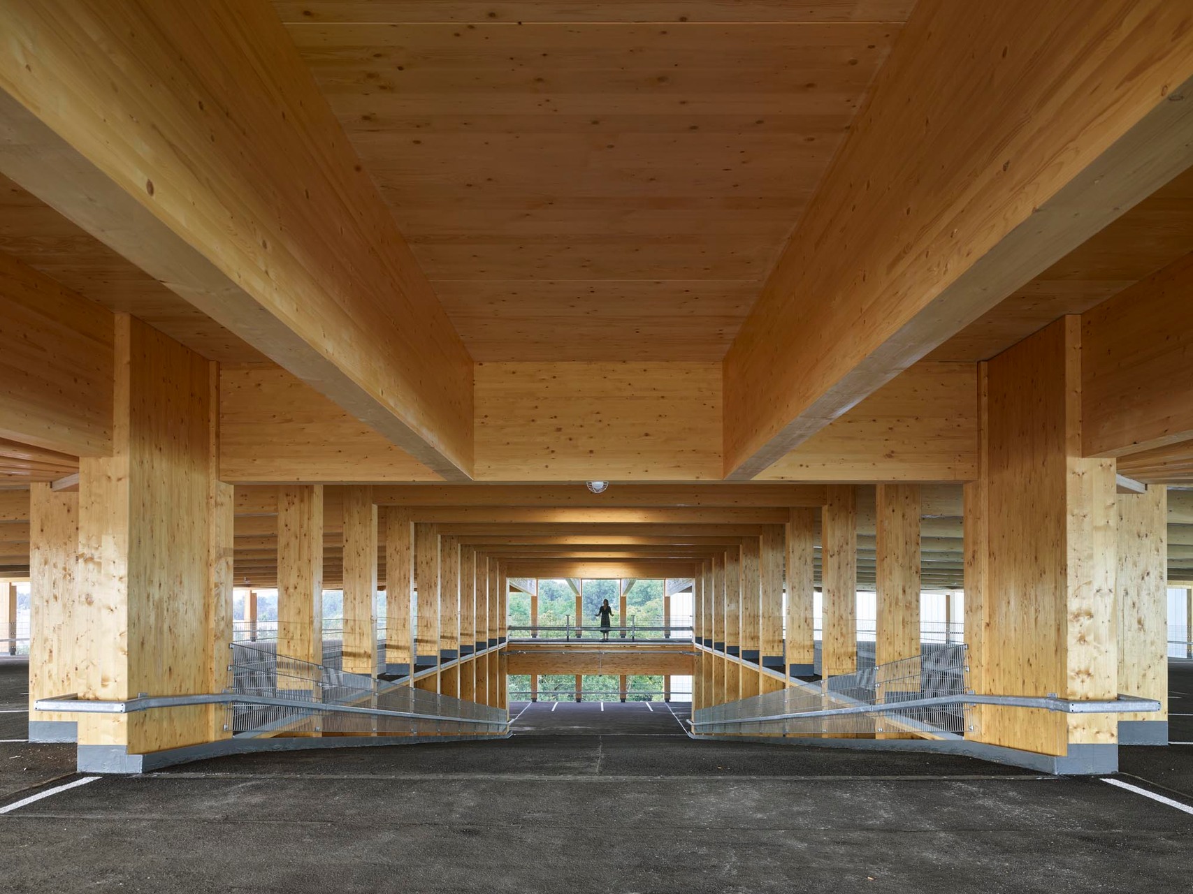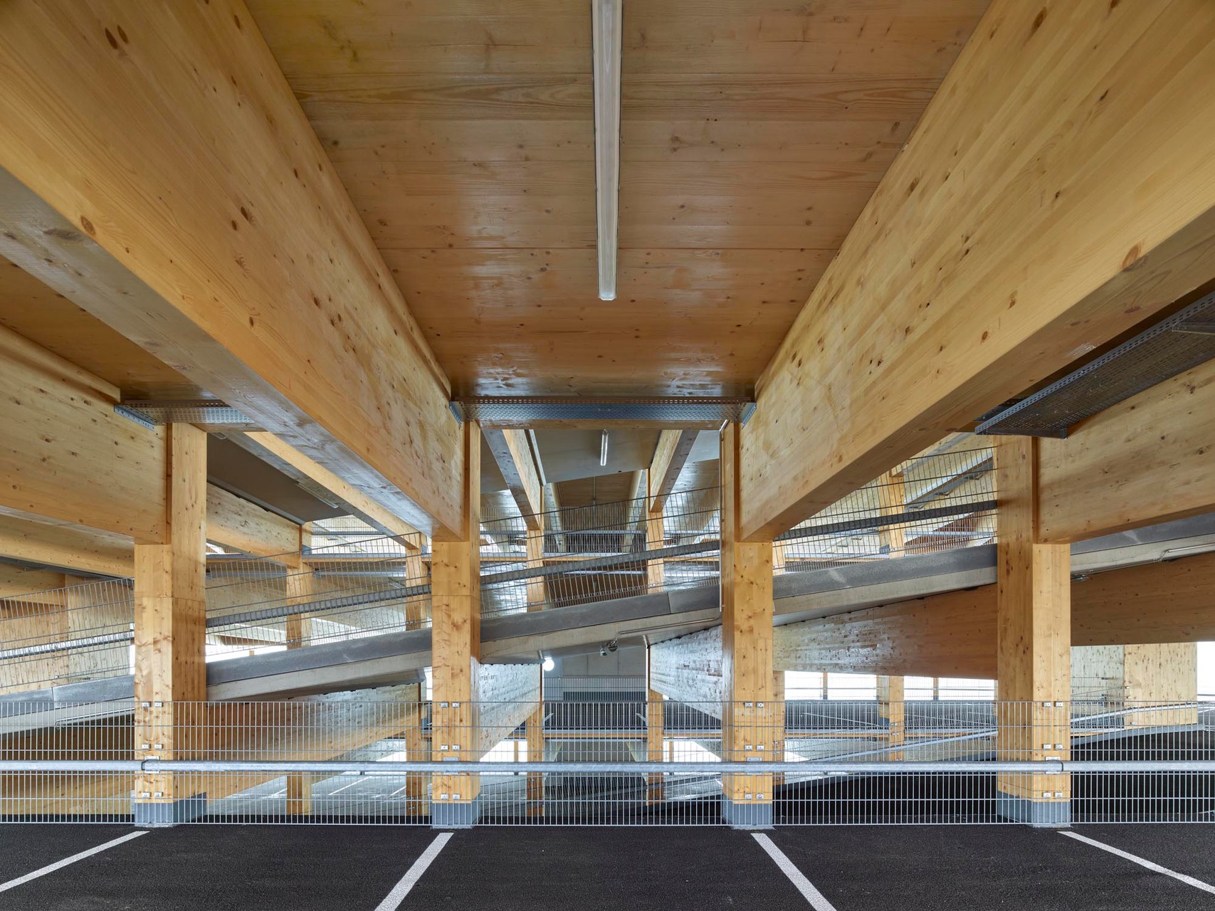 Die Tragstruktur besteht aus Brettsperrholzdecken, die als Deckenscheiben ausgebildet sind, und, aus Brettschichtholzstützen und -trägern. Aus statischen und brandschutztechnischen Gründen sind die Rampen als Betonfertigteile und die beiden Fluchttreppenhäuser, die das Haupttragwerk aussteifen, in Stahlbeton ausgeführt.