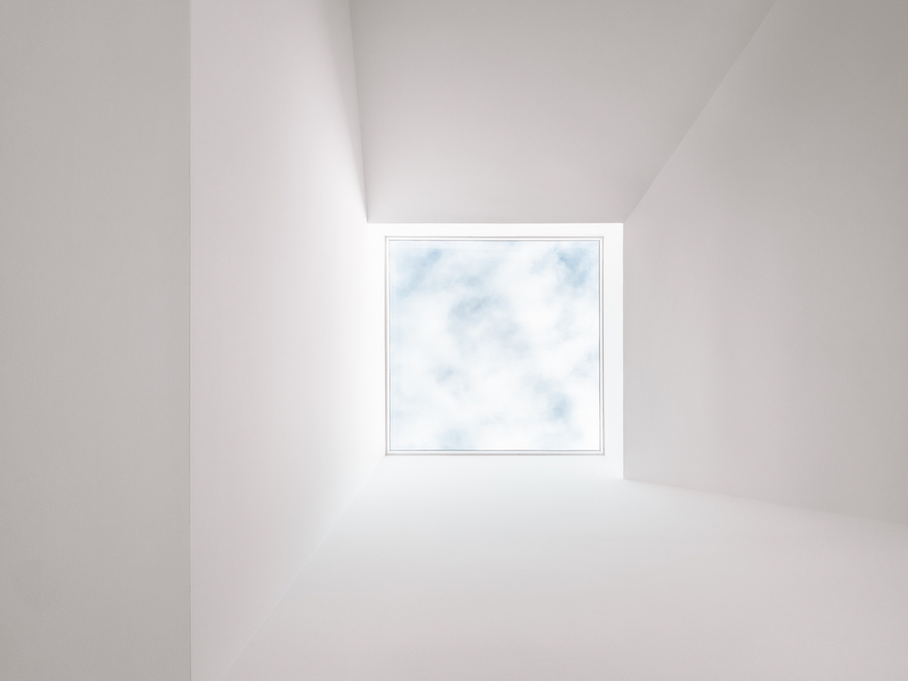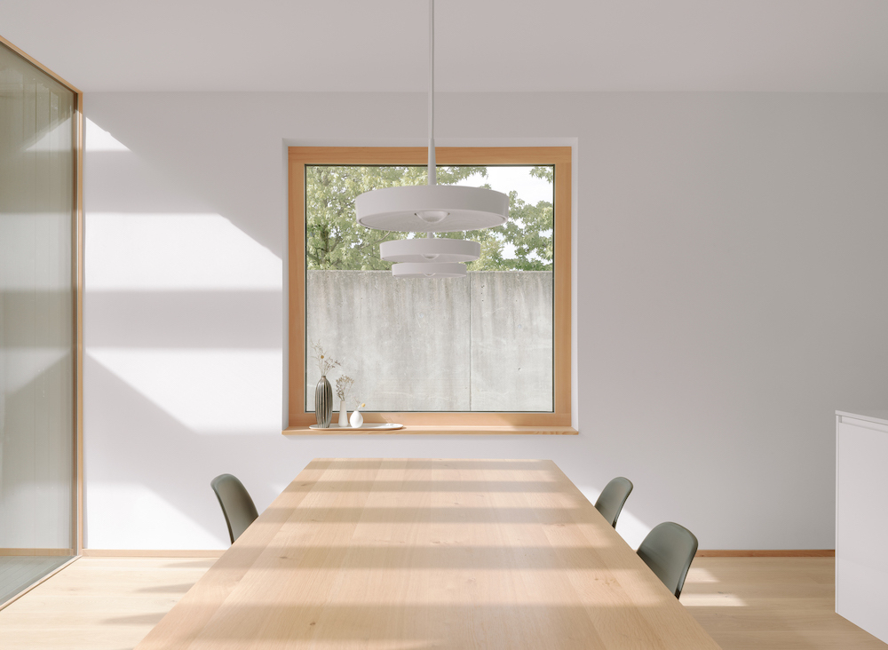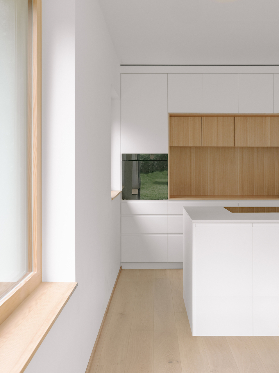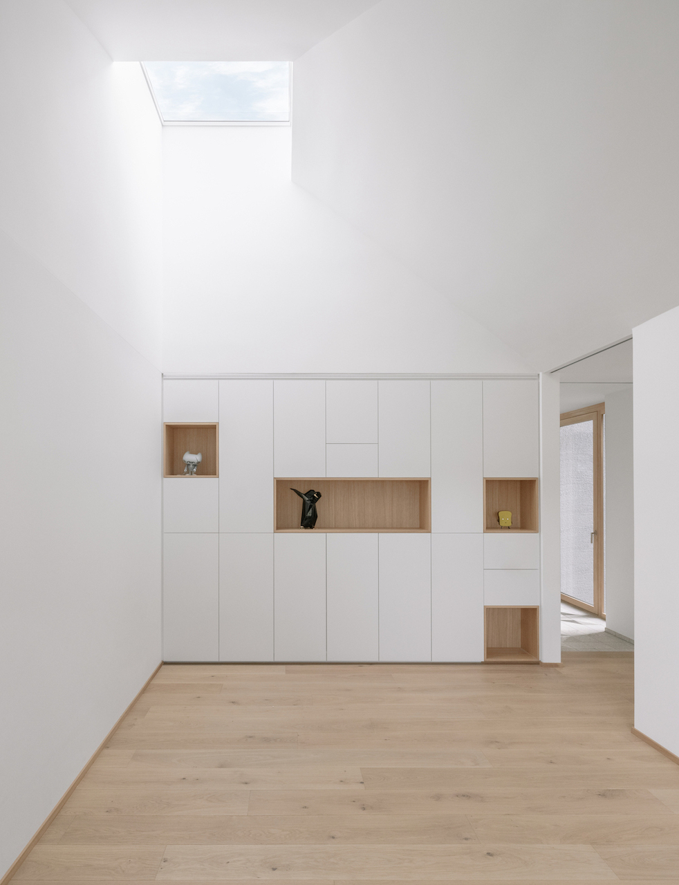 Das Innere ist hingegen in abstraktem Weiß gehalten, wodurch auch das Oberlicht, das durch die Dachpyramide in den Wohnraum fällt, besonders gut zur Geltung kommt. Der Architekt plante auch das Mobiliar in seiner sehr reduzierten Material- und Farbpalette aus weißen Kastenwänden, die komplett zurücktreten, hellem Holz für integrierte Garderoben und Nischen, Parkettboden und große Fenster, die den Blick ins Grüne rahmen.