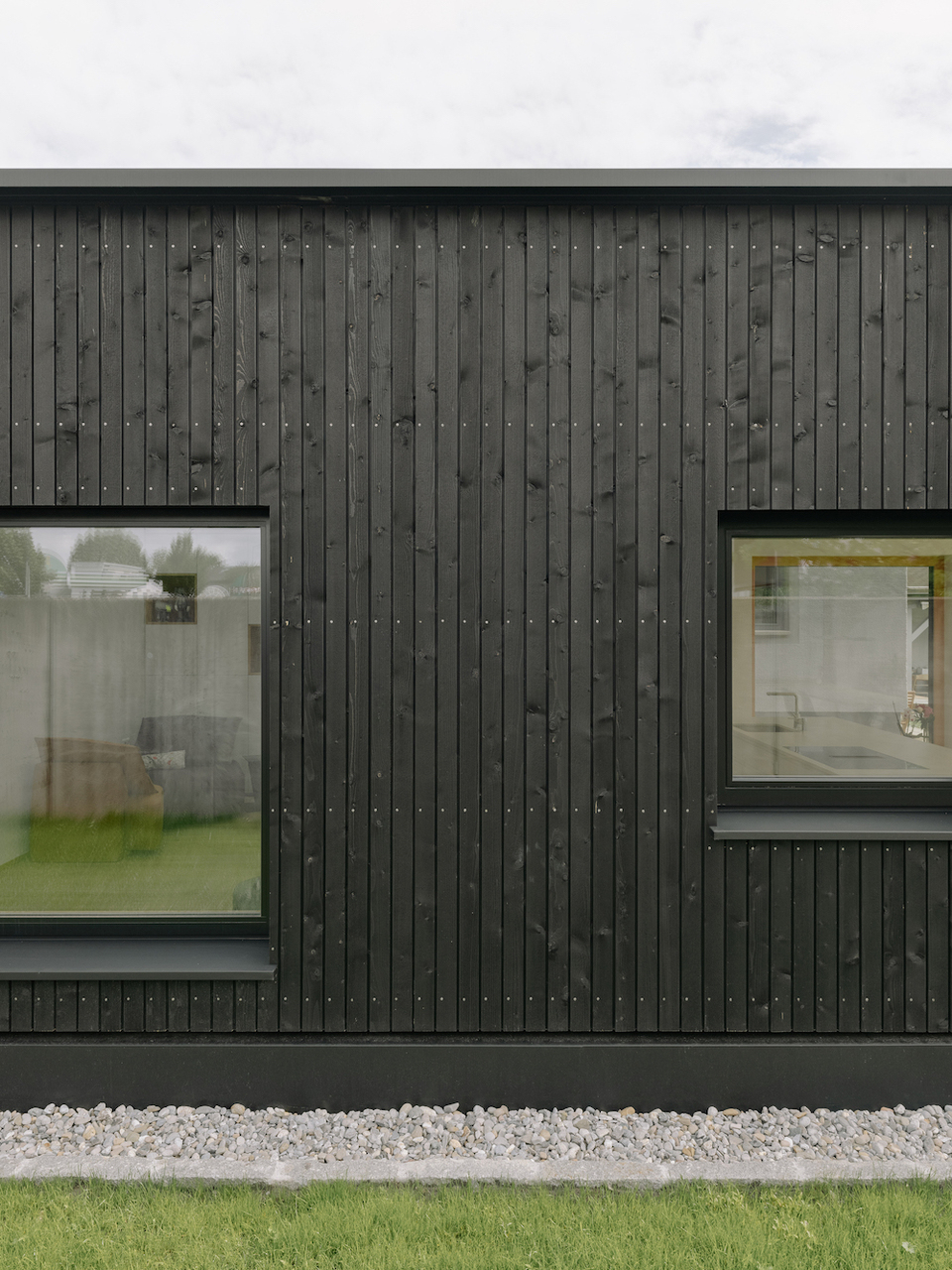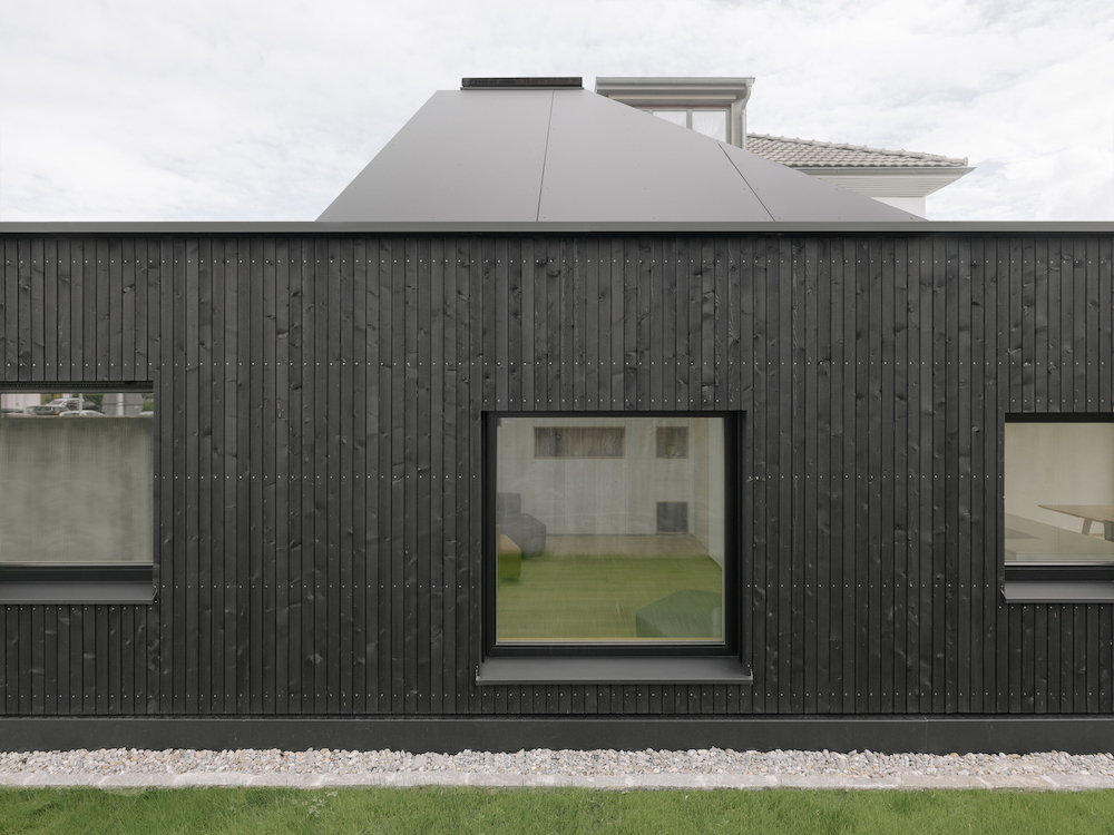 Der eingeschossige Zubau mit Dachpyramide bildet mit seiner dunkel gebeizten Fichtenfassade einen deutlichen Kontrast zum weißen, massiven Mehrparteienhaus und stört auch die Maßstäblichkeit der umgebenden Siedlungsstruktur nicht. Der Zubau ist im Süden angebaut, wirkt so auch als Schallschutz vor dem Straßenlärm und schafft einen attraktiven, geschützten Gartenraum.