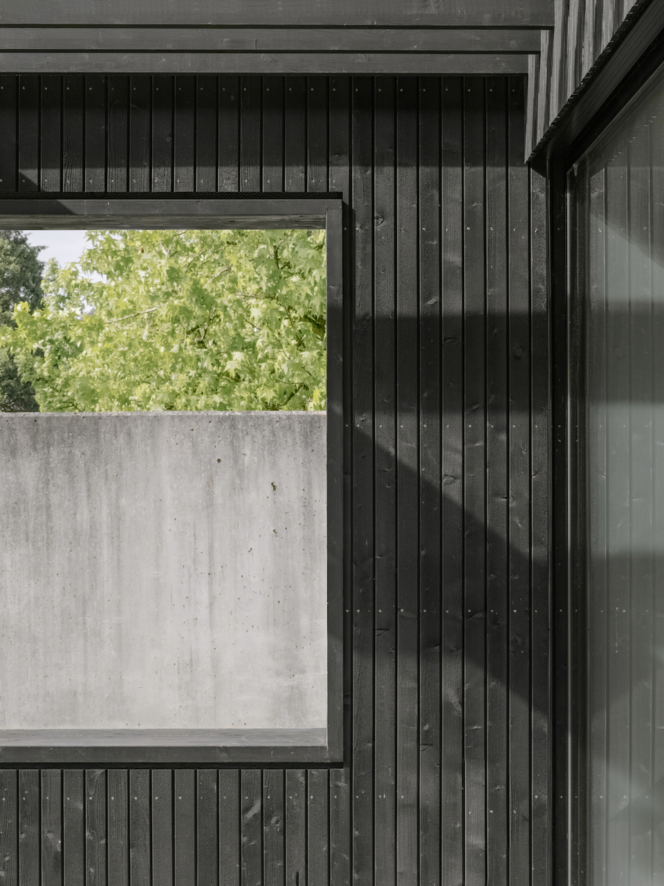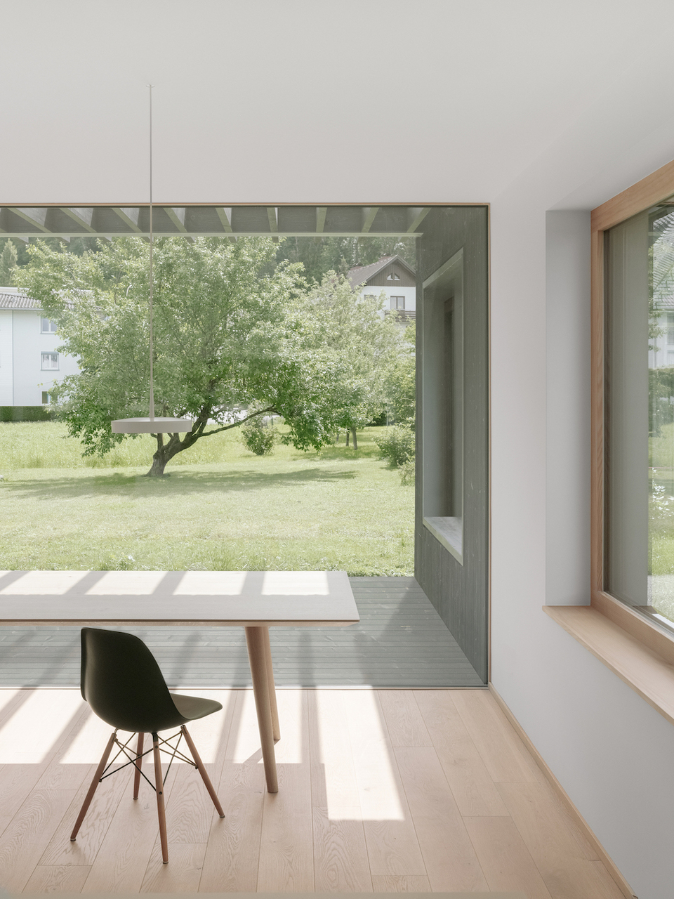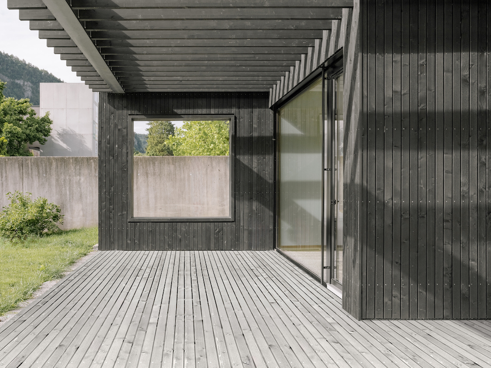 Der Zubau bietet auch atmosphärisch in seiner freiraumbezogenen Leichtigkeit einen Kontrast zum Bestand. Er nimmt ein Büro, den Wohnraum und die Wohnküche auf, die sich im Osten zu einer großen, gedeckten Terasse und im Norden zu einem geschützten Freiraum an der Nahtstelle zum Bestand erweitert. (Text: Isabella Marboe)