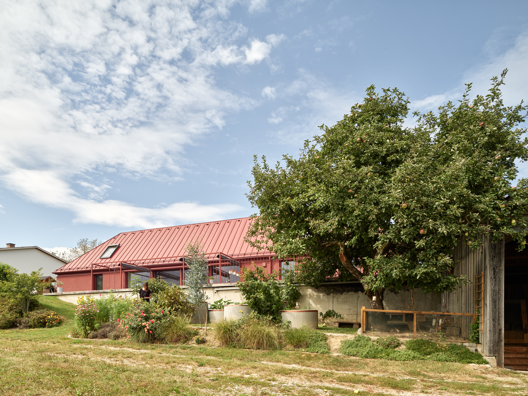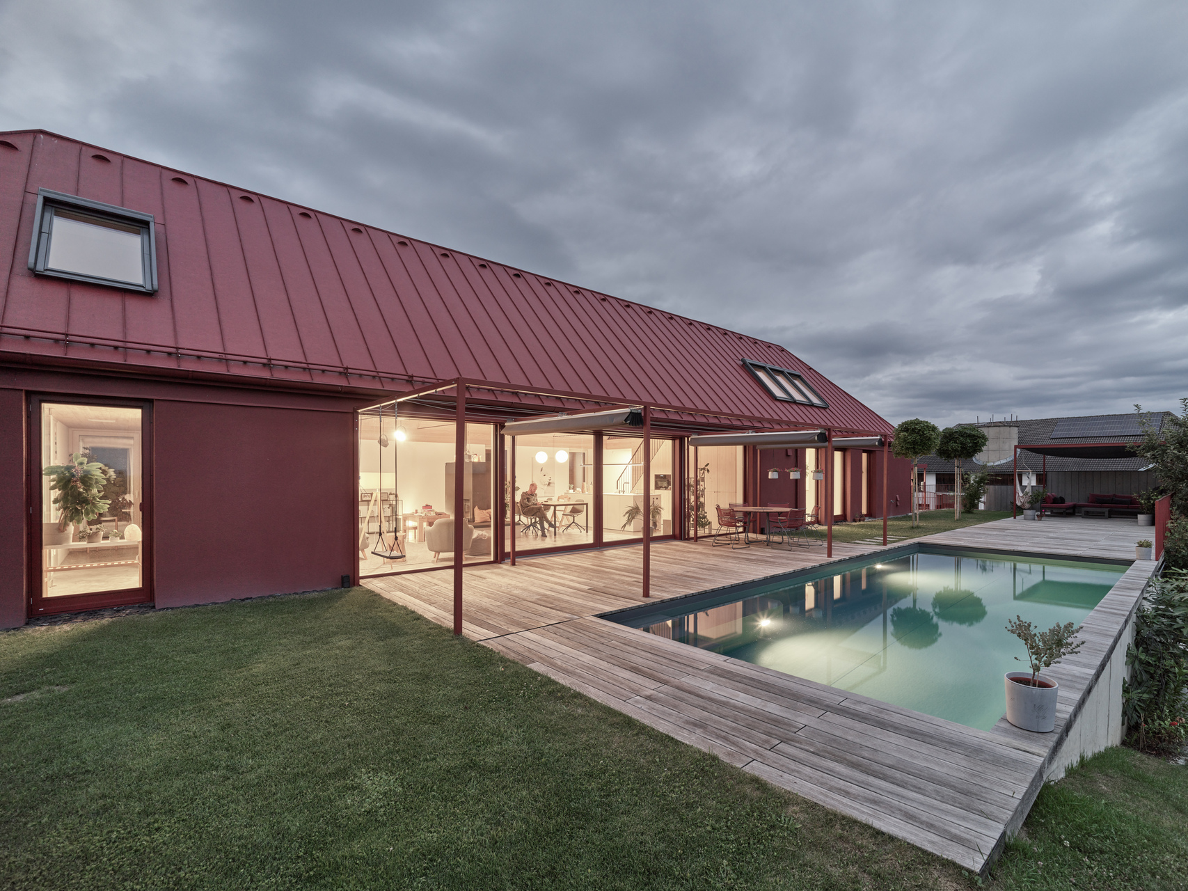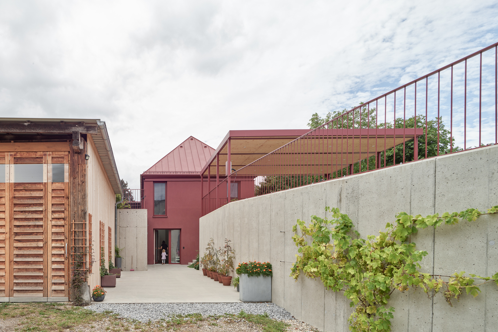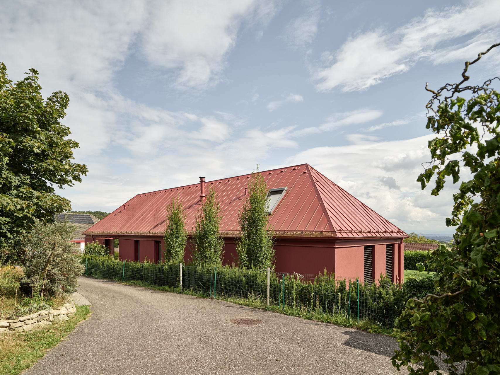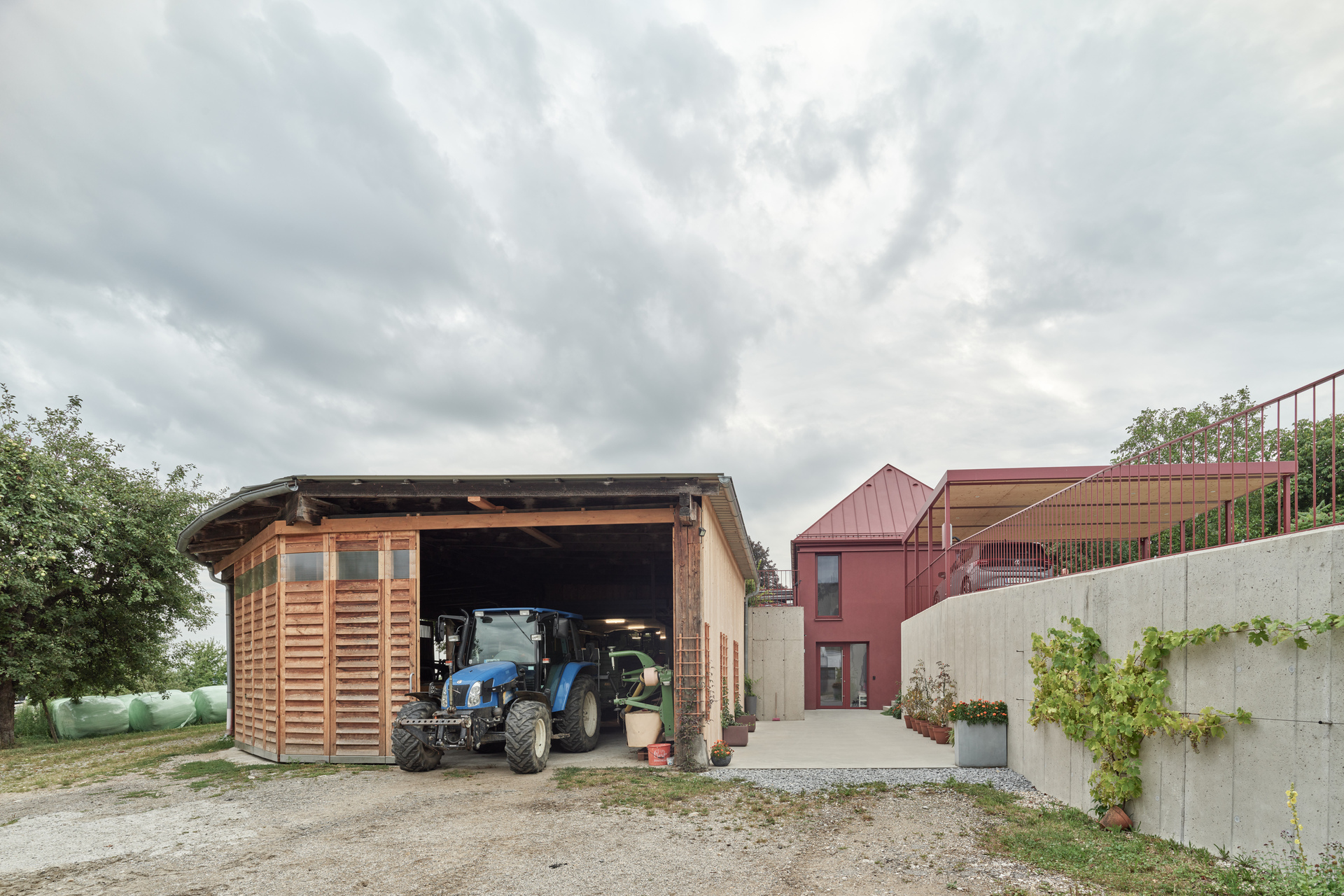 Das Haus fügt sich in die landwirtschaftlich geprägte Umgebung wie selbstverständlich ein. Der Langbau mit Walmdach zitiert in seiner architektonischen Formgebung die langen Hüften der traditionellen Bauernhäuser der Region. Die rote Farbe erinnert an die alten Ziegeldächer der Umgebung. Über die Dorfstraße erschlossen, führt parallel zum Haus eine Außentreppe vom Eingangsniveau zum Kellereingang, der somit direkt vom Niveau des elterlichen Hofes erreicht werden kann.
