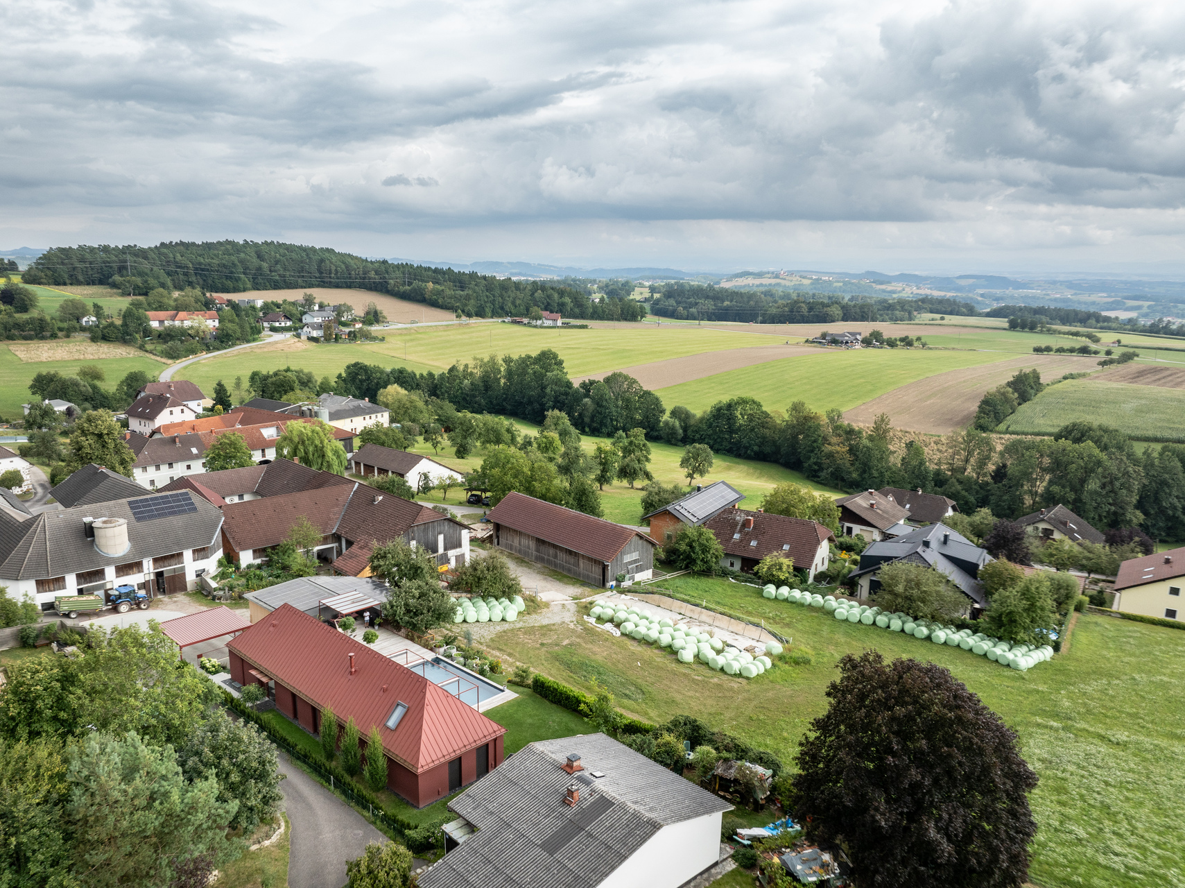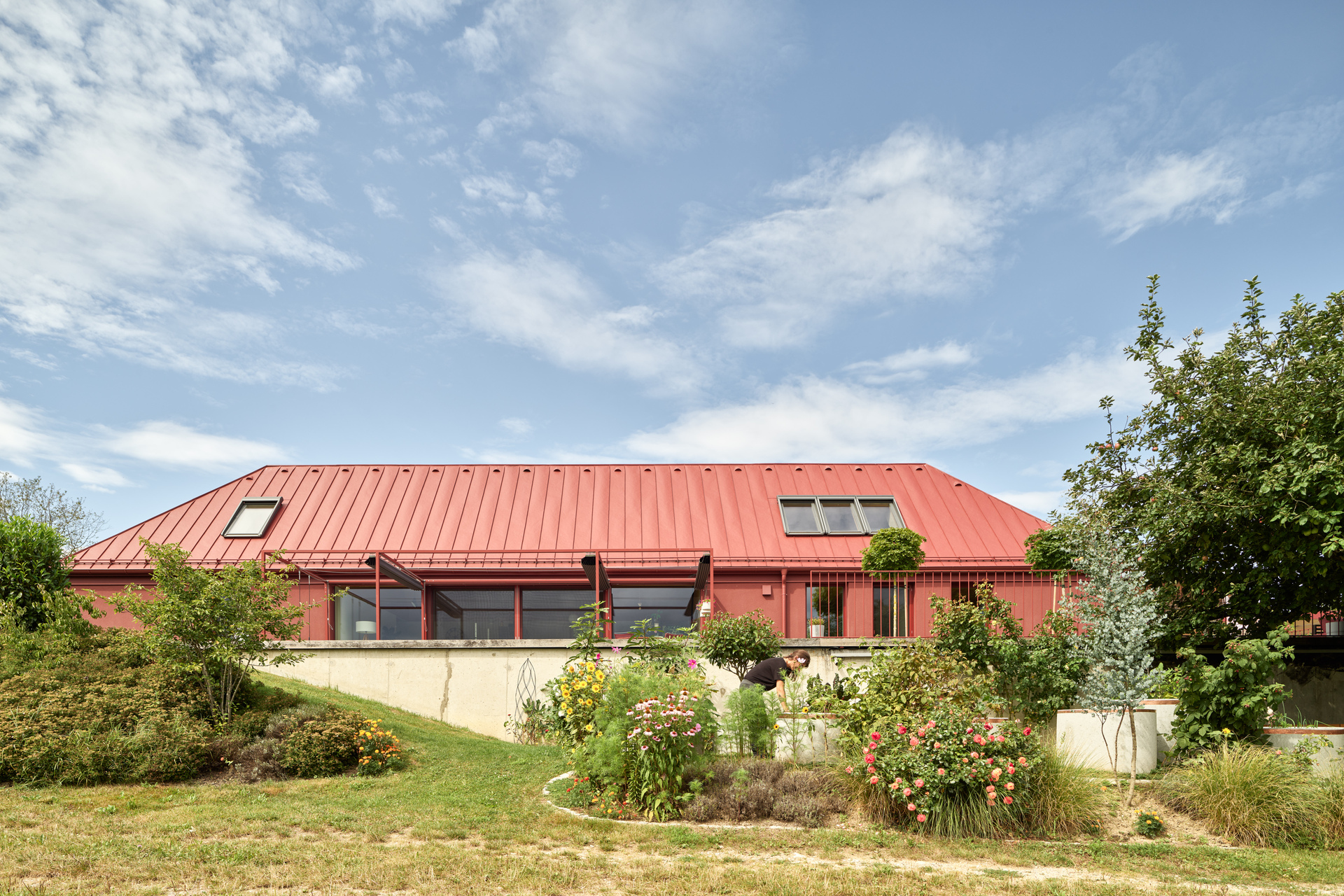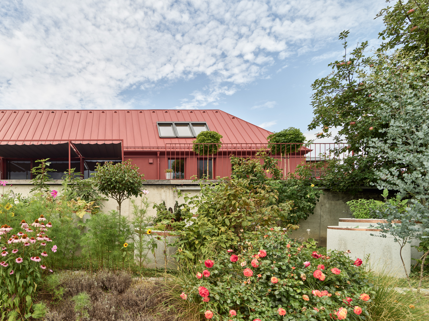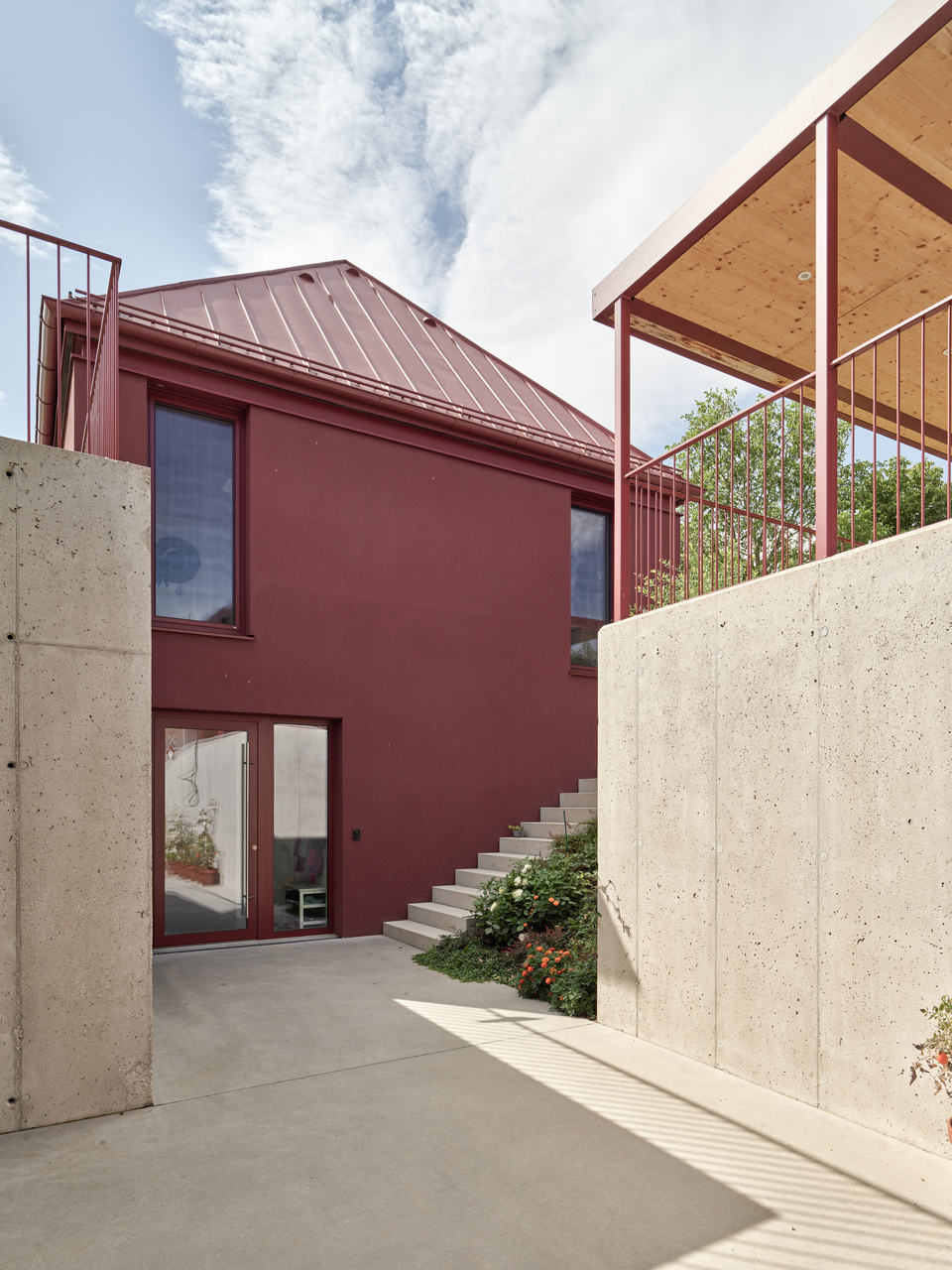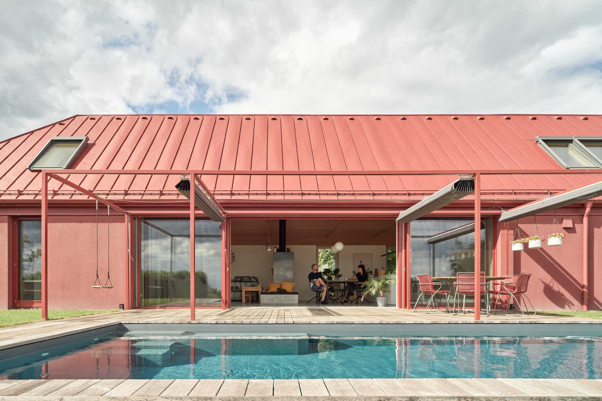 Das Haus fügt sich in die landwirtschaftlich geprägte Umgebung wie selbstverständlich ein. Der Langbau mit Walmdach zitiert in seiner architektonischen Formgebung die langen Hüften der traditionellen Bauernhäuser der Region. Die rote Farbe erinnert an die alten Ziegeldächer der Umgebung. Über die Dorfstraße erschlossen, führt parallel zum Haus eine Außentreppe vom Eingangsniveau zum Kellereingang, der somit direkt vom Niveau des elterlichen Hofes erreicht werden kann.