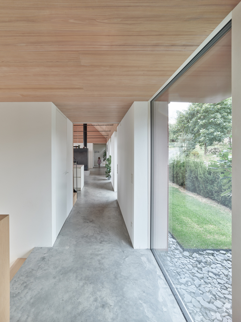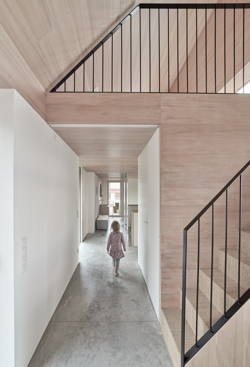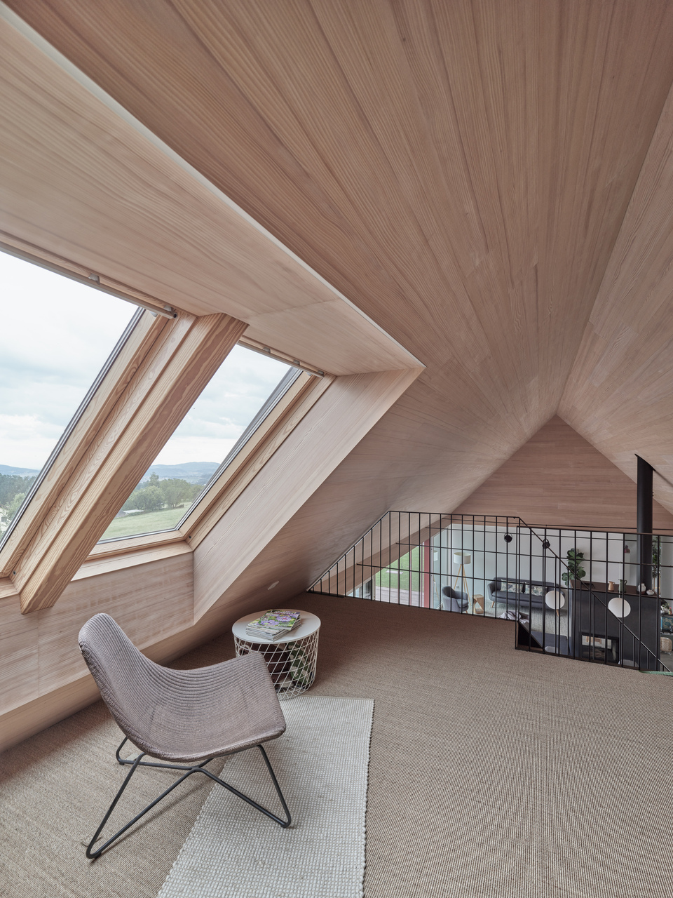 Der zentrale Wohnraum mit Küche und Essplatz öffnet sich in voller Höhe vom Erdgeschoss bis unters Dach. Ein großes Fenster zur Terrasse verbindet großzügig mit dem Außenraum und bietet freie Sicht über die sanfte Hügellandschaft des Mühlviertels. Die Schlafbereiche für die Eltern und jene für die Kinder sind an den beiden Enden des Hauses angeordnet. So ergeben sich für alle Familienmitglieder entsprechende Rückszugsmöglichkeiten. Die offenen Dachräume über den Schlafbereichen bieten sich als intime, räumliche Erweiterungen an – sei es als Galerie zum Wohnraum auf der einen oder als Schlafnischen für die Kinderzimmer auf der anderen Seite. (Text: Tobias Hagleitner, nach einem Text der Architekt:innen)