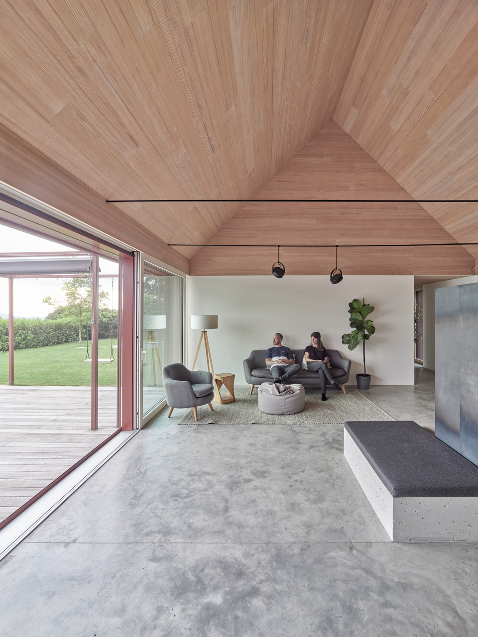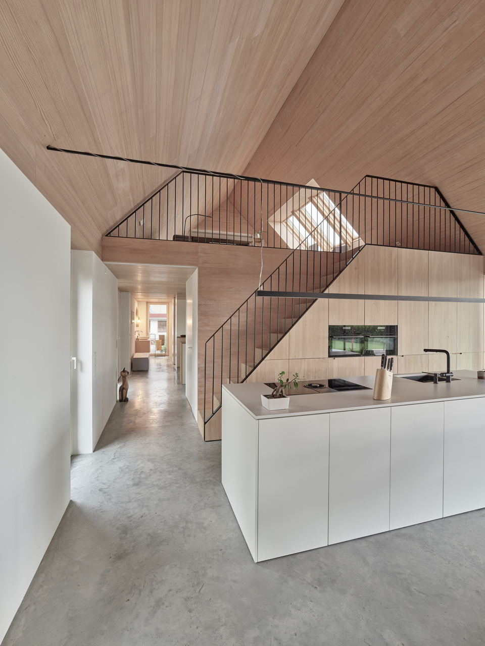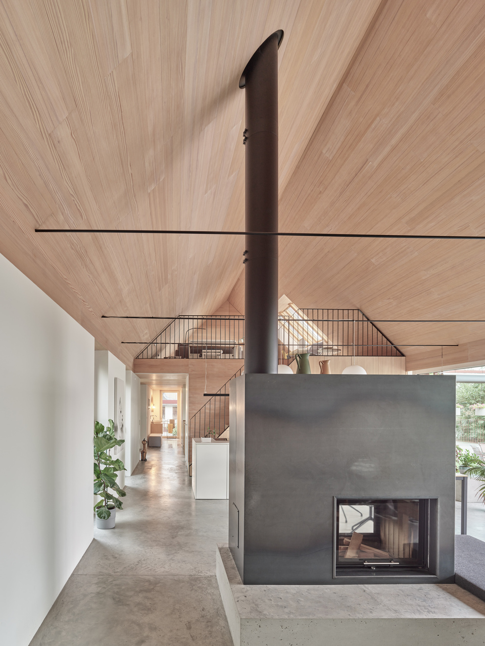 Der zentrale Wohnraum mit Küche und Essplatz öffnet sich in voller Höhe vom Erdgeschoss bis unters Dach. Ein großes Fenster zur Terrasse verbindet großzügig mit dem Außenraum und bietet freie Sicht über die sanfte Hügellandschaft des Mühlviertels. Die Schlafbereiche für die Eltern und jene für die Kinder sind an den beiden Enden des Hauses angeordnet. So ergeben sich für alle Familienmitglieder entsprechende Rückszugsmöglichkeiten. Die offenen Dachräume über den Schlafbereichen bieten sich als intime, räumliche Erweiterungen an – sei es als Galerie zum Wohnraum auf der einen oder als Schlafnischen für die Kinderzimmer auf der anderen Seite. (Text: Tobias Hagleitner, nach einem Text der Architekt:innen)