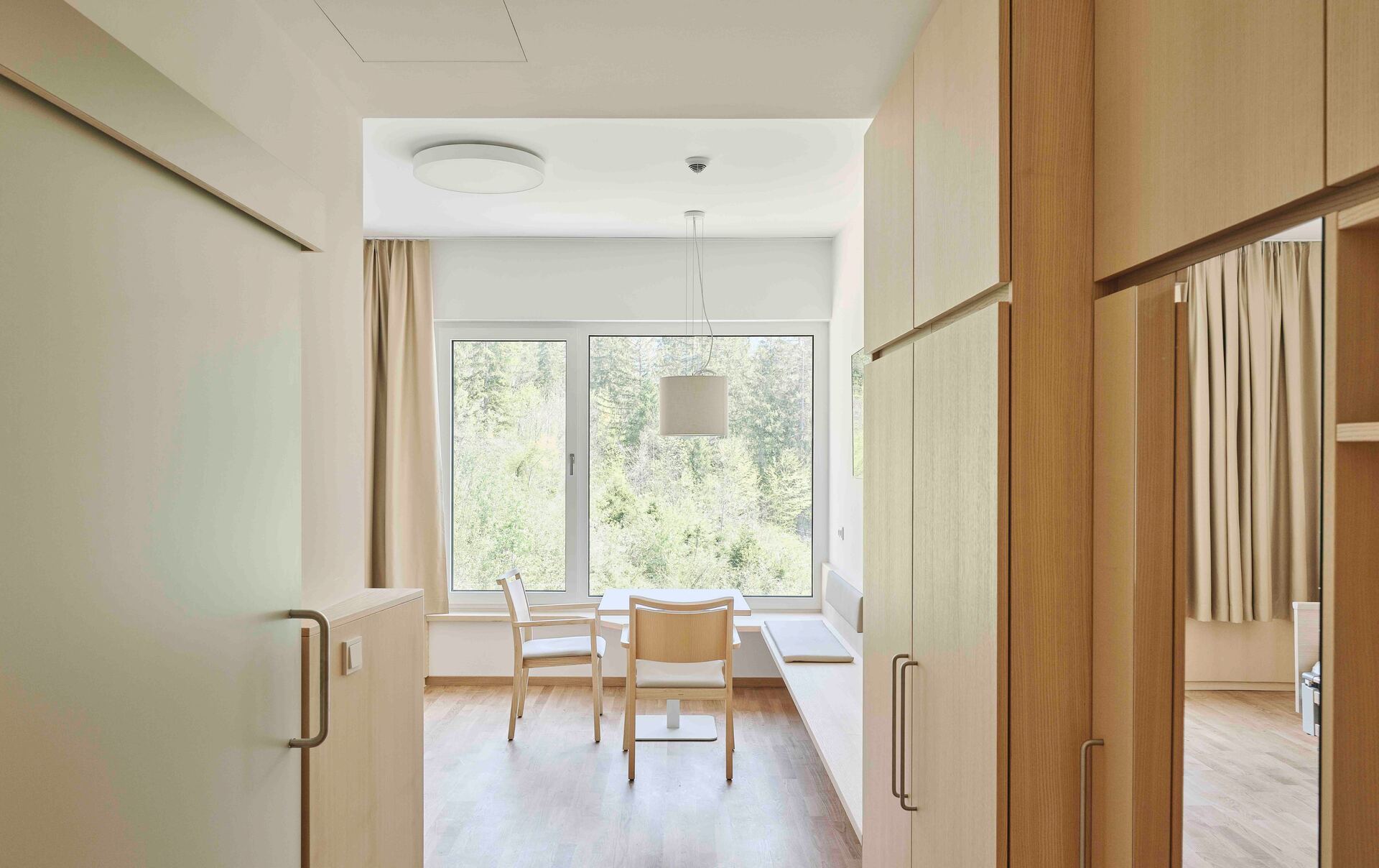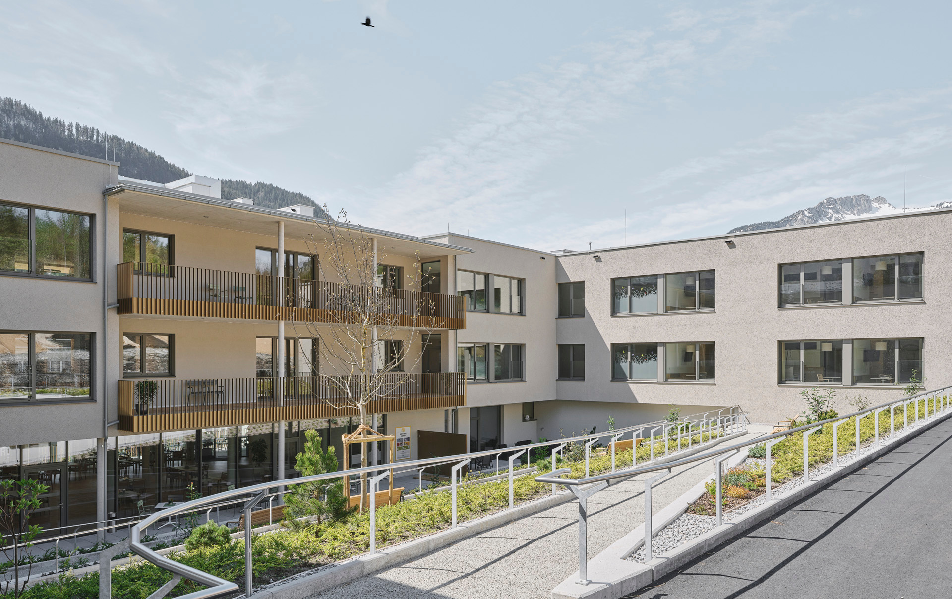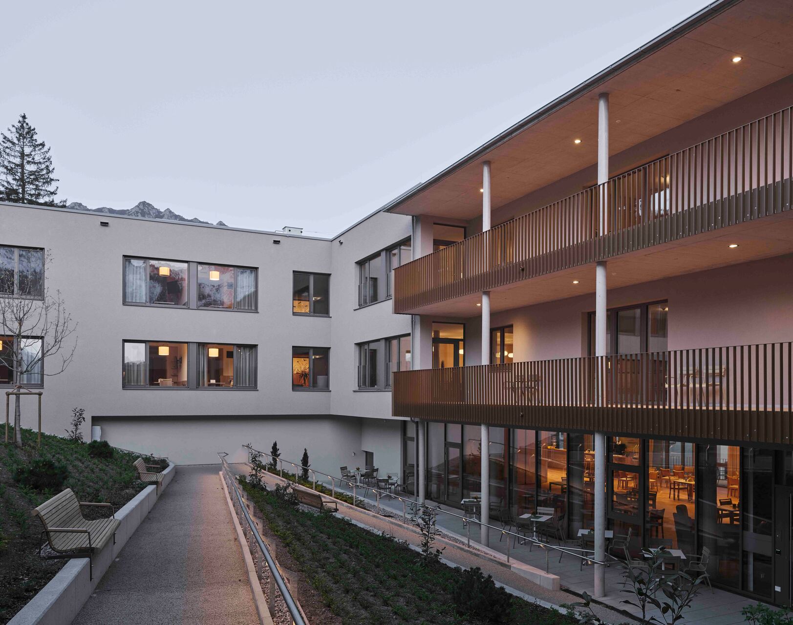 Das Potential dieser Nähe zum Naturraum für die Bewohner:innen möglichst gut zu nutzen, ist zentraler Entwurfsansatz des siegreichen Projektes von Manfred Gsottbauer. Er platziert auf dem Baugrund einen U-förmigen Baukörper, der gegenüber dem Erschließungsniveau so weit angehoben wurde, dass eine direkte, barrierefreie Anbindung der Aufenthaltsbereiche des Heimes an den weitgehend naturbelassenen Grünraum möglich wurde. Gleichzeitig konnten dadurch die Erdbewegungsarbeiten im felsigen Untergrund gering gehalten werden. Der Haupteingang liegt auf der Platzebene, direkt gegenüber dem Eingang des bestehenden Heimes, an das die Erweiterung im Untergeschoß über einen witterungsgeschützten Verbindungsgang angebunden ist. Ein Lift und eine Treppe führen hinauf in das erste Obergeschoß, in dem sich alle öffentlichen Bereiche wie ein Mehrzweckraum und ein Café mit vorgelagerter Südterrasse befinden. Wesentlicher Bestandteil des Wettbewerbsprojektes war eine auf dieser Ebene konzipierte Verbindungsbrücke zwischen den alten und neuen Bauteilen des Wohn- und Pflegeheims, die jedoch aus Kostengründen bisher nicht realisiert werden konnte.
