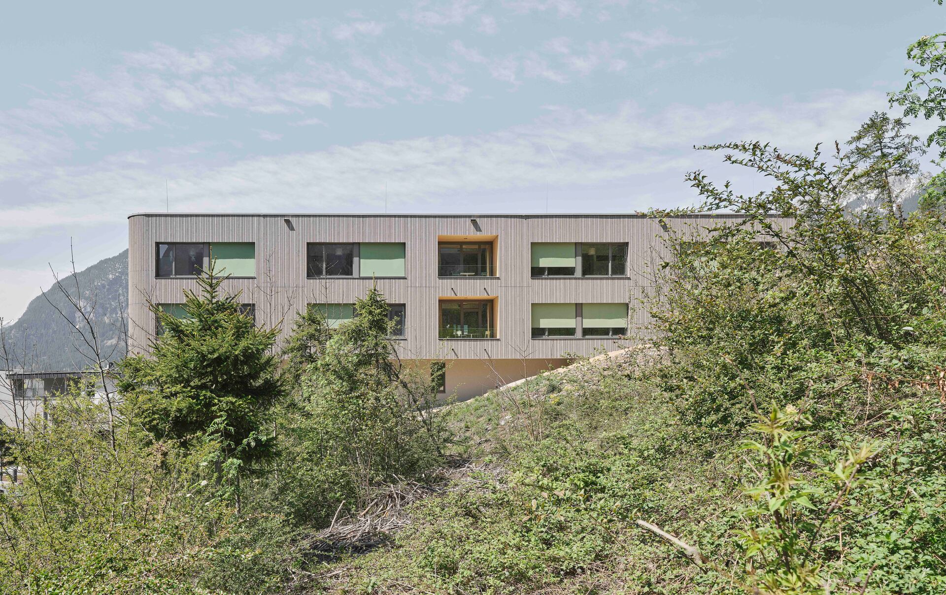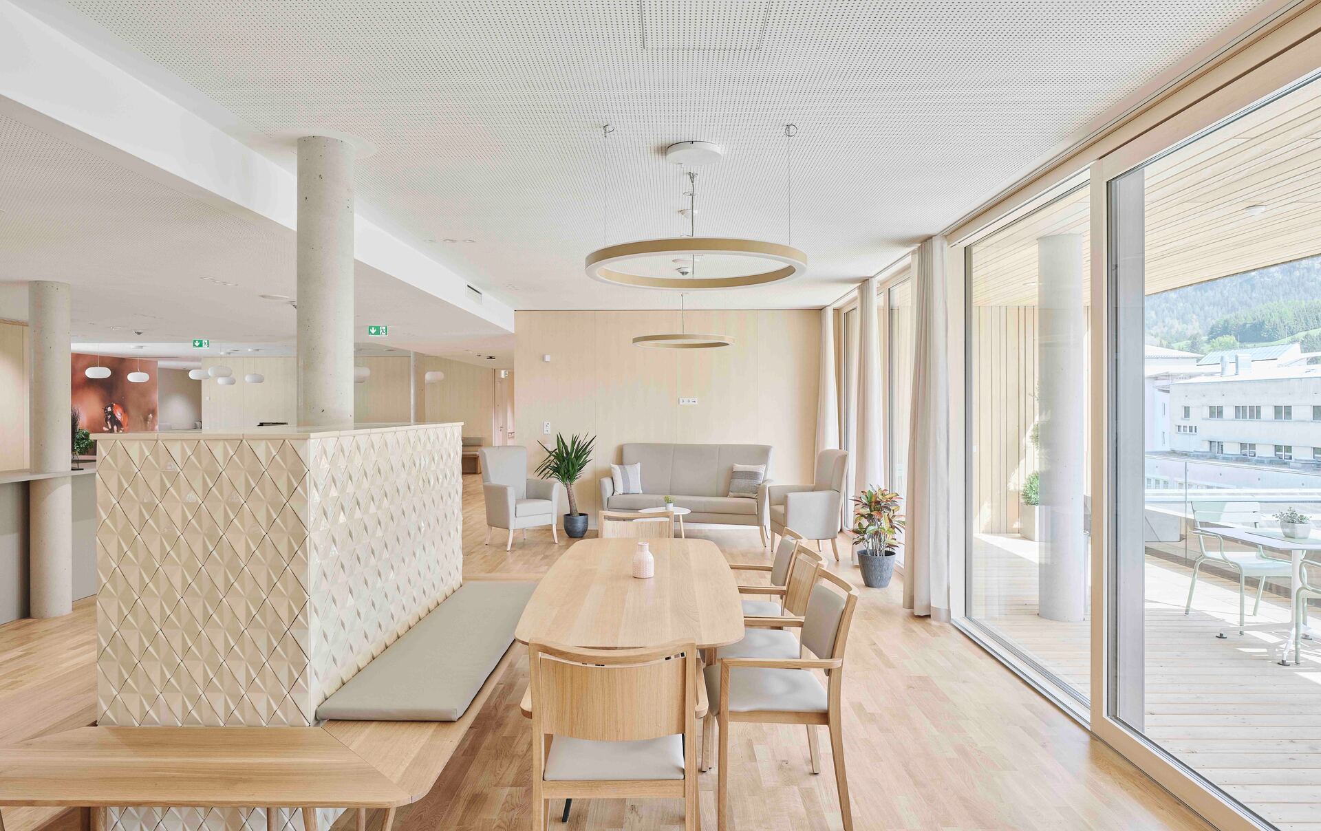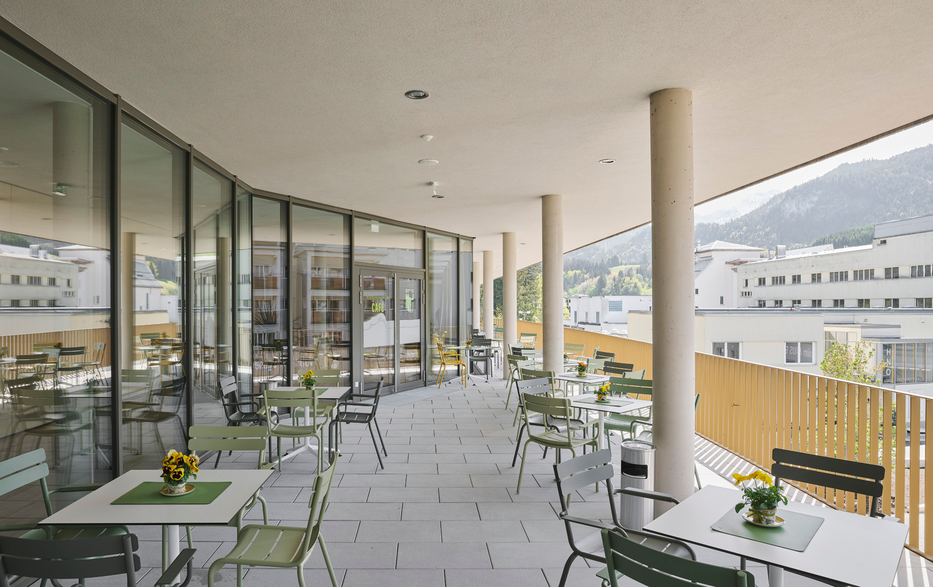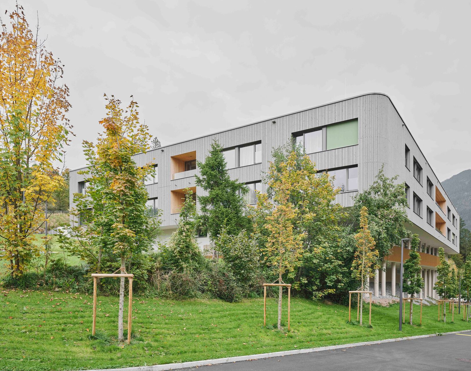 Das Potential dieser Nähe zum Naturraum für die Bewohner:innen möglichst gut zu nutzen, ist zentraler Entwurfsansatz des siegreichen Projektes von Manfred Gsottbauer. Er platziert auf dem Baugrund einen U-förmigen Baukörper, der gegenüber dem Erschließungsniveau so weit angehoben wurde, dass eine direkte, barrierefreie Anbindung der Aufenthaltsbereiche des Heimes an den weitgehend naturbelassenen Grünraum möglich wurde. Gleichzeitig konnten dadurch die Erdbewegungsarbeiten im felsigen Untergrund gering gehalten werden. Der Haupteingang liegt auf der Platzebene, direkt gegenüber dem Eingang des bestehenden Heimes, an das die Erweiterung im Untergeschoß über einen witterungsgeschützten Verbindungsgang angebunden ist. Ein Lift und eine Treppe führen hinauf in das erste Obergeschoß, in dem sich alle öffentlichen Bereiche wie ein Mehrzweckraum und ein Café mit vorgelagerter Südterrasse befinden. Wesentlicher Bestandteil des Wettbewerbsprojektes war eine auf dieser Ebene konzipierte Verbindungsbrücke zwischen den alten und neuen Bauteilen des Wohn- und Pflegeheims, die jedoch aus Kostengründen bisher nicht realisiert werden konnte.