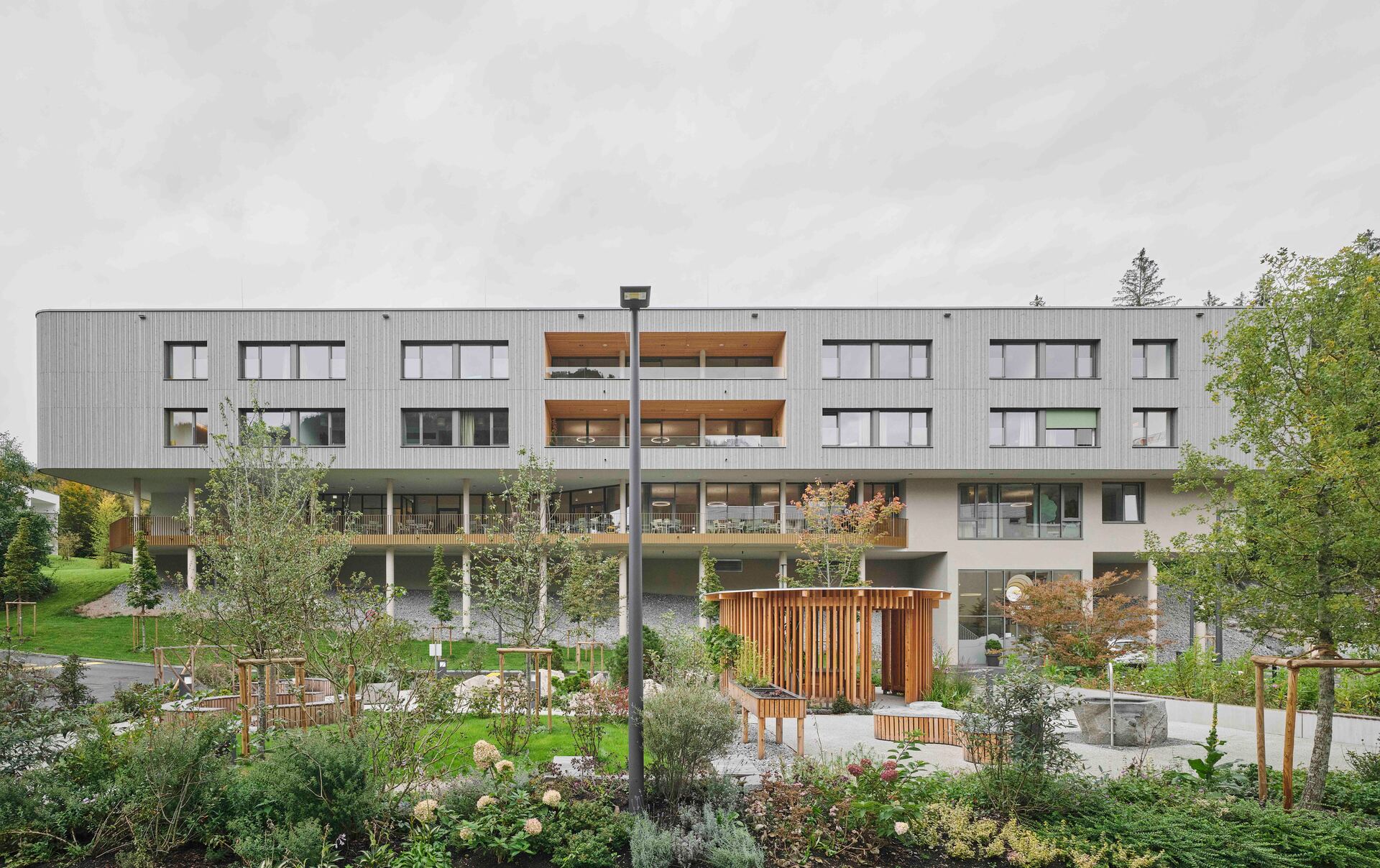Im Zuge der Erweiterung wurde auch die früher als Parkplatz genutzte Fläche hinter Krankenhaus und Heim zu einem von allen Einrichtungen gemeinsam nutzbaren Garten umgestaltet. Mit Bäumen, Beeten, Sitzmöglichkeiten und einem kleinen Pavillon erhielten hier Bewohner:innen und Personal hier einen hochwertigen Aufenthaltsbereich. Der Erweiterungsbau umschließt zudem hangseitig einen intimeren Innenhof, wo rollstuhltaugliche Rampen hinauf in den Naturraum und weiter zum Rundwanderweg um den Sintwag führen. (Text: Claudia Wedekind)