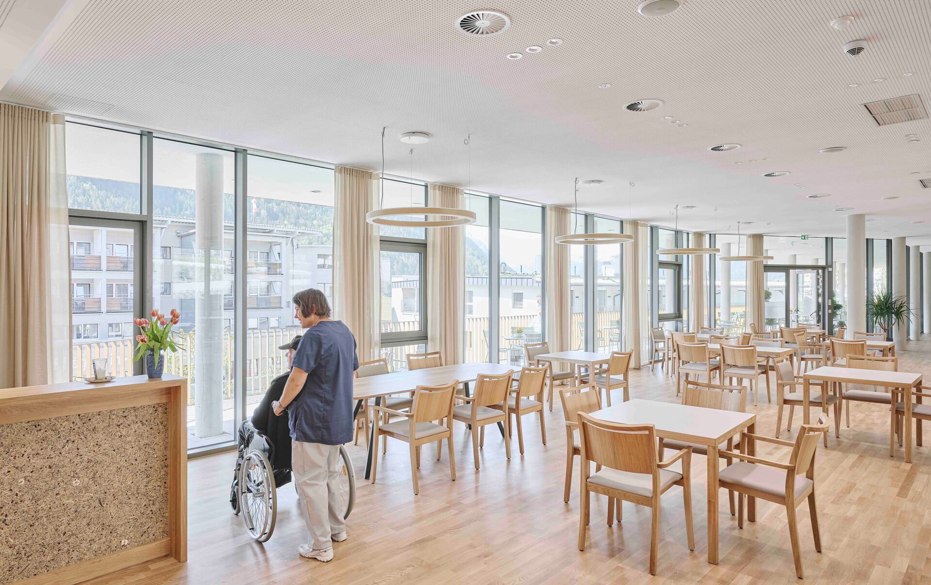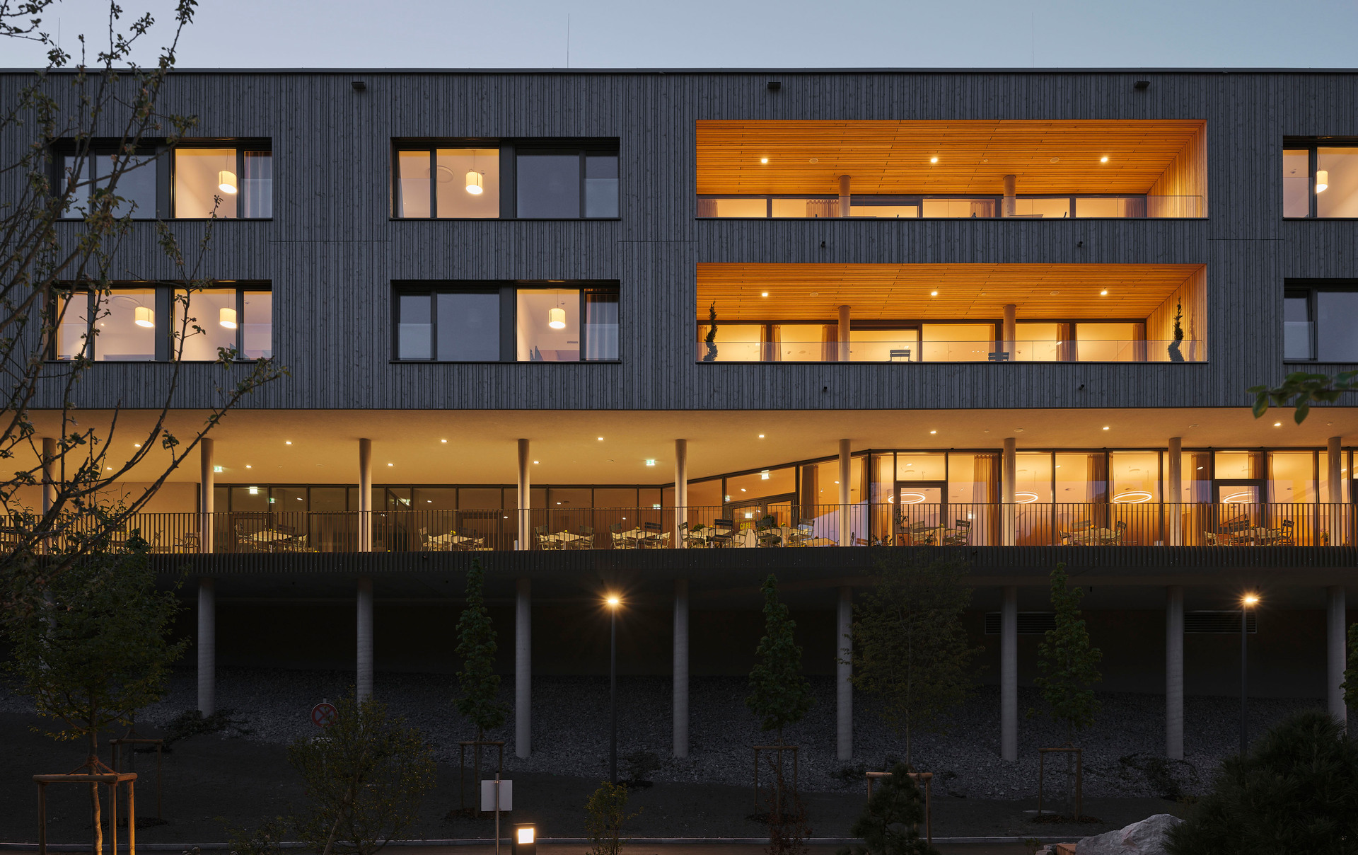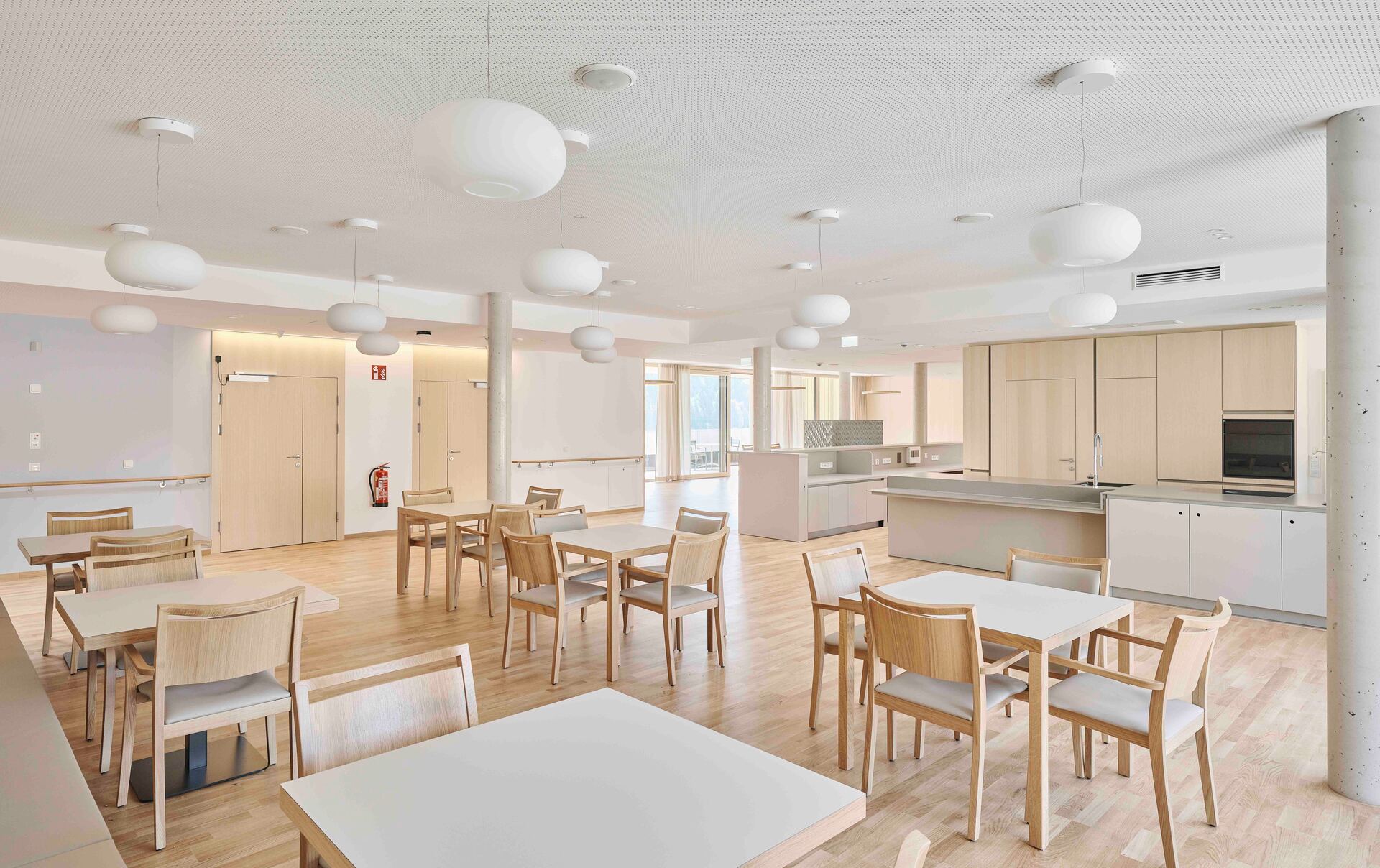 Über dieser teilweise in den Hang eingegrabenen Ebene liegen rund um auskragend zwei Pflegegeschoße, die sich durch ihre Holzfassade deutlich vom aufgeständerten Sockel abheben. Klar und übersichtlich organisiert befinden sich hier vier Wohngruppen mit insgesamt 62 Betten. Das Zentrum jedes Geschoßes bilden die Pflegestützpunkte mit einem gemeinsamen Besprechungsraum für das Personal und direktem Zugang zu den Terrassen im Norden. Flankiert wird dieses Zentrum von den gemeinsamen Wohn- und Essbereichen, denen im Süden eine weitere Terrasse zugeordnet ist. Die Zimmer für die Bewohner:innen liegen größtenteils in den Ost-West-orientierten Flügeln, auch hier gibt es mit kleinen Loggien weitere Aufenthaltsmöglichkeiten im Freien. Von den Pflegestützpunkten aus können alle Aufenthaltsbereiche der beiden Wohngruppen überblickt werden, was insbesondere in den Nachtstunden die Betreuung durch eine einzelne Pflegekraft gewährleistet. Die hellen und räumlich differenziert gestalteten Aufenthalts- und Bewegungszonen haben alle Blickbezüge ins Freie und sind so organisiert, dass auch Rundgänge möglich sind.
