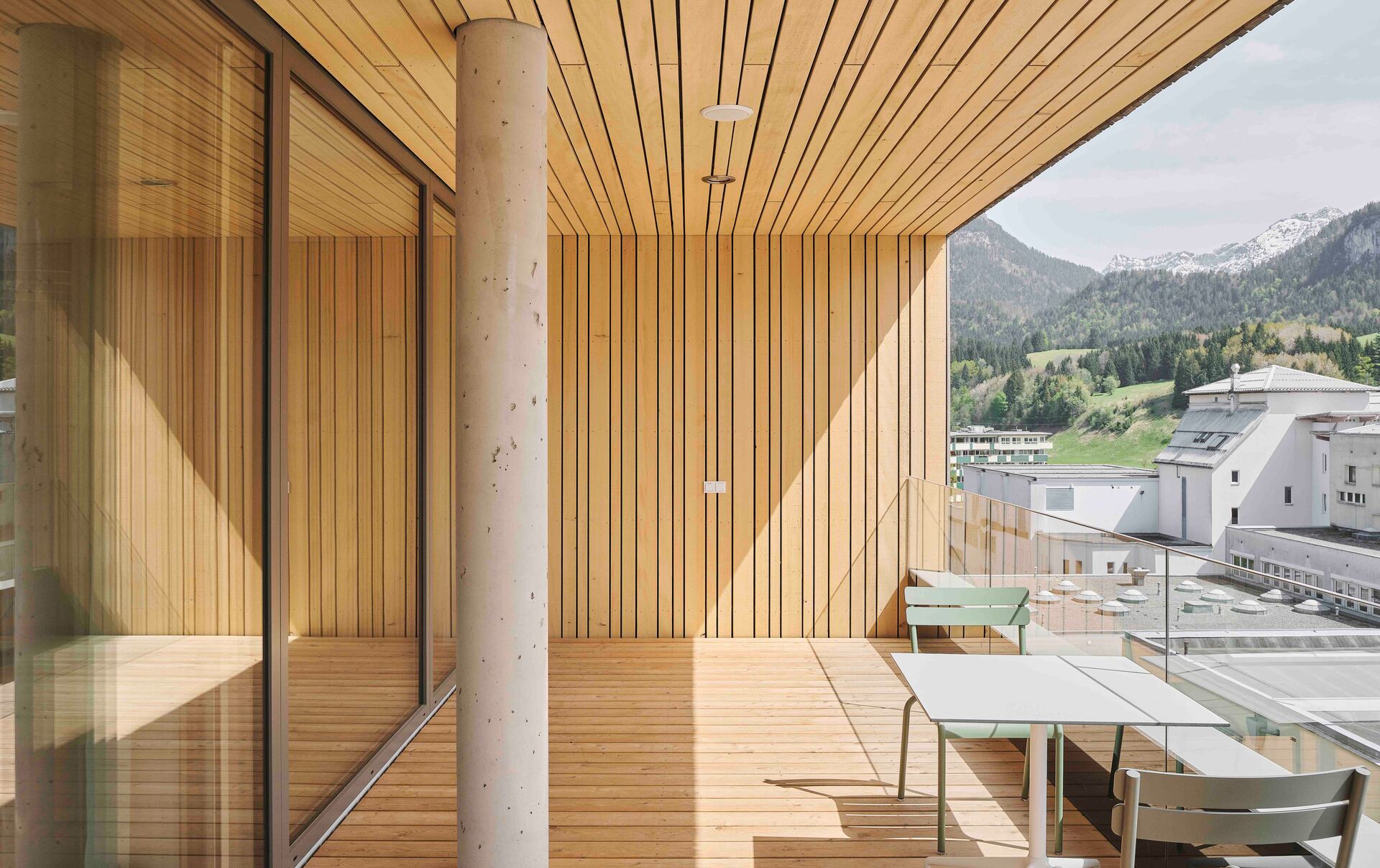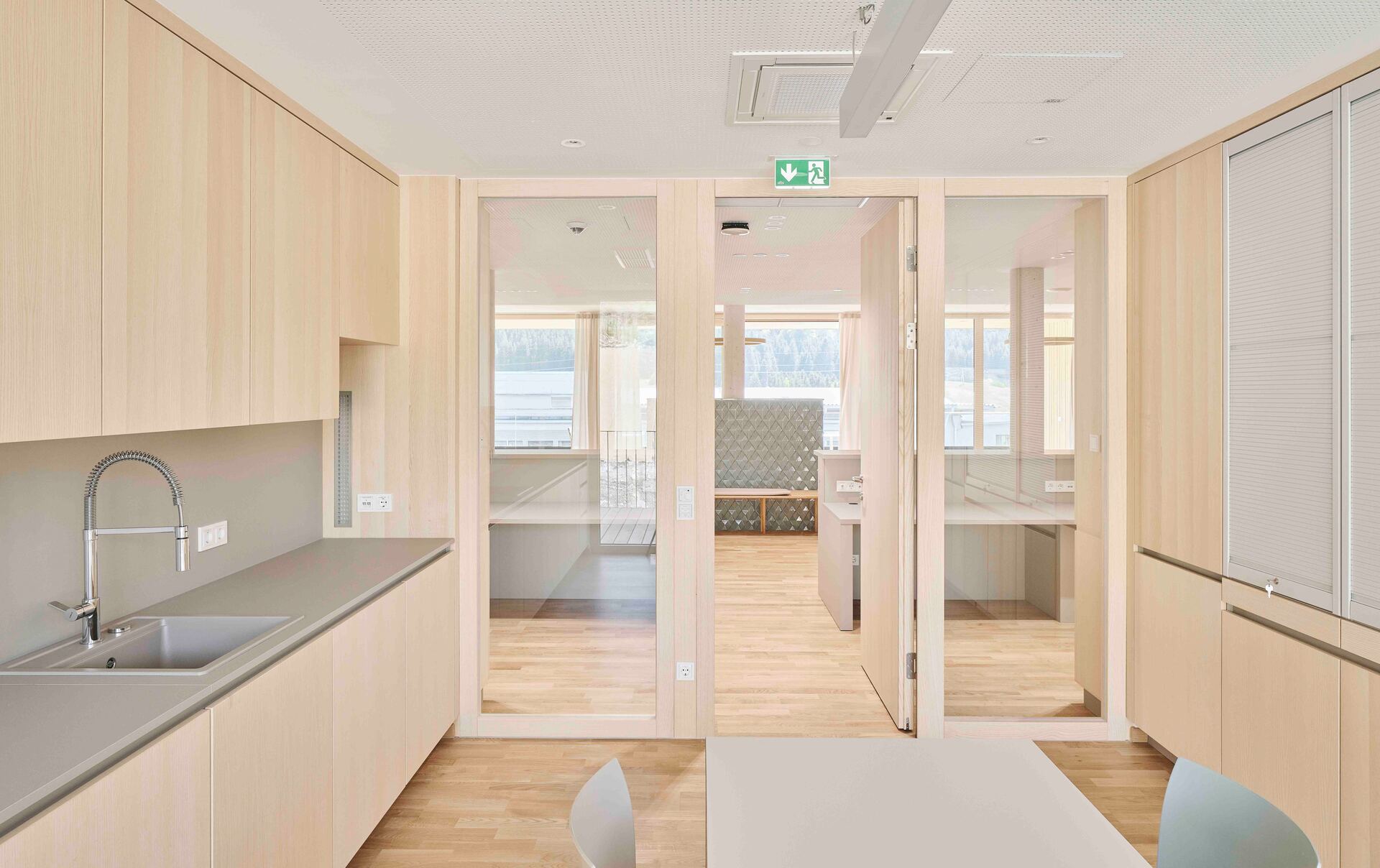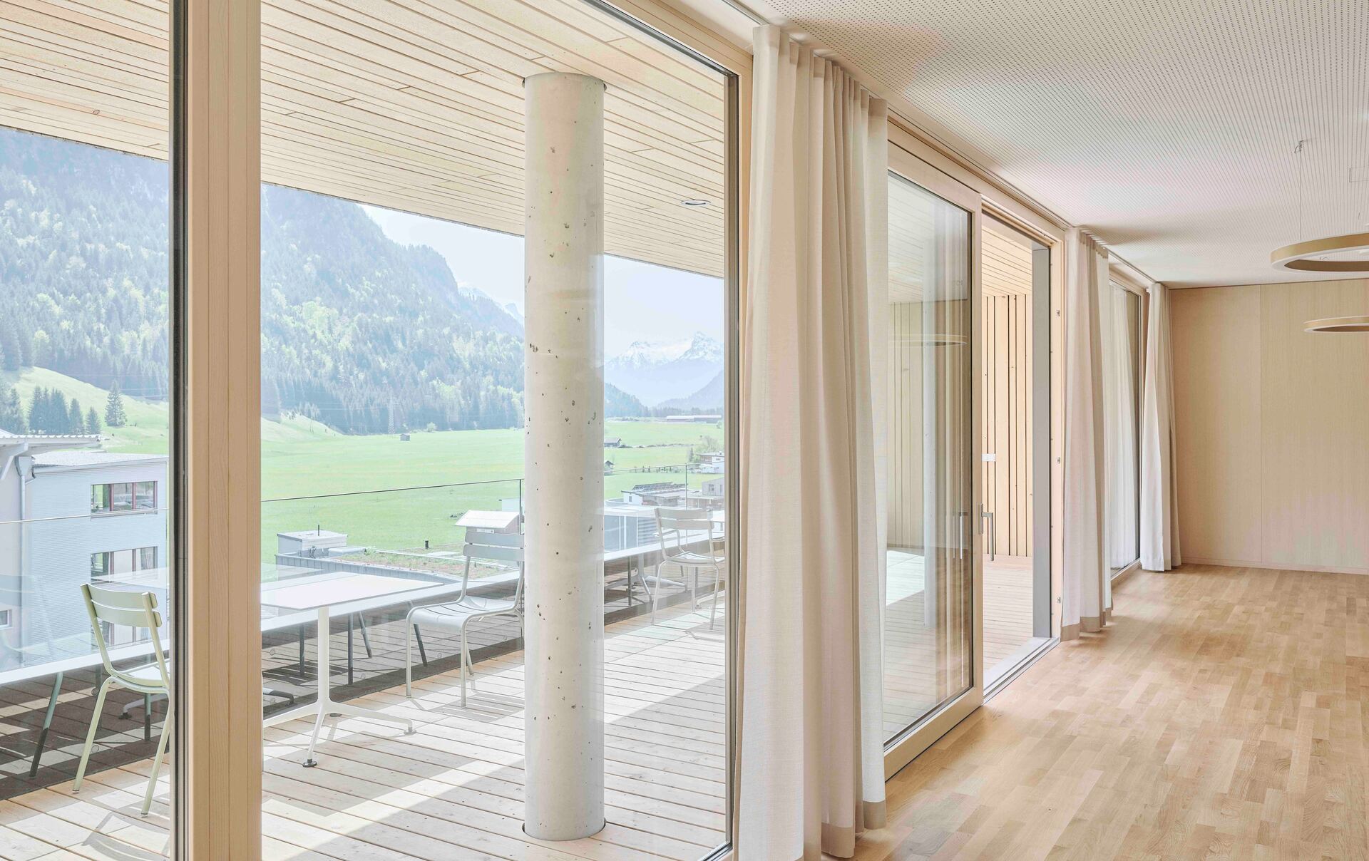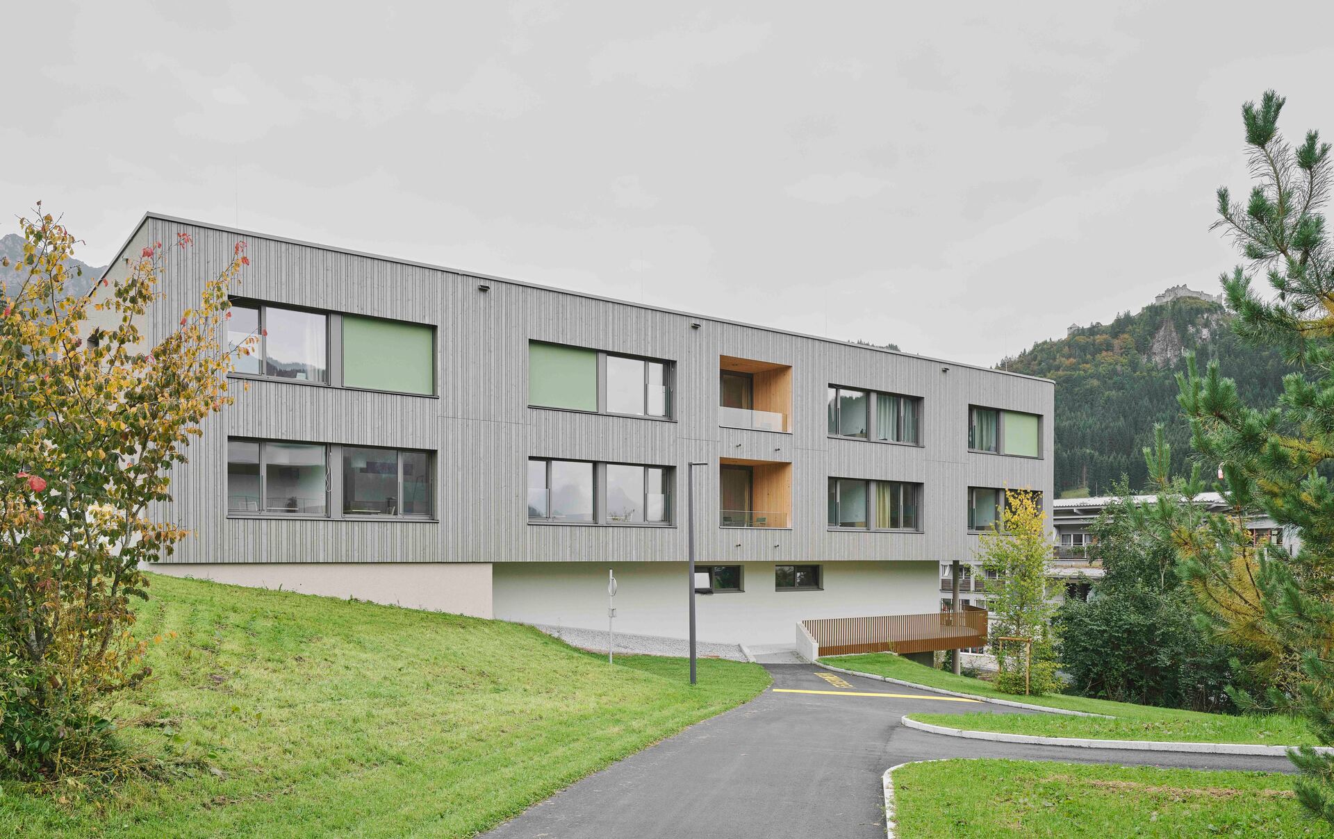 Über dieser teilweise in den Hang eingegrabenen Ebene liegen rund um auskragend zwei Pflegegeschoße, die sich durch ihre Holzfassade deutlich vom aufgeständerten Sockel abheben. Klar und übersichtlich organisiert befinden sich hier vier Wohngruppen mit insgesamt 62 Betten. Das Zentrum jedes Geschoßes bilden die Pflegestützpunkte mit einem gemeinsamen Besprechungsraum für das Personal und direktem Zugang zu den Terrassen im Norden. Flankiert wird dieses Zentrum von den gemeinsamen Wohn- und Essbereichen, denen im Süden eine weitere Terrasse zugeordnet ist. Die Zimmer für die Bewohner:innen liegen größtenteils in den Ost-West-orientierten Flügeln, auch hier gibt es mit kleinen Loggien weitere Aufenthaltsmöglichkeiten im Freien. Von den Pflegestützpunkten aus können alle Aufenthaltsbereiche der beiden Wohngruppen überblickt werden, was insbesondere in den Nachtstunden die Betreuung durch eine einzelne Pflegekraft gewährleistet. Die hellen und räumlich differenziert gestalteten Aufenthalts- und Bewegungszonen haben alle Blickbezüge ins Freie und sind so organisiert, dass auch Rundgänge möglich sind.
