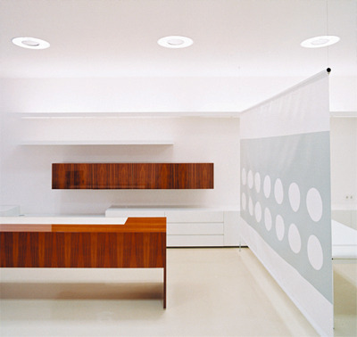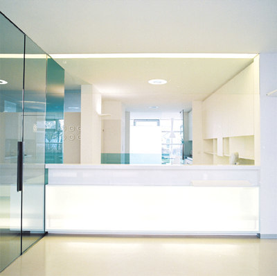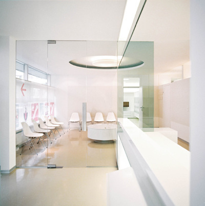 Von der Rezeption und dem Wartebereich, die strassenseitig liegen, sind alle Behandlungsräume hoforientiert und getrennt erschlossen. Im Wartebereich weist ein grosses rundes Leuchtobjekt den Raum als Sammelpunkt aus, ein durchgehendes Beleuchtungskonzept fasst die Raumfolge in subtil modulierten Tönen. (Text: Gabriele Kaiser)