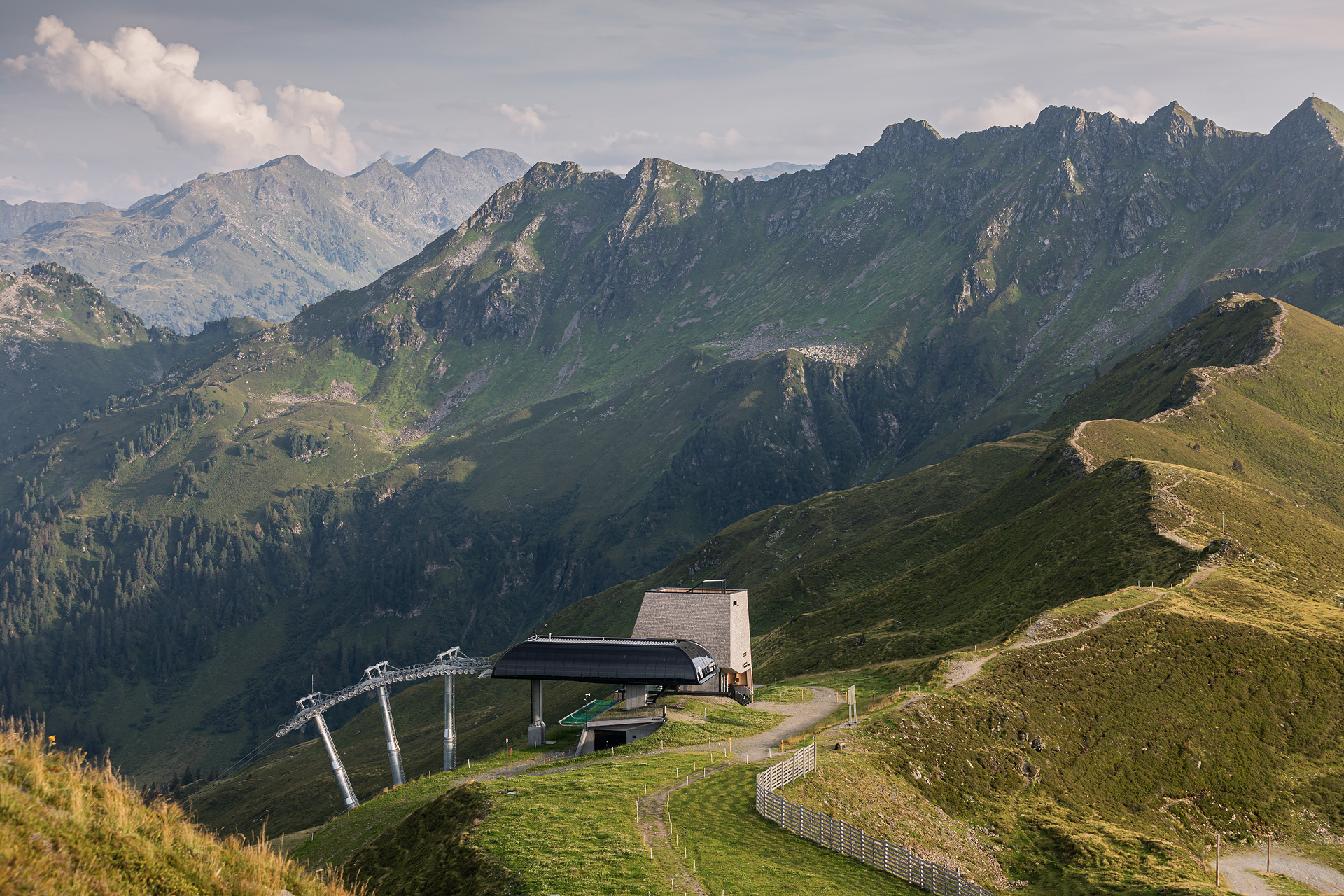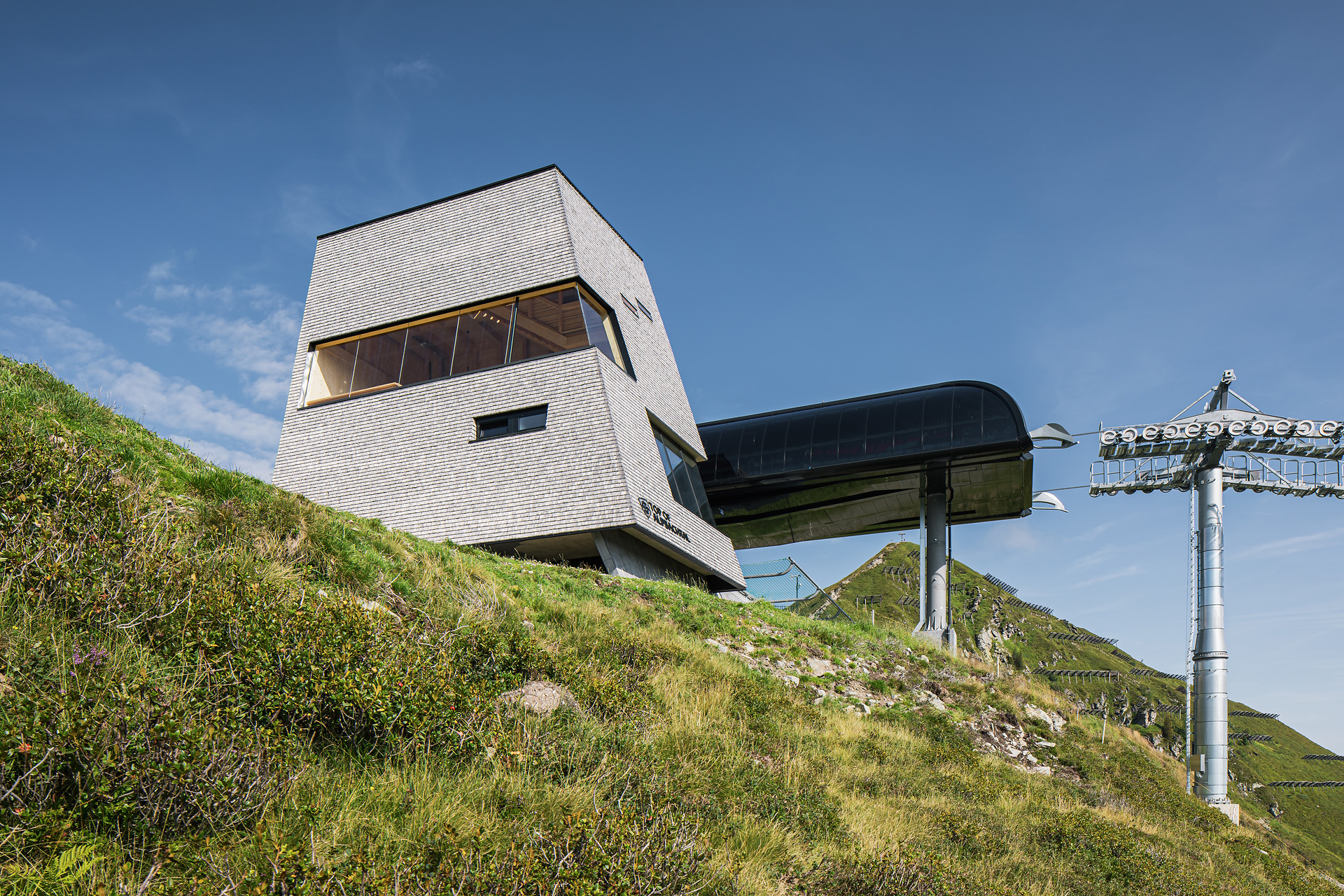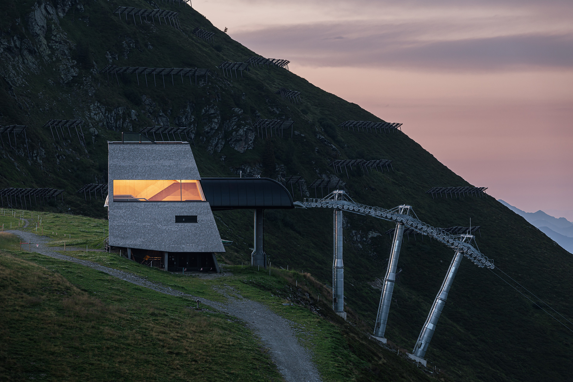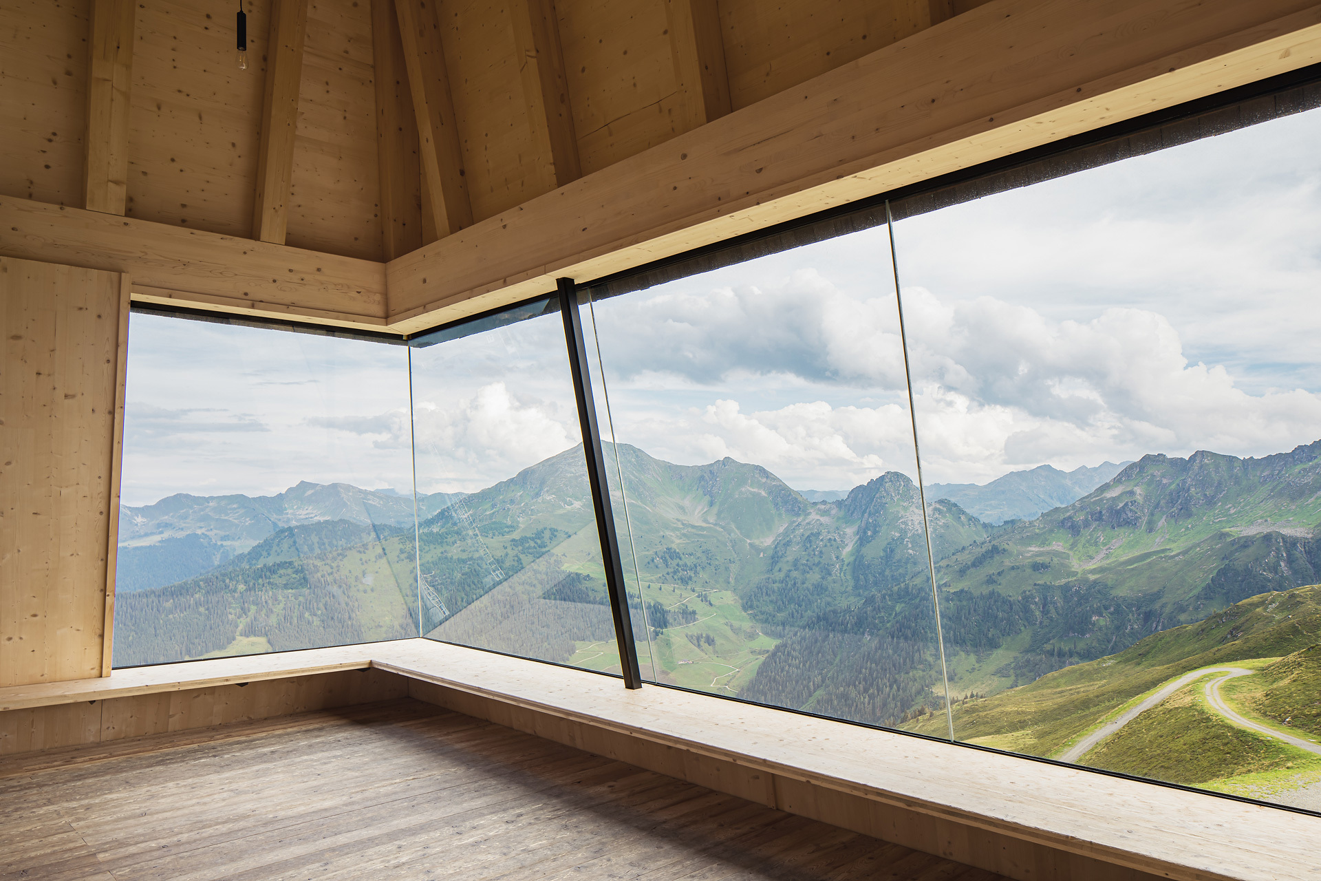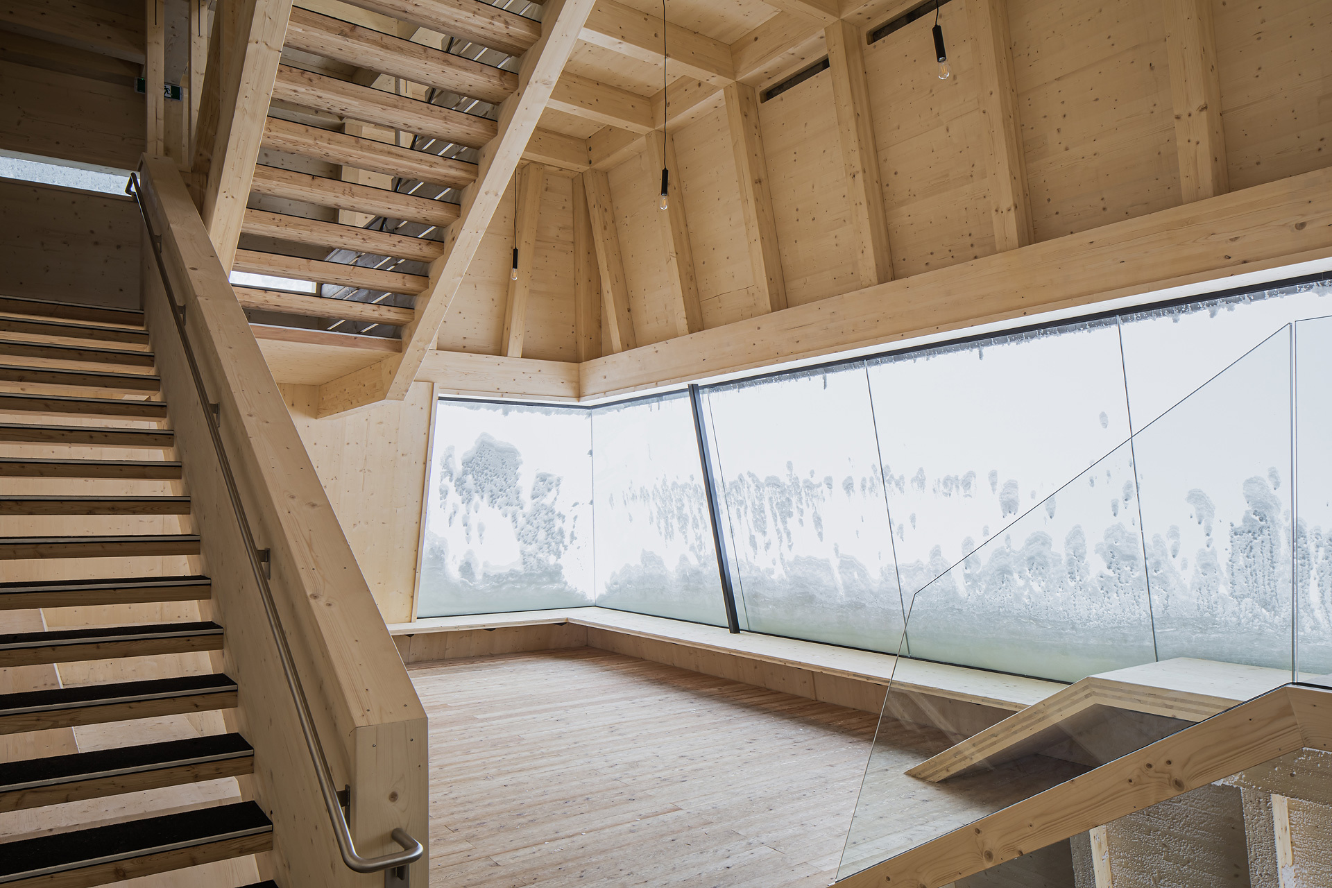 Für Besucherinnen und Besucher soll er ein besonderes Erlebnis auf 2030 Metern bieten. Nicht nur weil er Rundumblicke auf das umliegende Bergpanorama ermöglicht, sondern auch weil ein Panoramaraum für alle zur Verfügung steht. Vorbei am Lift-Kontrollraum, der sich im Betonsockel des Holzbaus befindet, gelangen Besucherinnen und Besucher in einen öffentlich zugänglichen Aufenthaltsraum. Traditionelle Tiroler Bauernstuben inspirierten zur Gestaltung dieses Panoramaraums. Der untere Bereich des zweigeschossigen Raums ist mit einer Wandverkleidung aus Holz versehen und nimmt so Bezug auf traditionelle Stuben. Im oberen Teil dagegen ist die offene Konstruktion des „Dachstuhls“ sichtbar – eine Reminiszenz an das landwirtschaftliche Bauen in der Region.